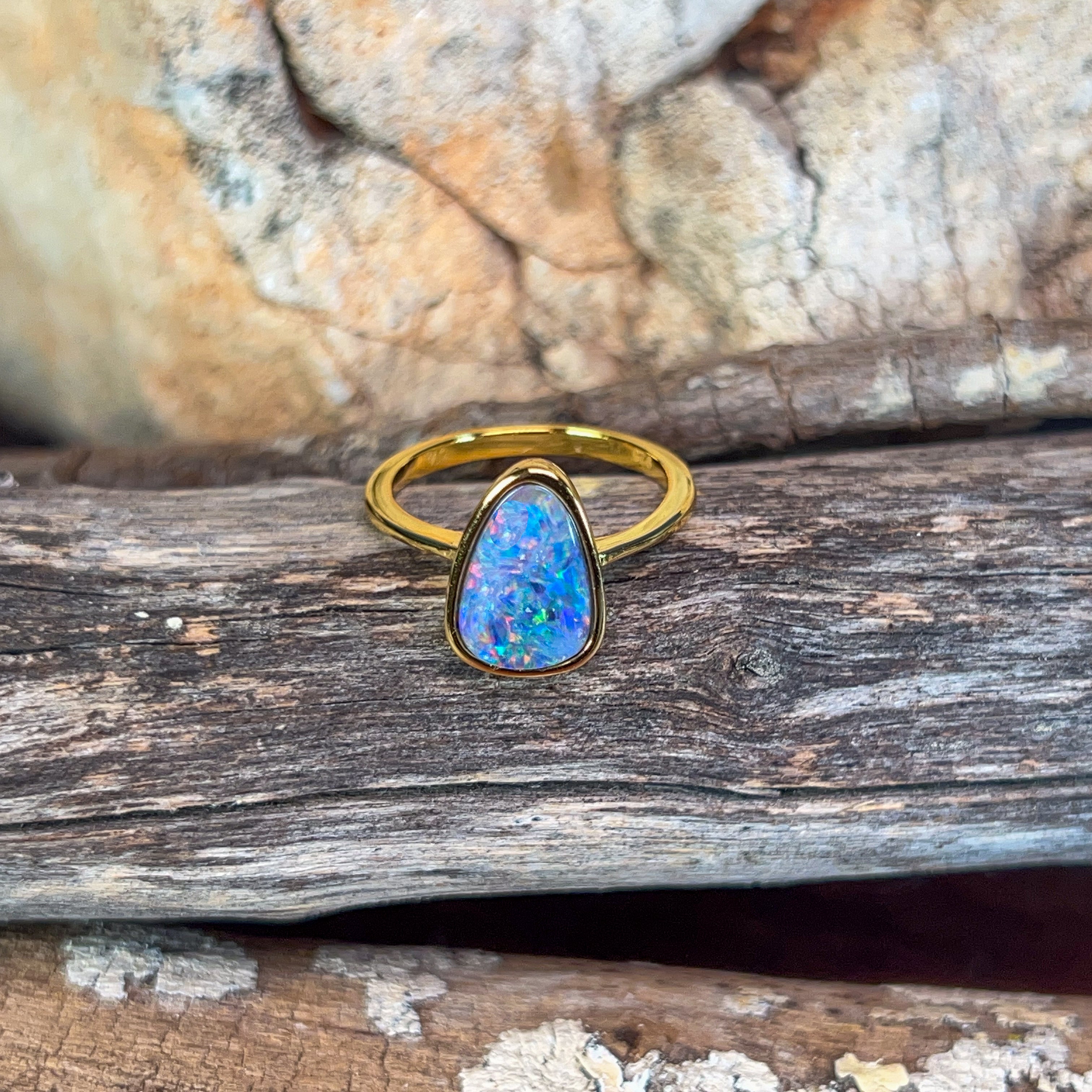 Elevate your everyday elegance with this stunning opal doublet ring, where timeless sophistication meets modern design. Featuring a captivating 12x9mm opal stone layered with precious metals, this piece showcases the mesmerising play of colour that makes opals truly unforgettable. The gold plating over silver creates a luxurious finish that complements any skin tone, while the doublet construction ensures durability and lasting brilliance. Perfect for those who appreciate fine jewellery with genuine character, this ring makes an exceptional statement piece or a meaningful gift for someone special.
