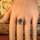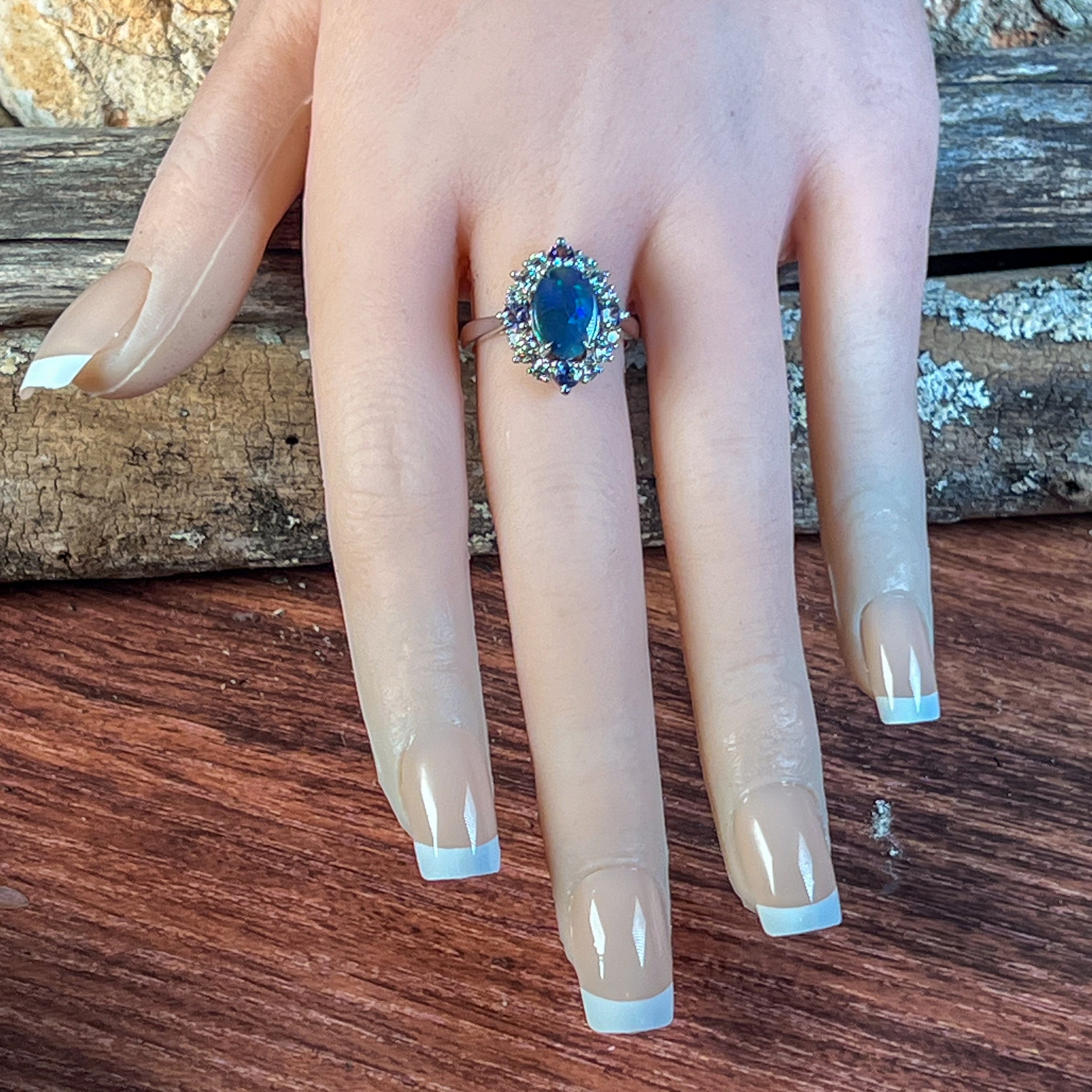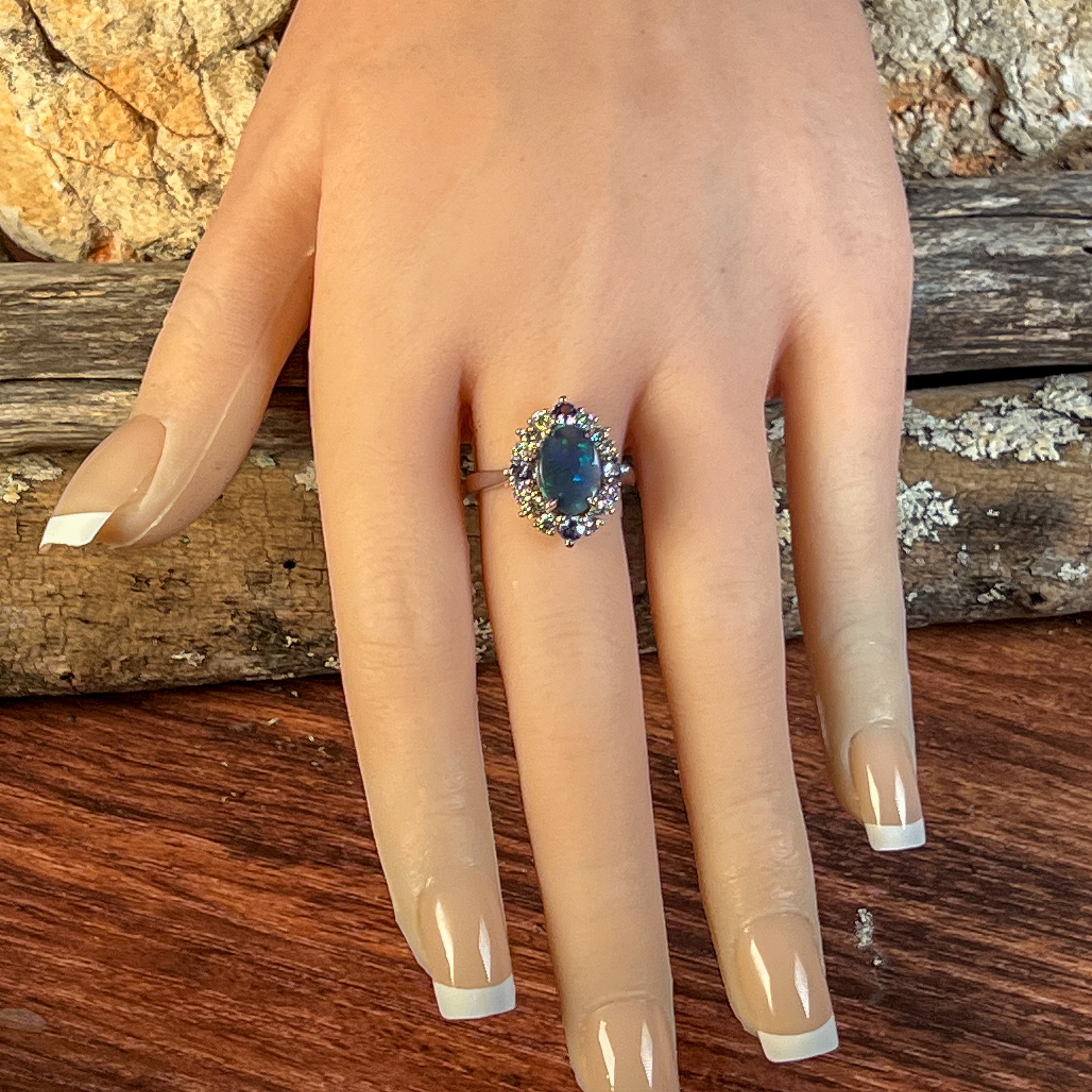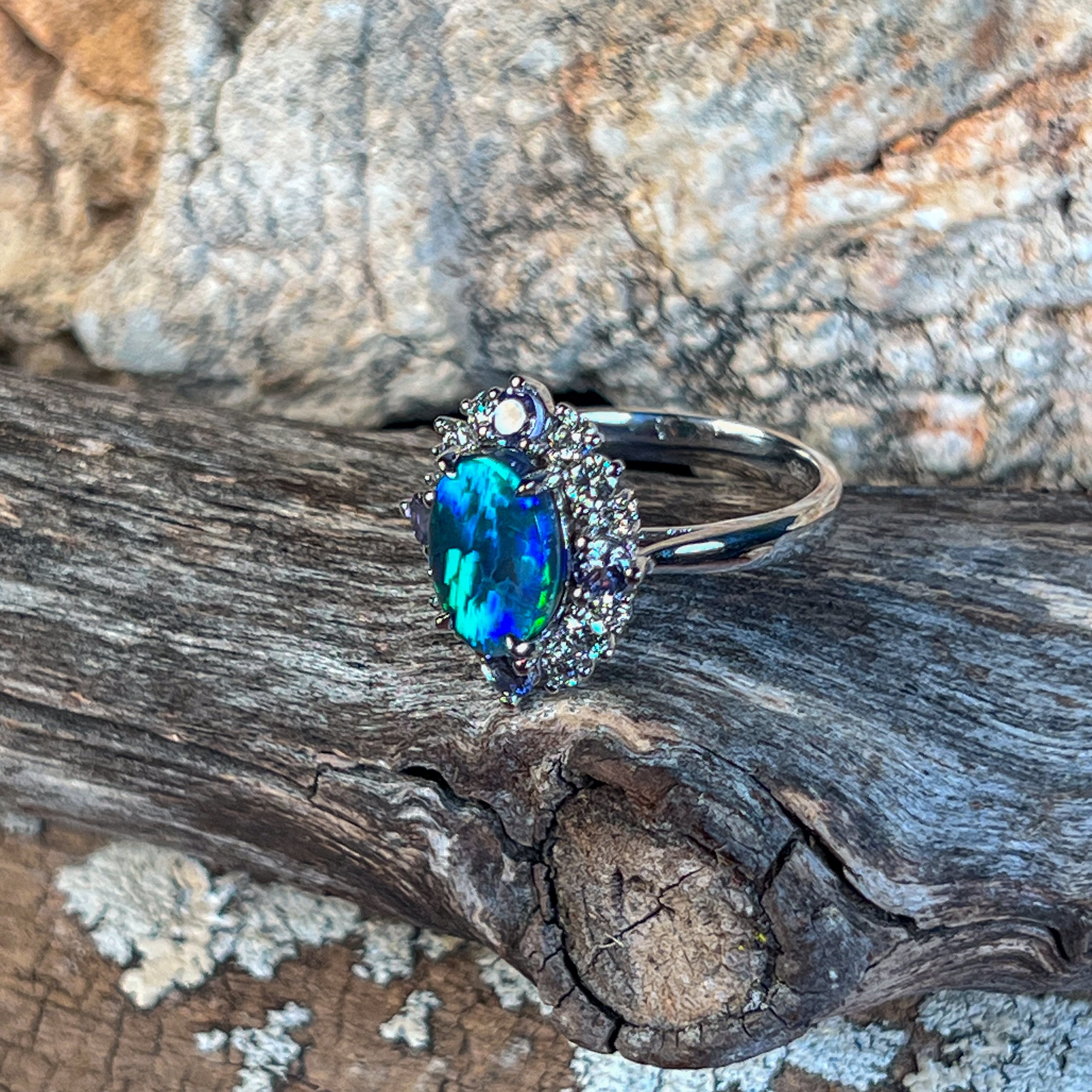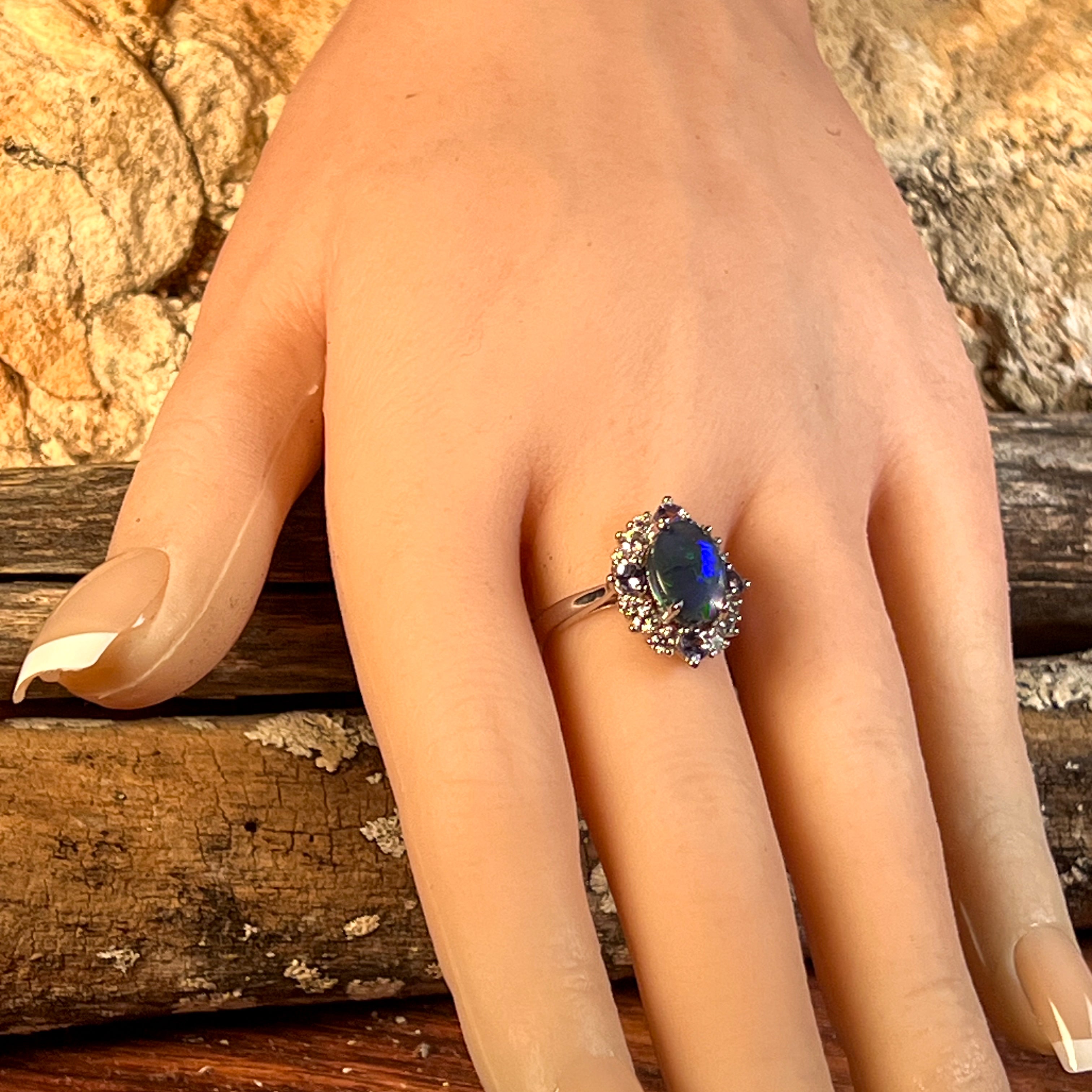 Make a bold statement with this stunning platinum cluster ring that commands attention from every angle. Featuring a mesmerizing black opal as the showstopper, complemented by vibrant tanzanites and sparkling diamonds, this piece blends luxury with contemporary flair. The intricate cluster design creates dynamic visual interest while the precious metal setting ensures lasting elegance. Perfect for those who refuse to blend in—wear it proudly and let your jewellery do the talking.