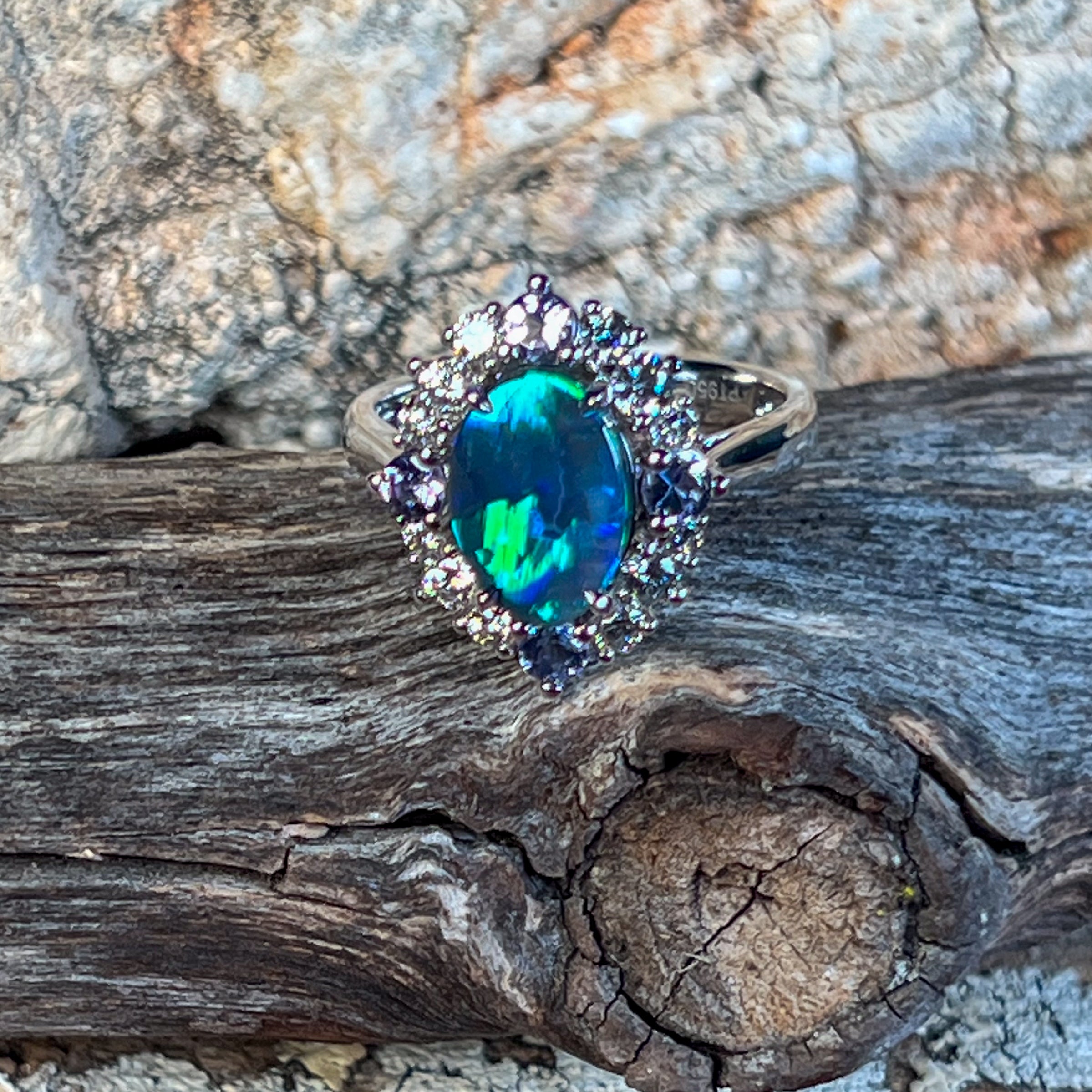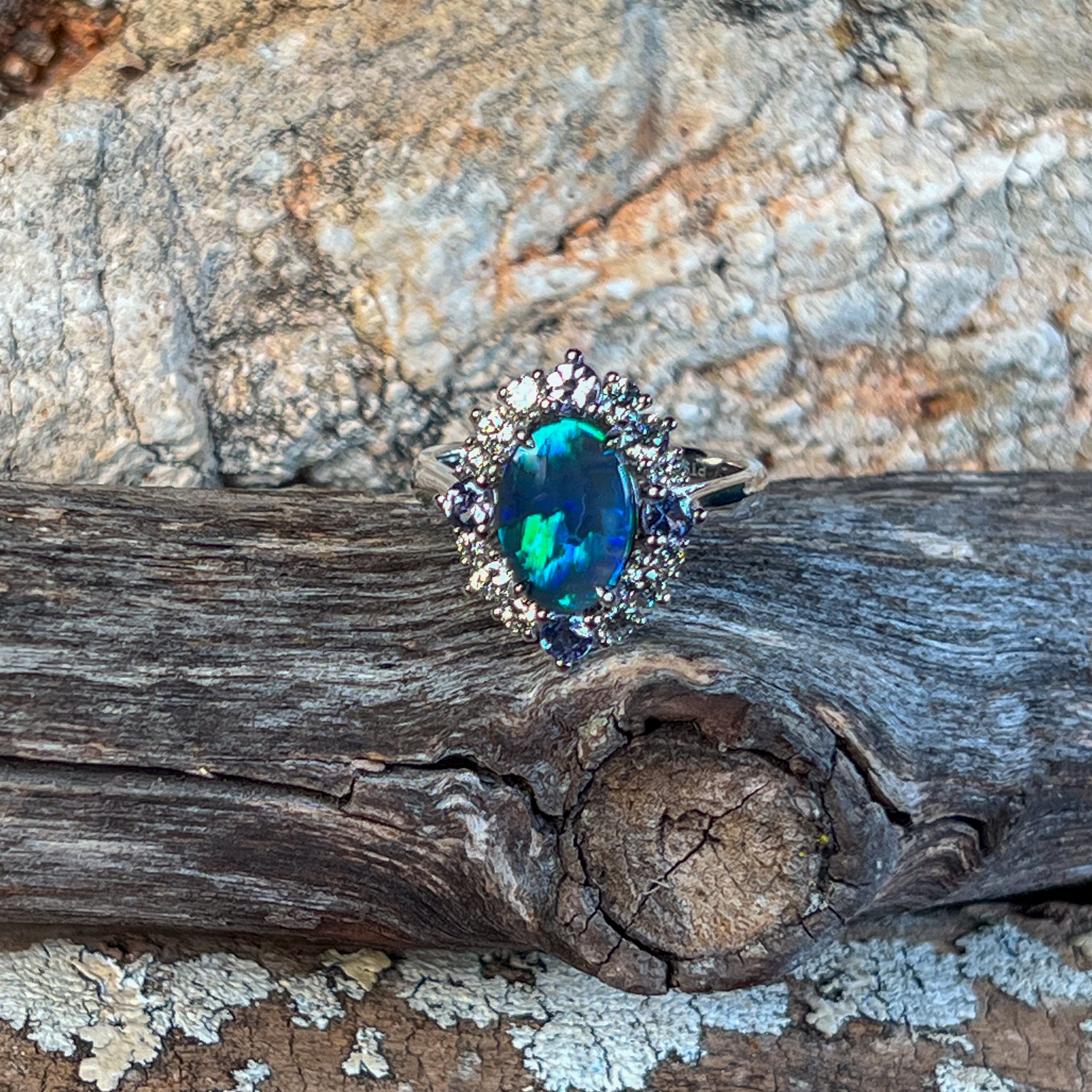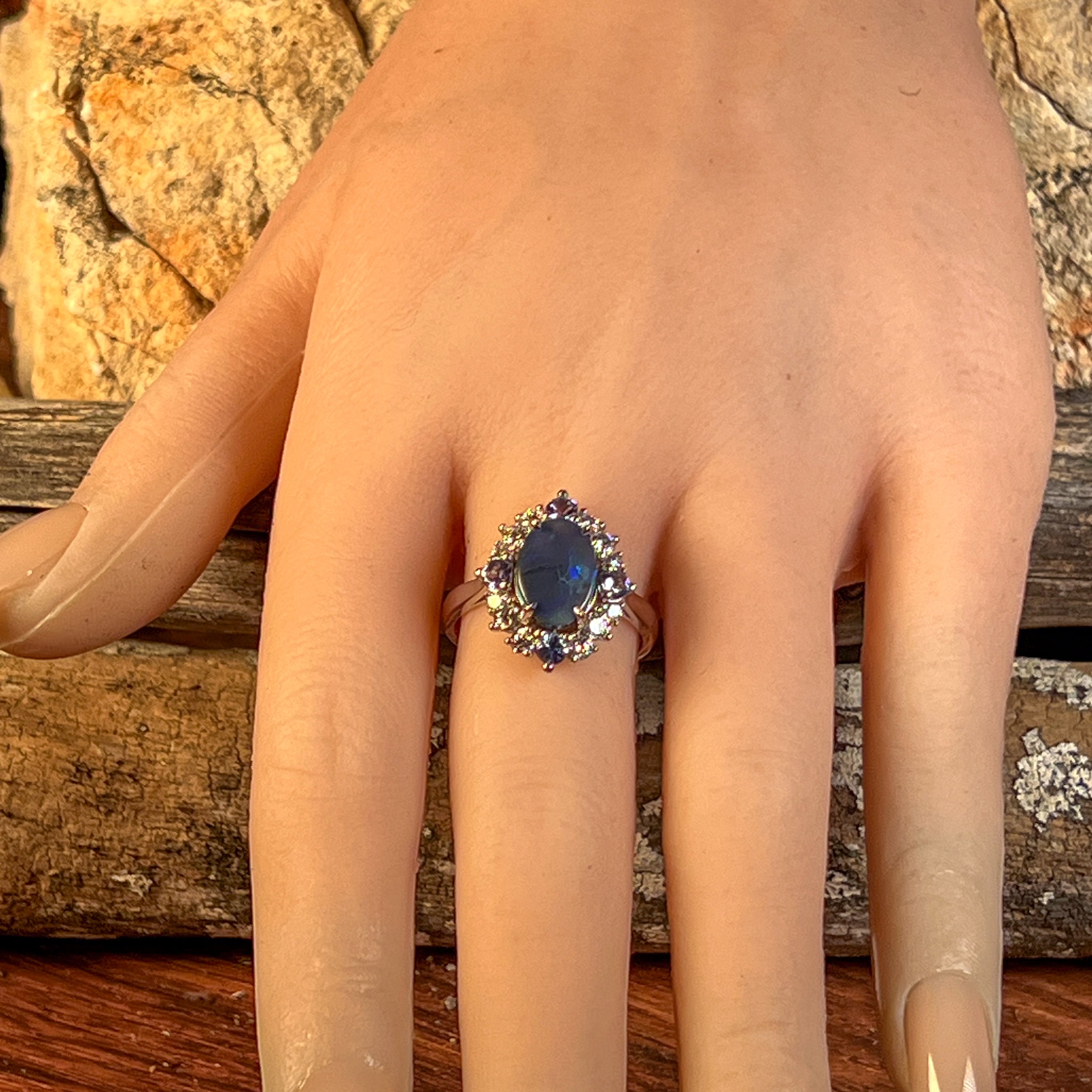 Platinum cluster design ring set with one Black Opal , Tanzanites and diamonds