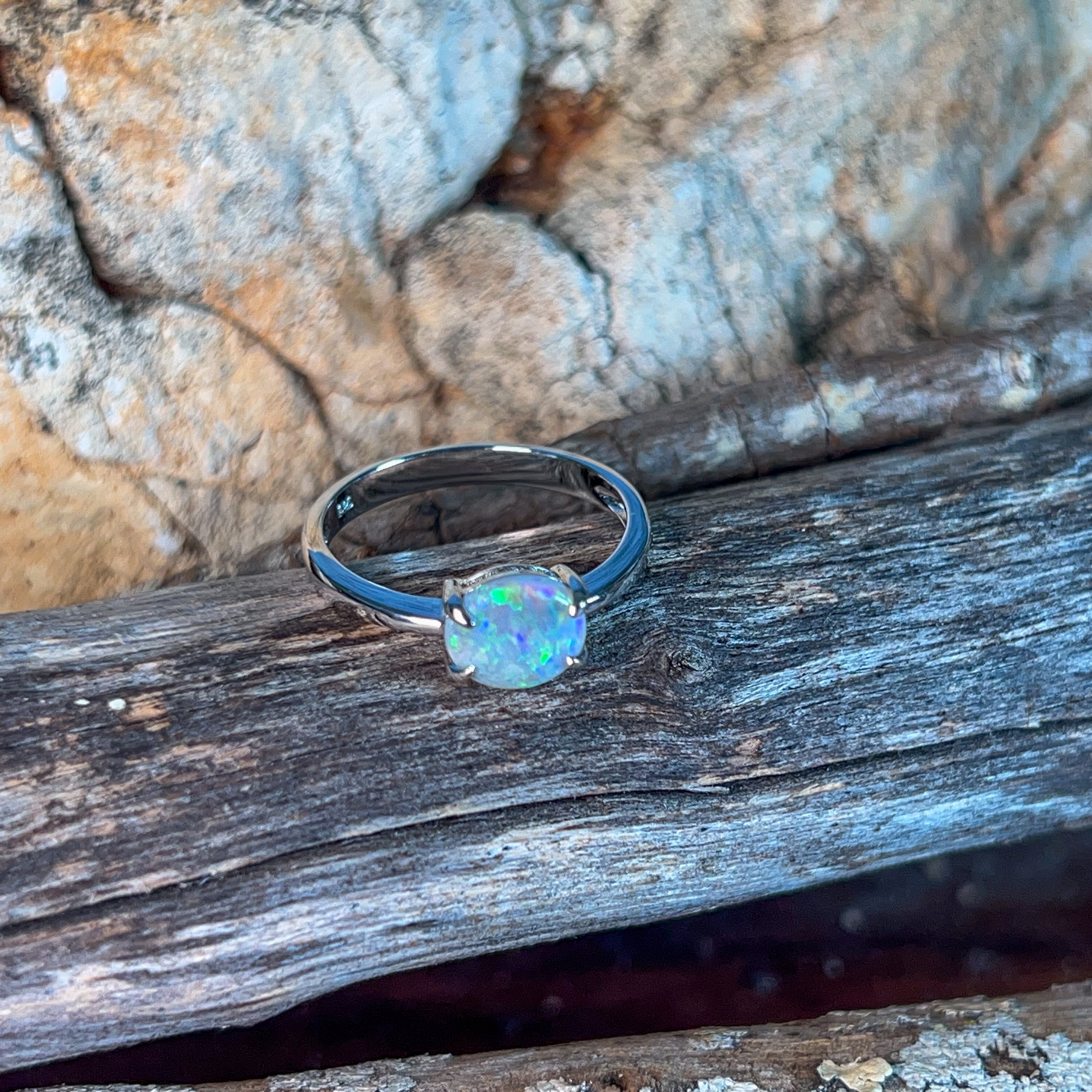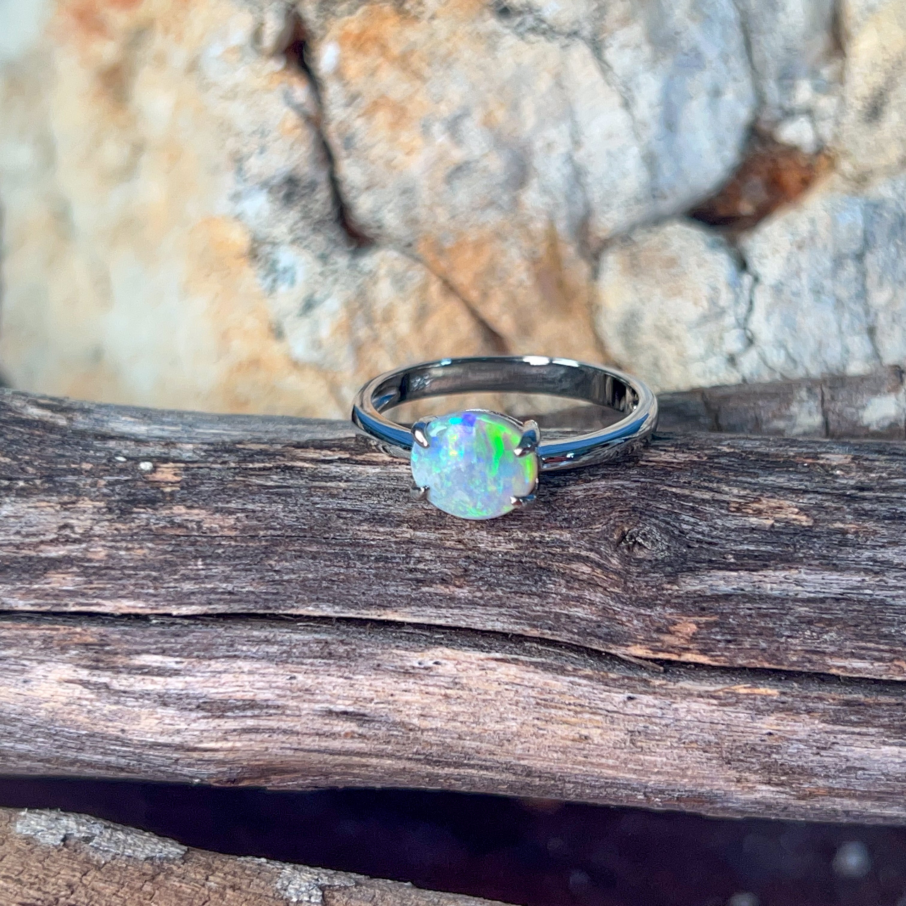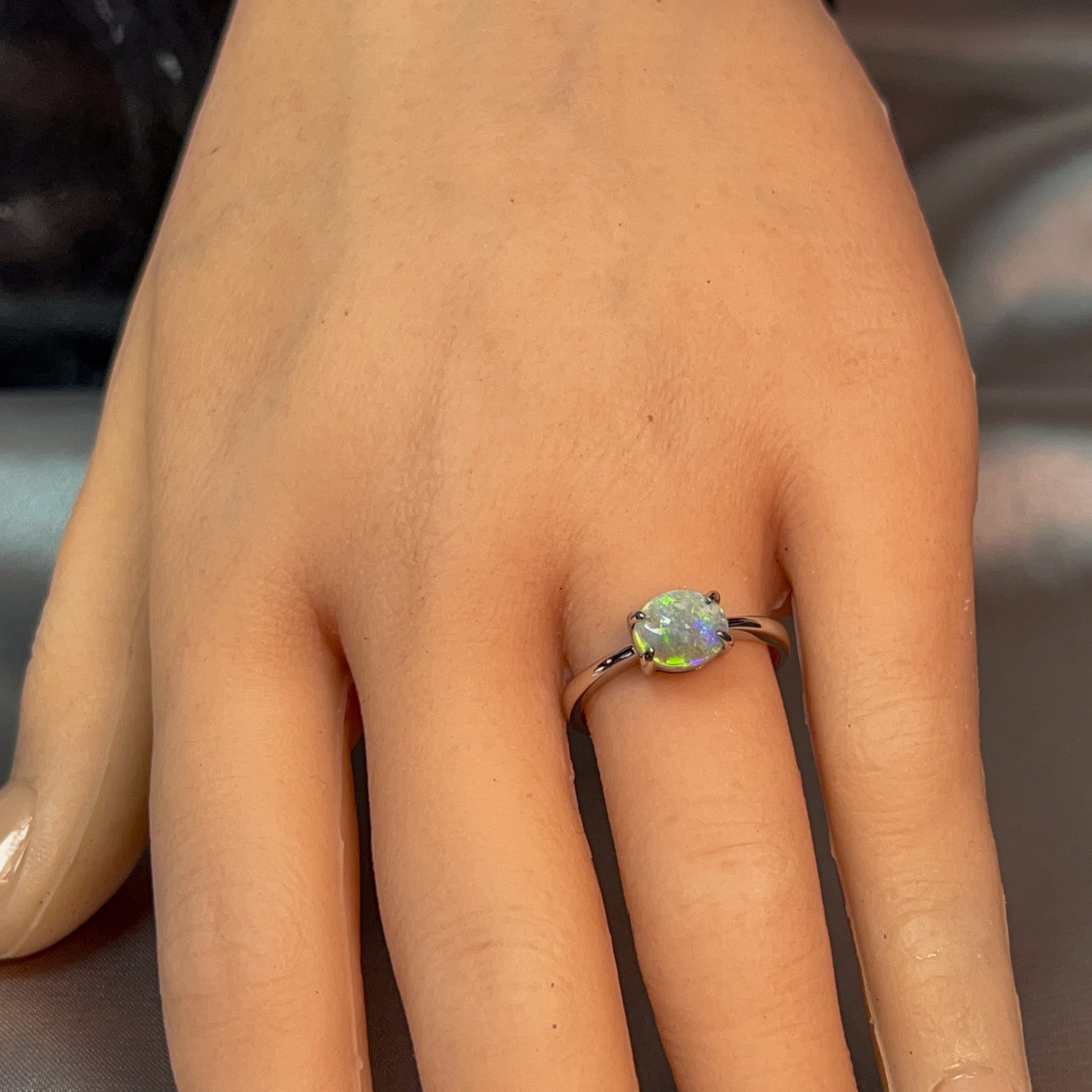 Discover understated elegance with this sterling silver black opal ring, featuring a stunning 0.8ct gemstone that captures light with mesmerizing depth. The delicate design showcases the opal's natural play of colour against polished silver, creating a sophisticated piece perfect for everyday wear or special occasions. Its refined proportions make it an ideal choice for those who appreciate subtle luxury and timeless beauty.