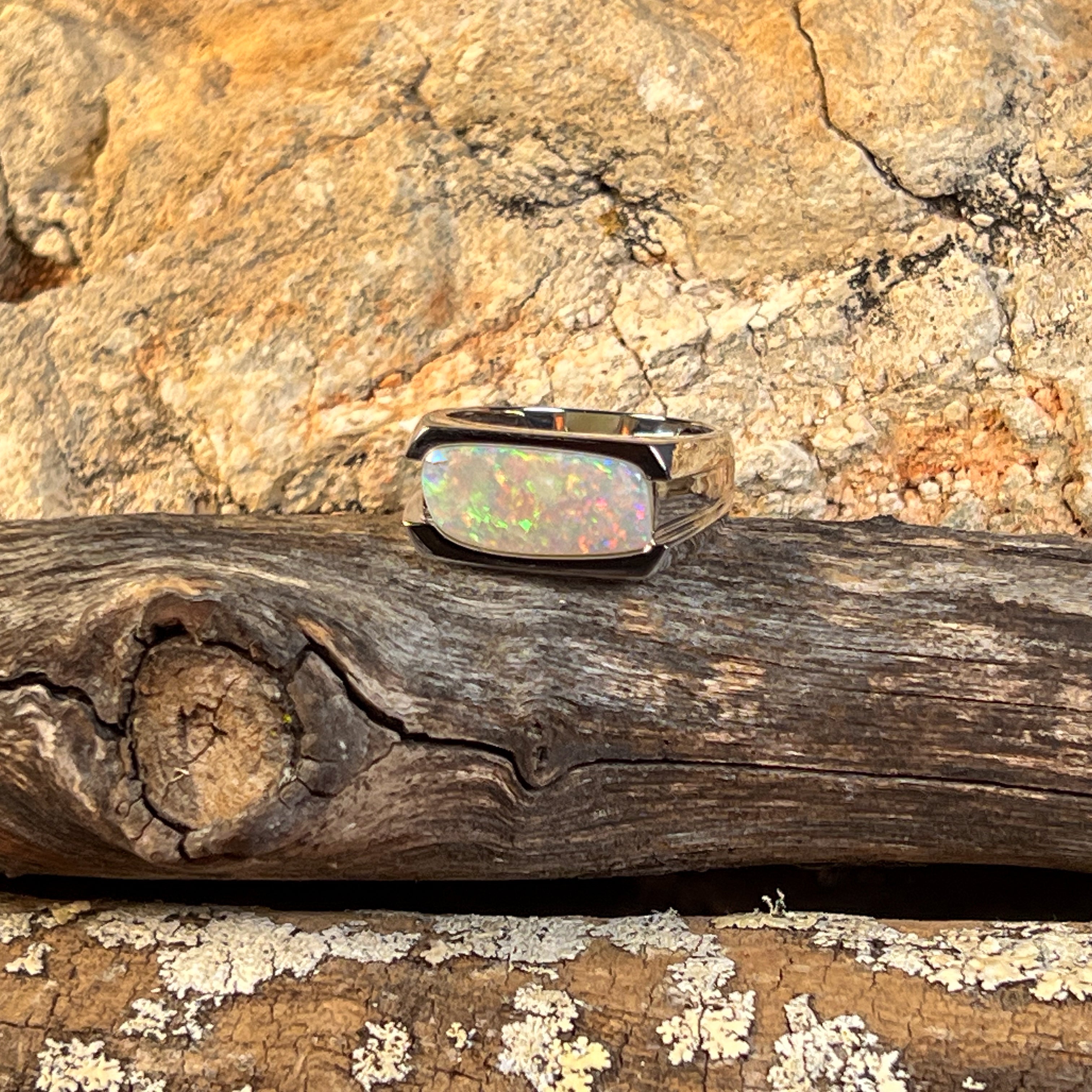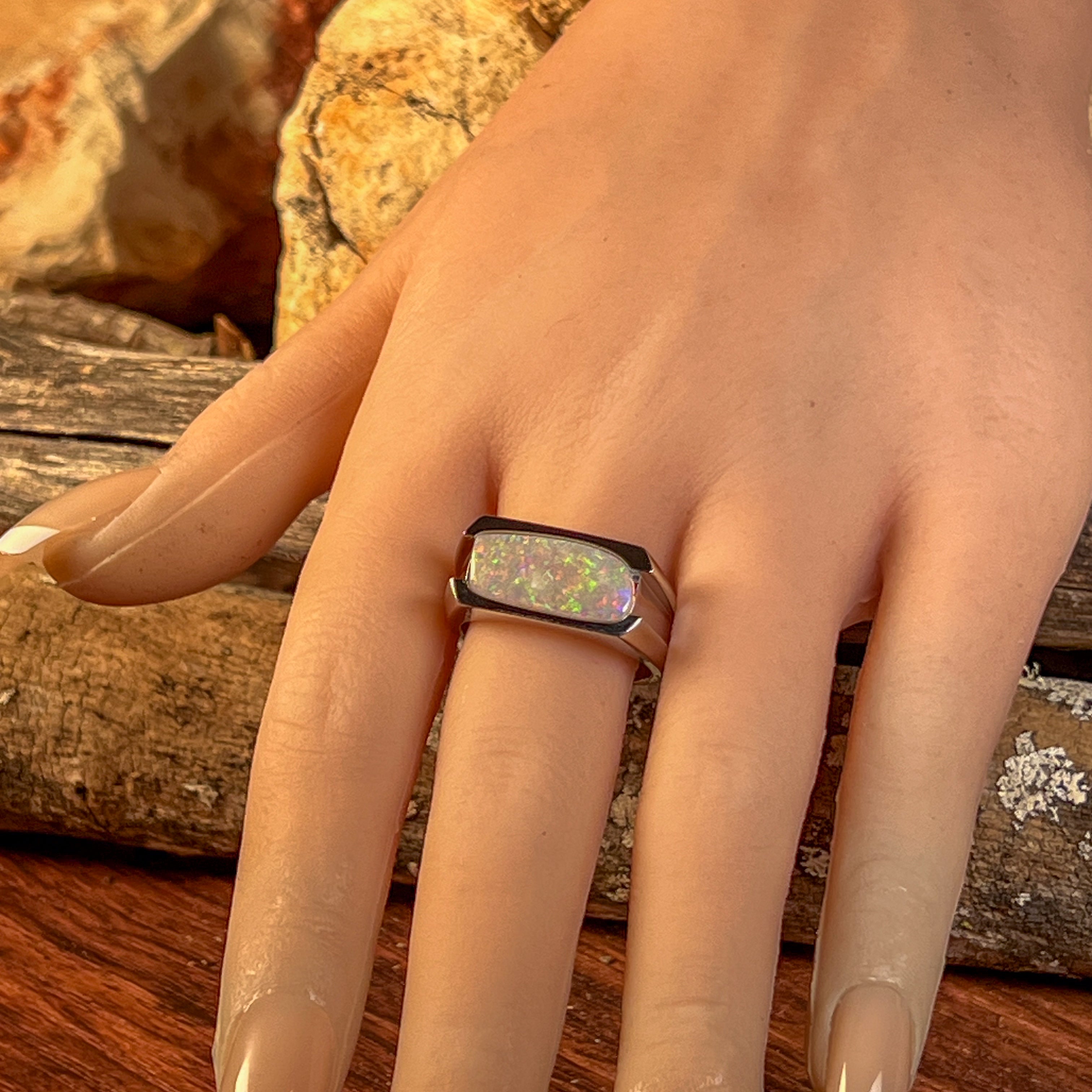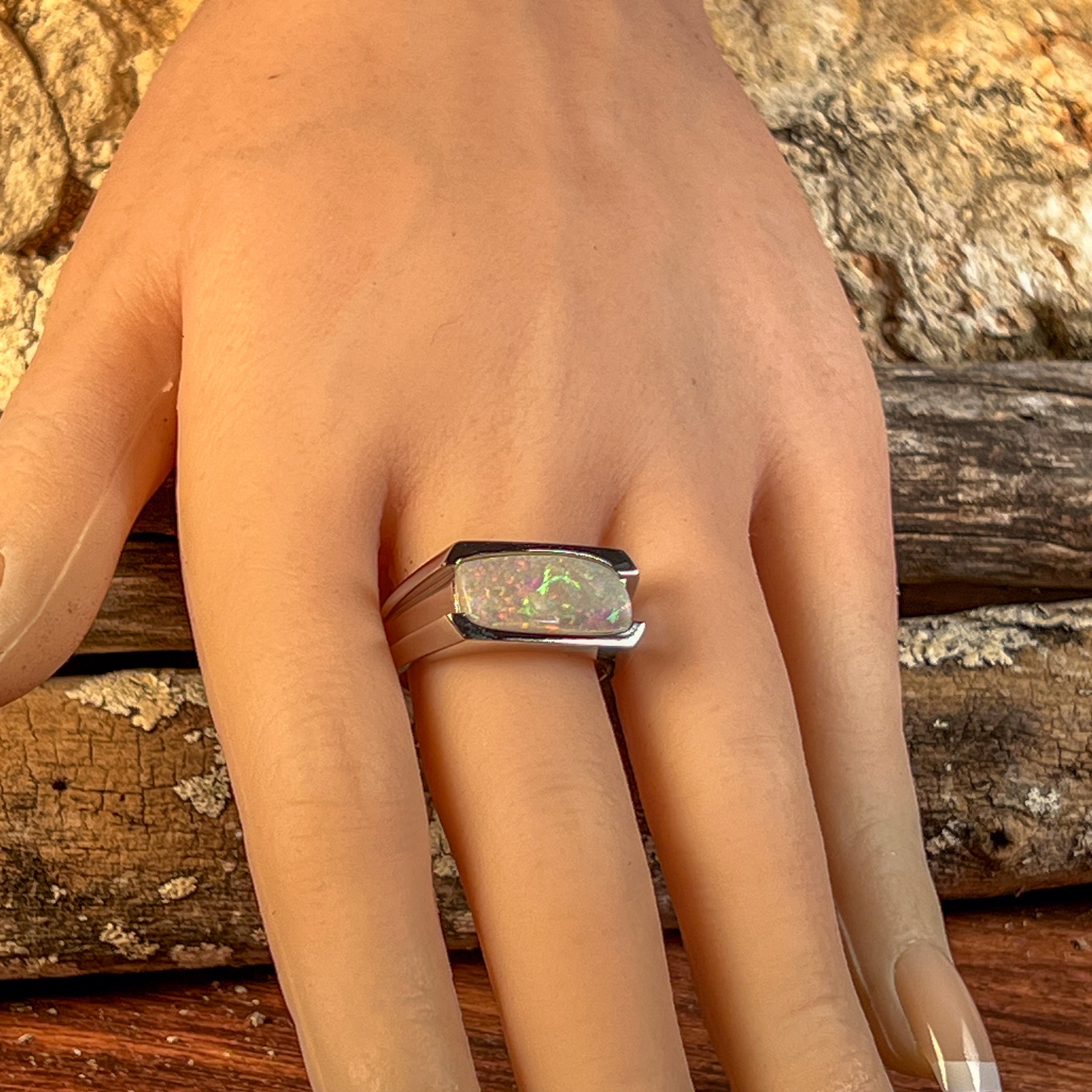 Slip on sophistication with this striking sterling silver rectangular white opal ring—the perfect blend of modern edge and timeless elegance. The crisp white opal catches the light beautifully, making it an instant conversation starter without trying too hard. Crafted in quality sterling silver, it's built to handle everyday wear while keeping that polished, refined look. Whether you're dressing up or keeping it casual, this gents ring proves that great style doesn't need to shout to be heard.