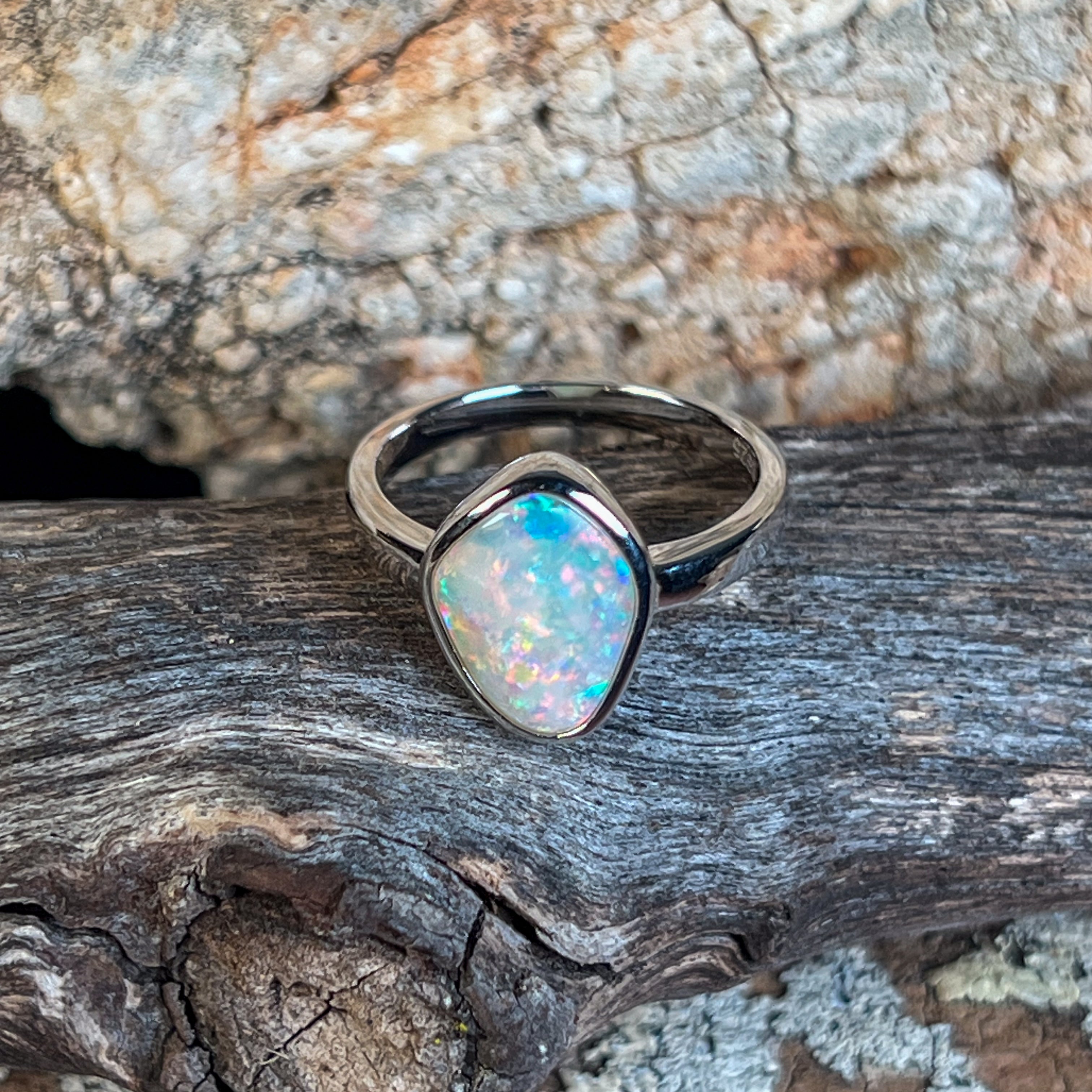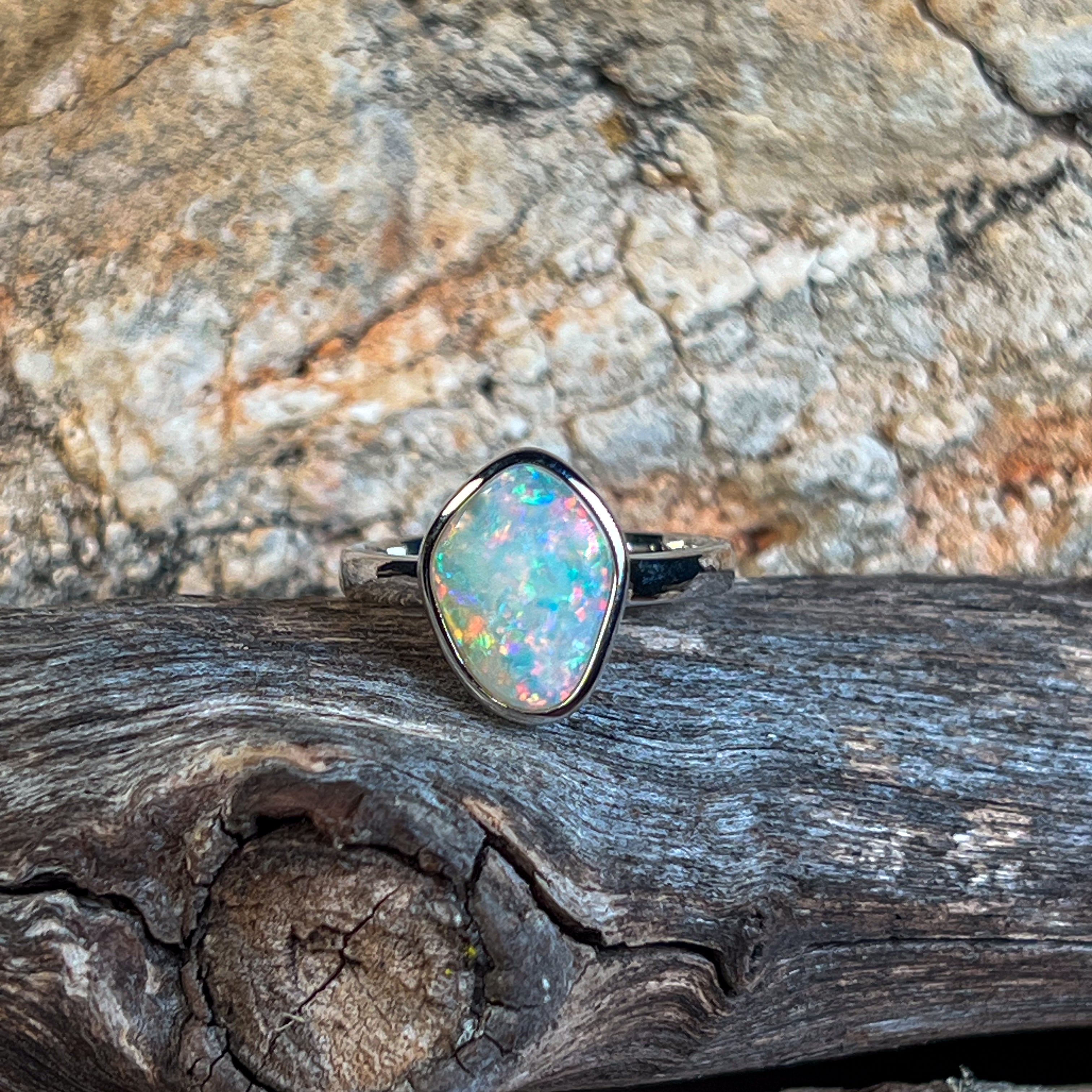 Capture pure elegance with this stunning solitaire featuring a mesmerizing 1.41ct white opal in its natural freeform shape. Set in lustrous sterling silver, this ring celebrates the opal's unique play-of-colour with a minimalist design that lets the gemstone steal the spotlight. Perfect for those who dare to be different—because why settle for ordinary when you can have a one-of-a-kind masterpiece on your finger? A timeless treasure that's anything but predictable.