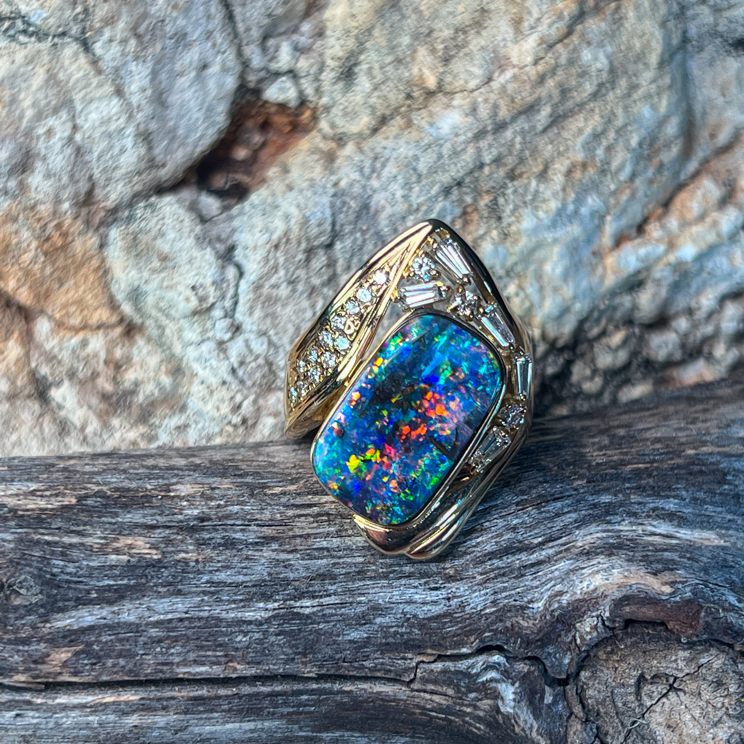 You can find a diamond opal ring that you or your future fiance will love. The 14kt Yellow Gold Black Opal And Diamond Ring is one example.