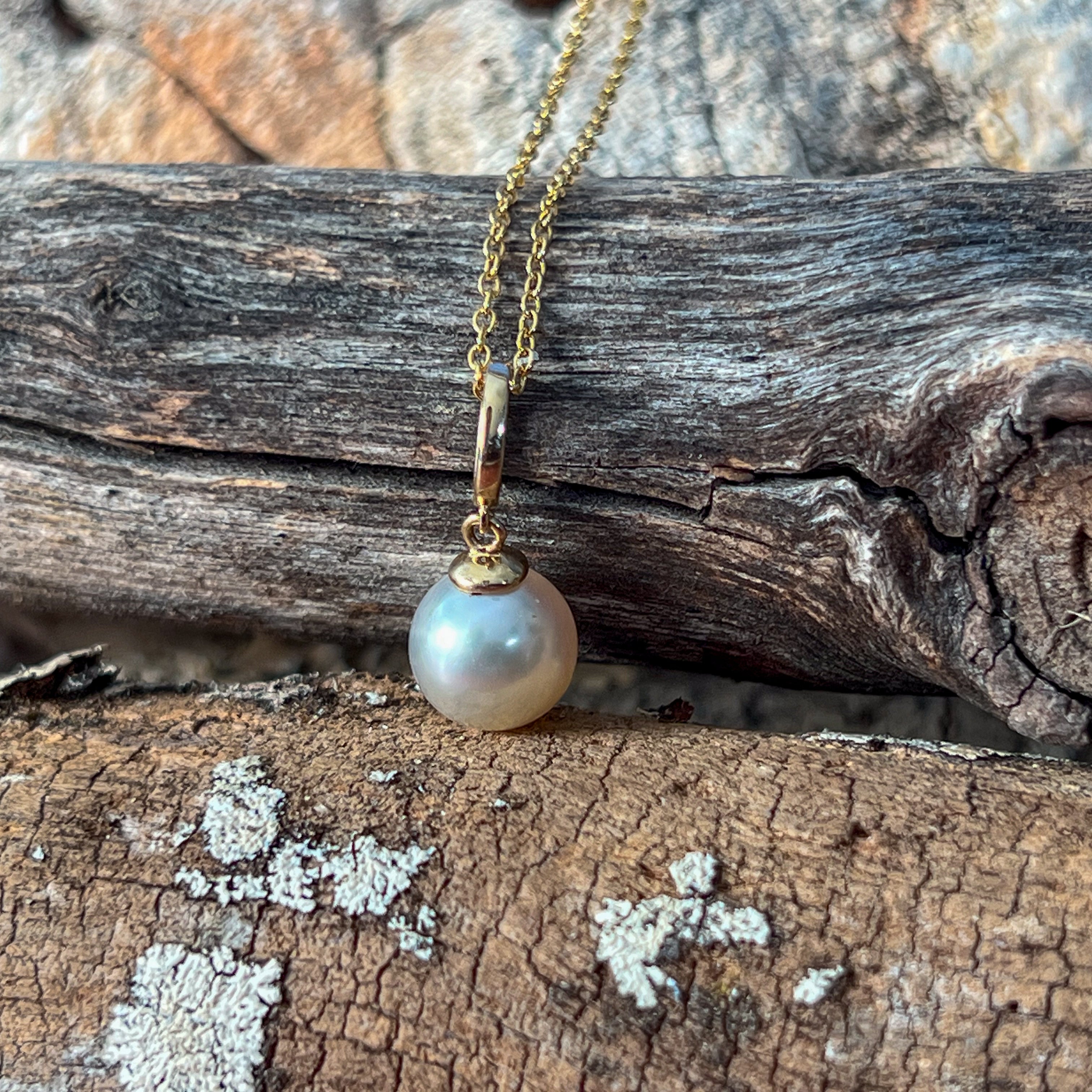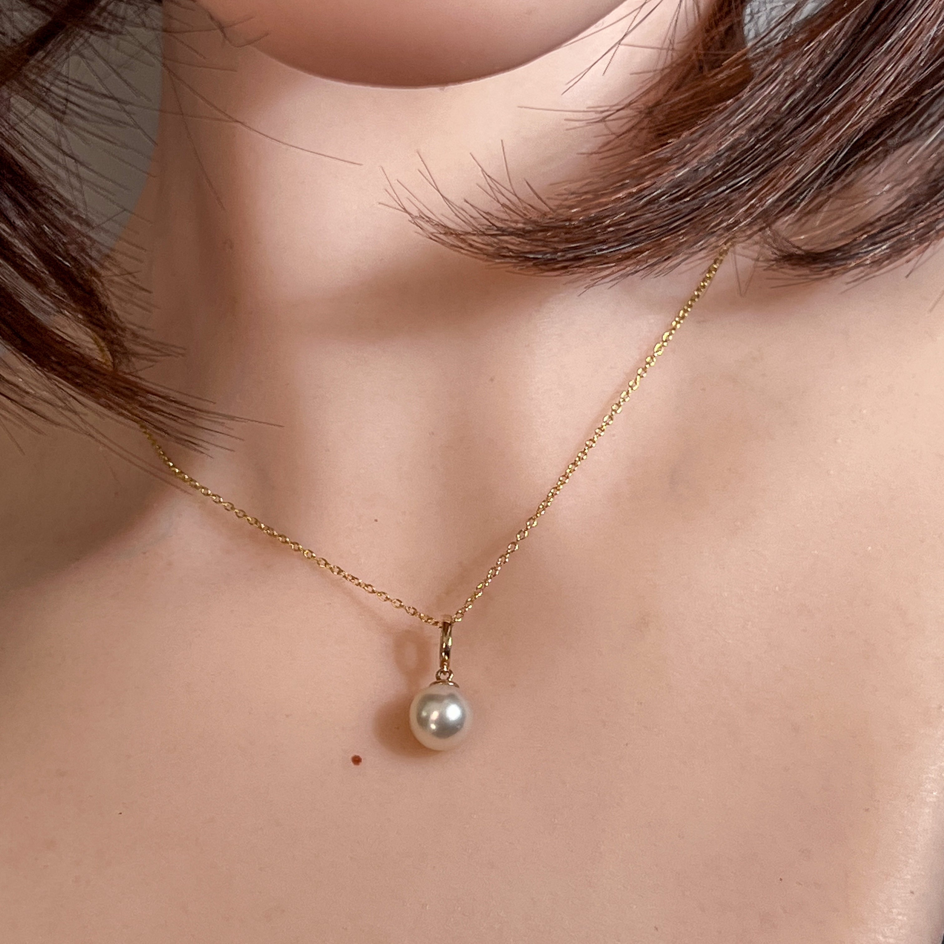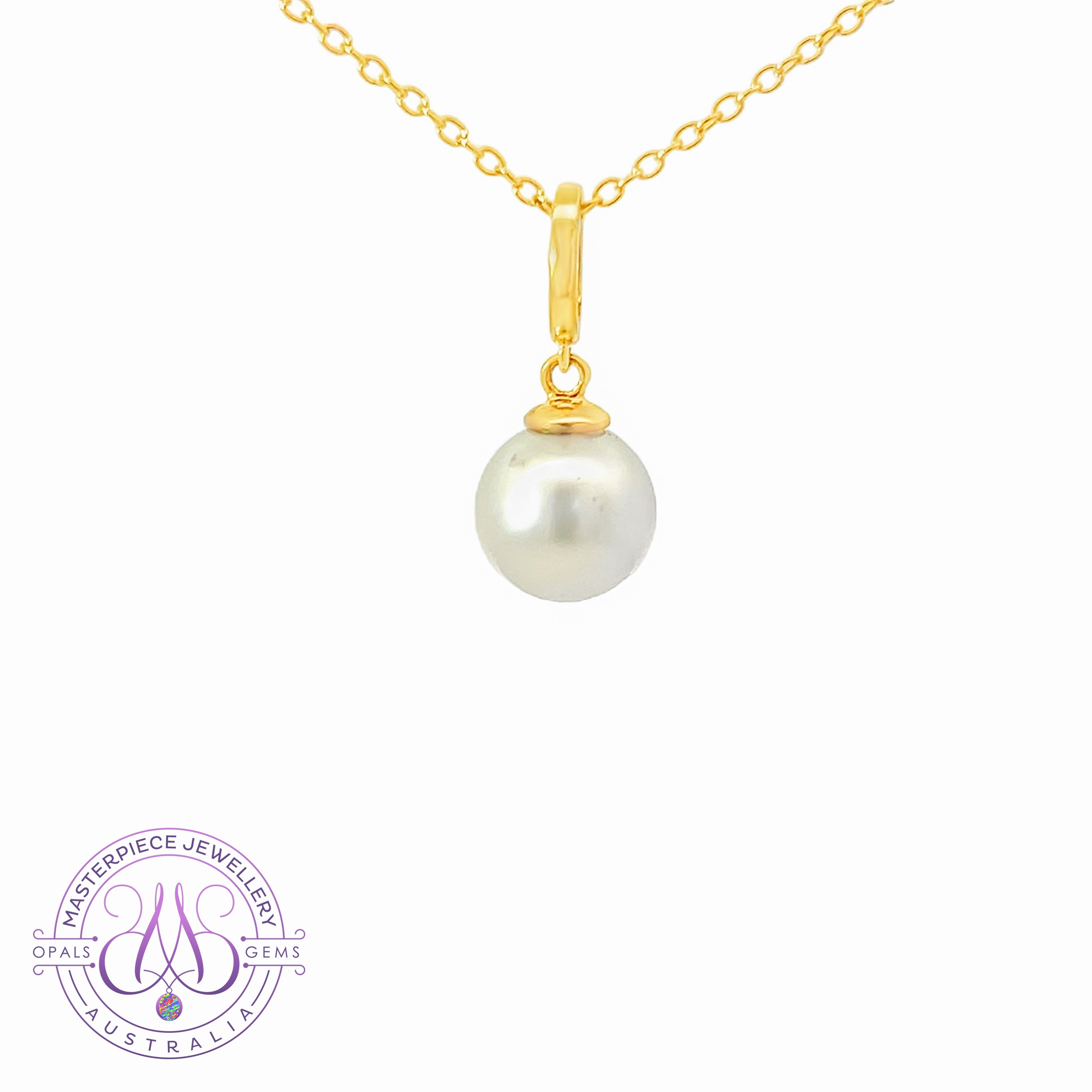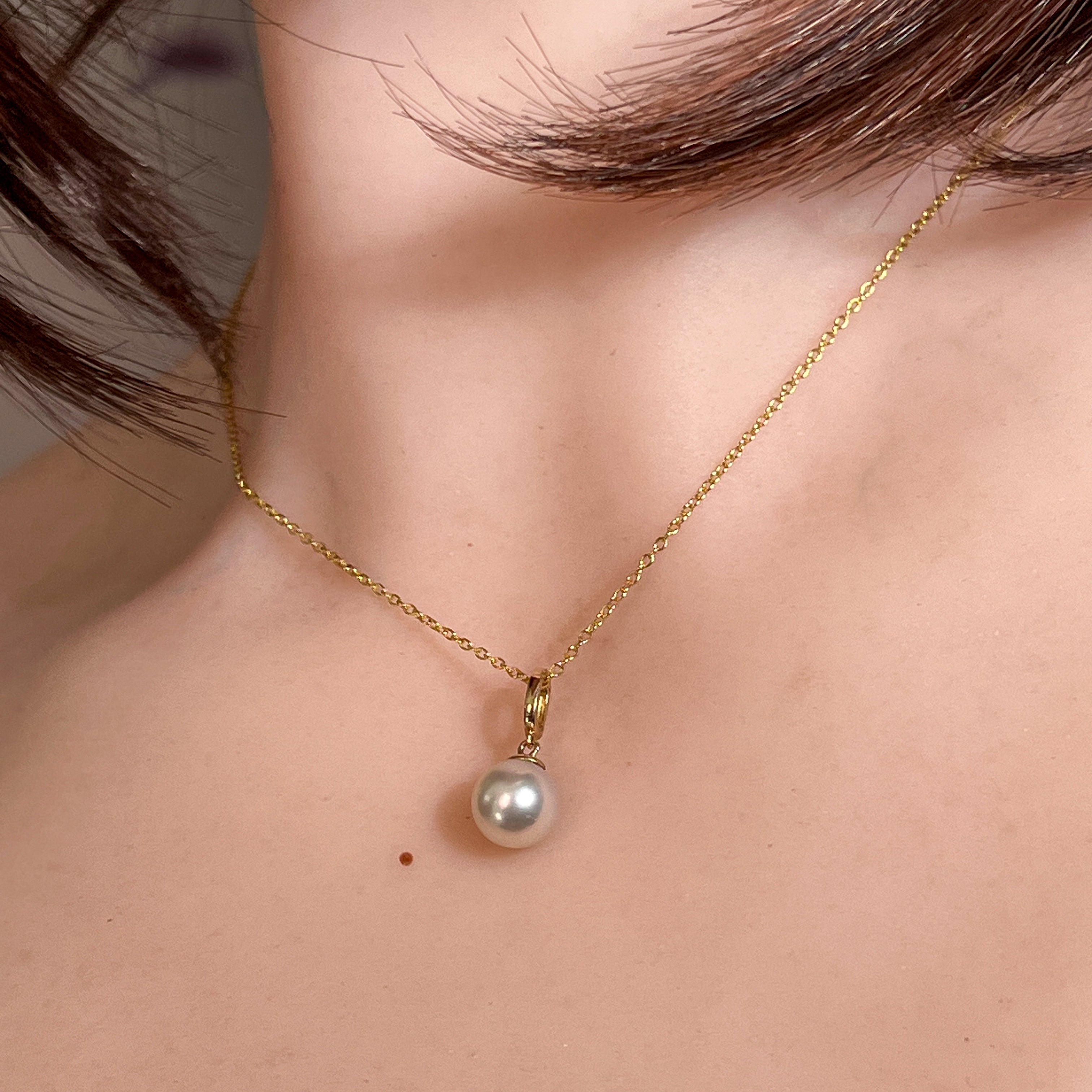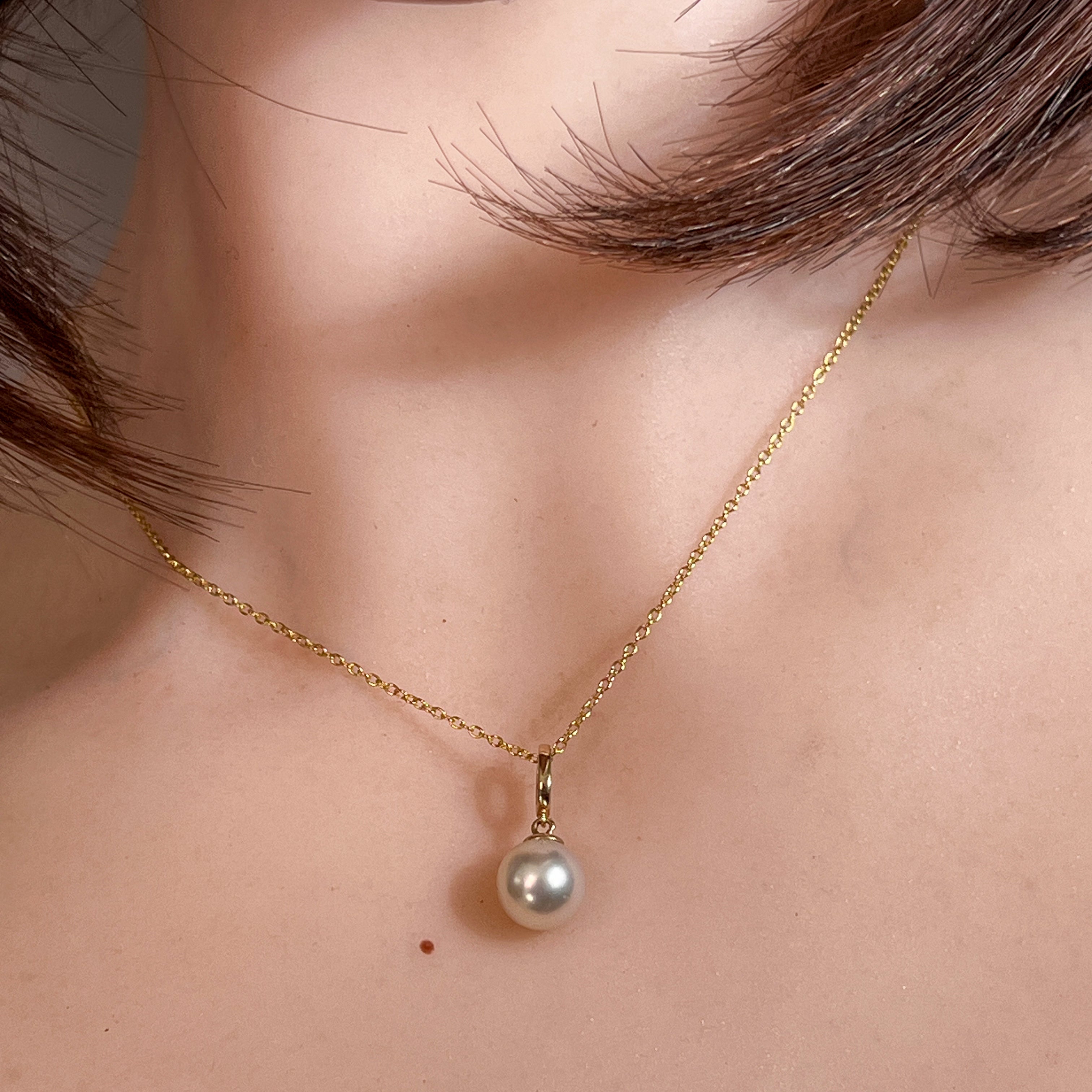 One 14kt Yellow Gold South Sea Pearl solitaire classic pendant featuring one Australasian South Sea Pearl, 8.5-9mm off round in white colour. This timeless piece measures 19mm in length and weighs 1.2g, offering elegant simplicity with the lustrous beauty of a premium South Sea pearl set in warm yellow gold.