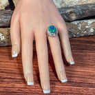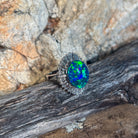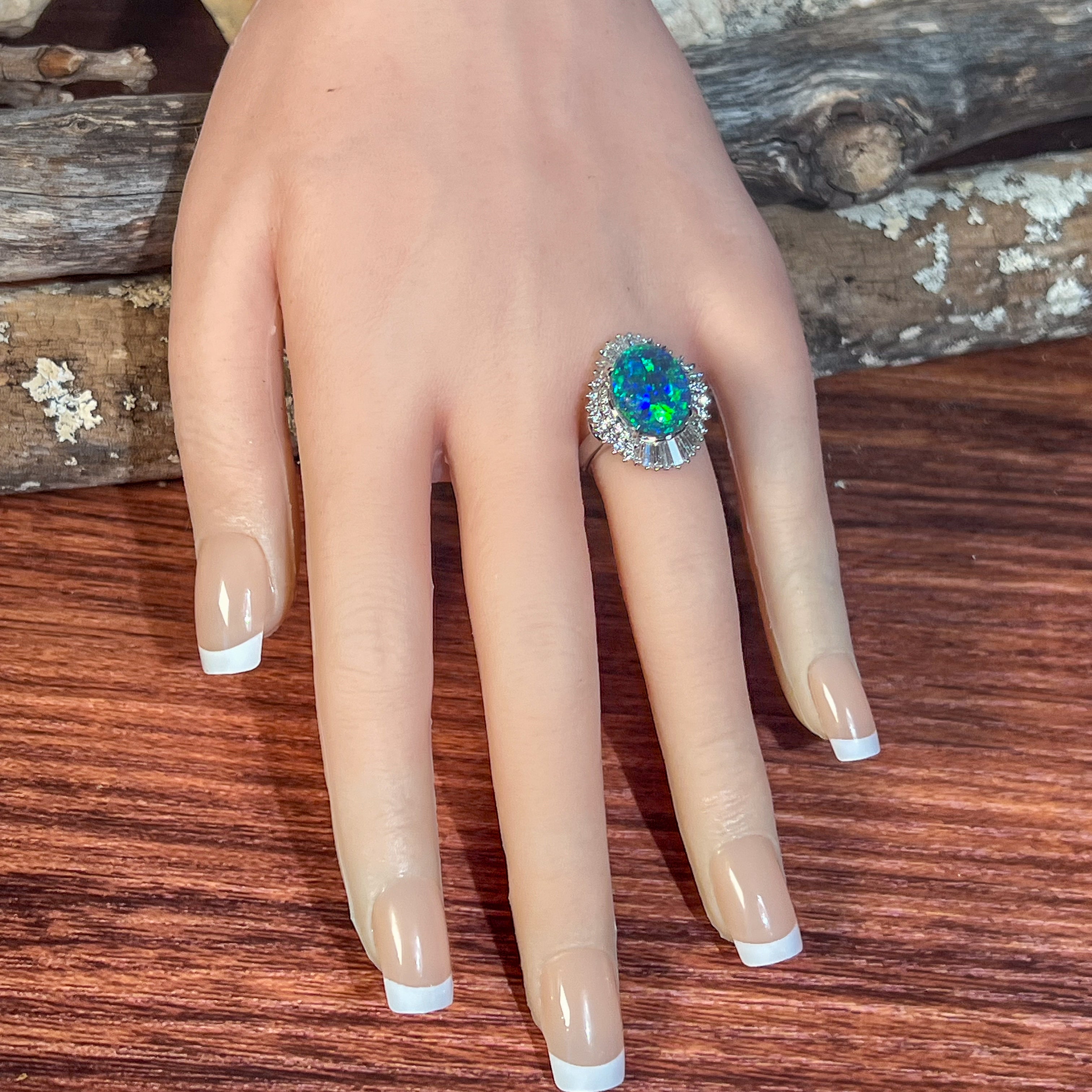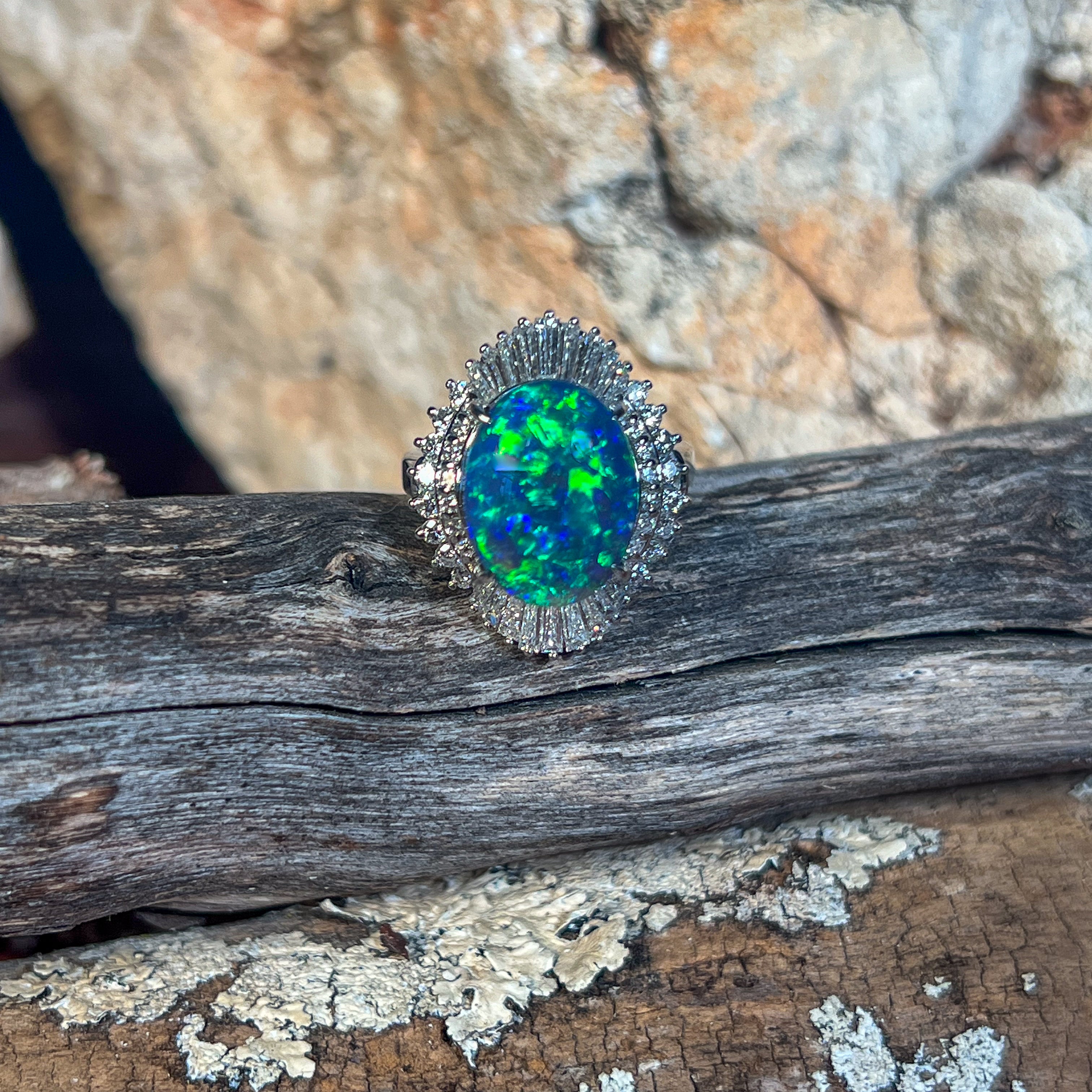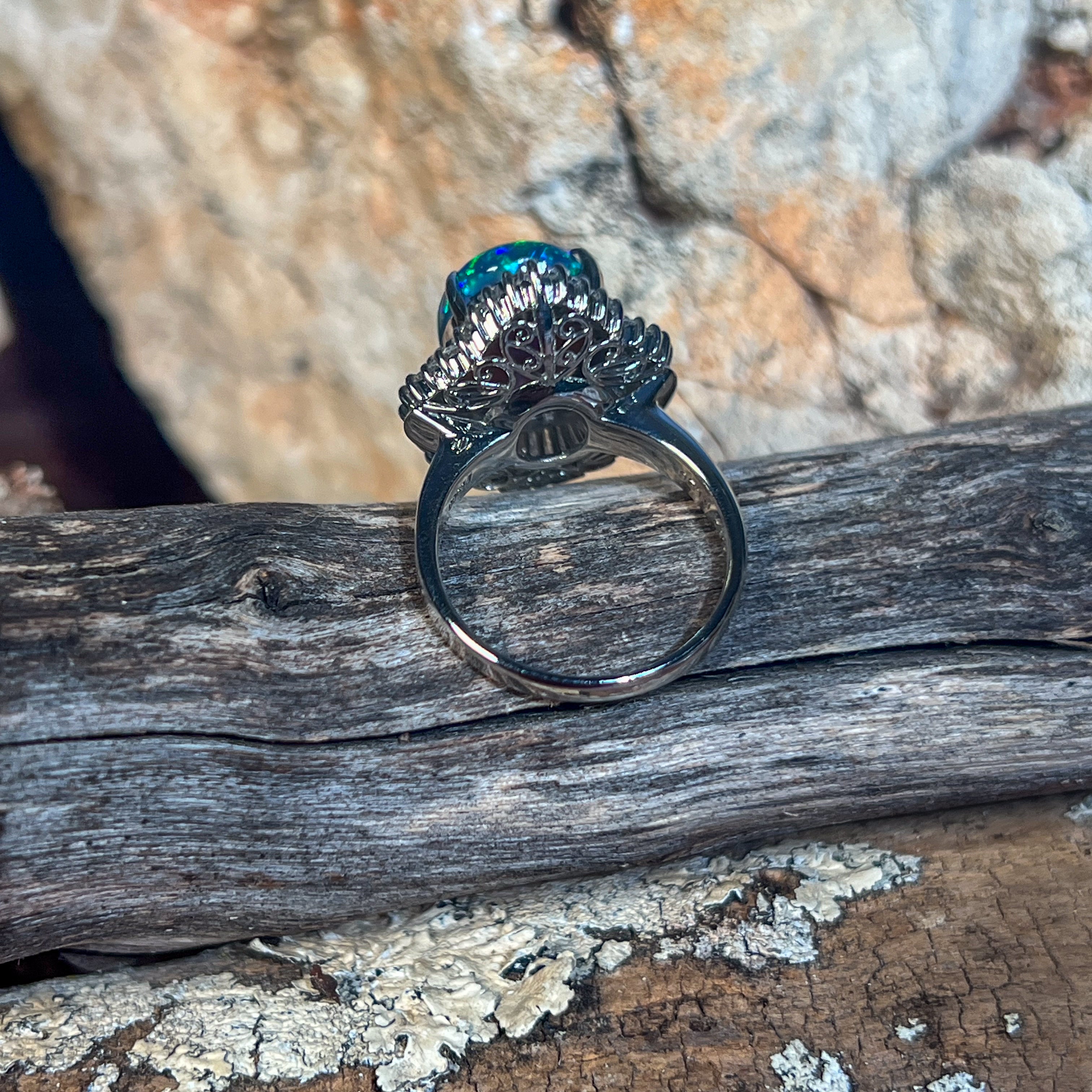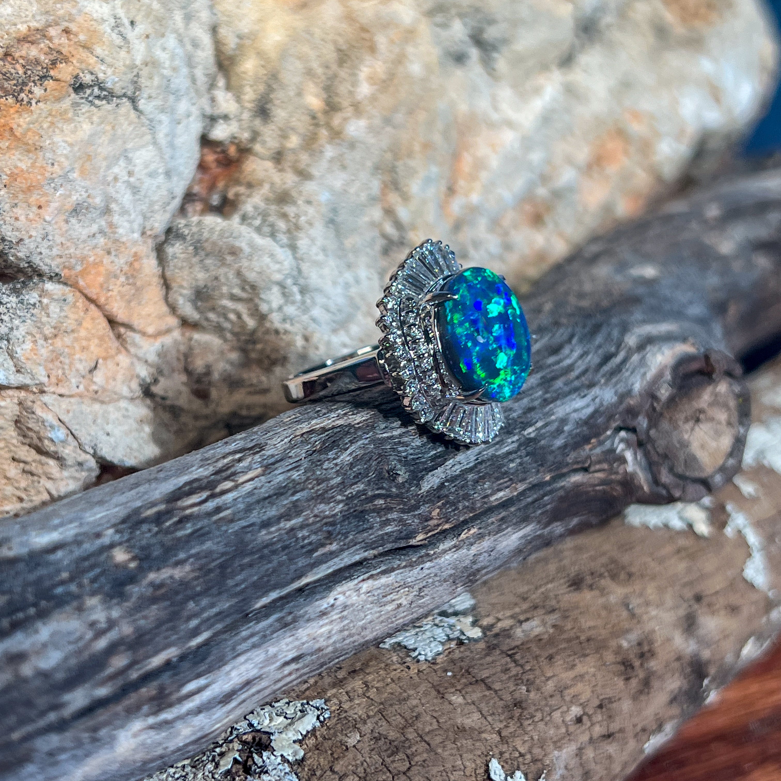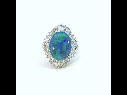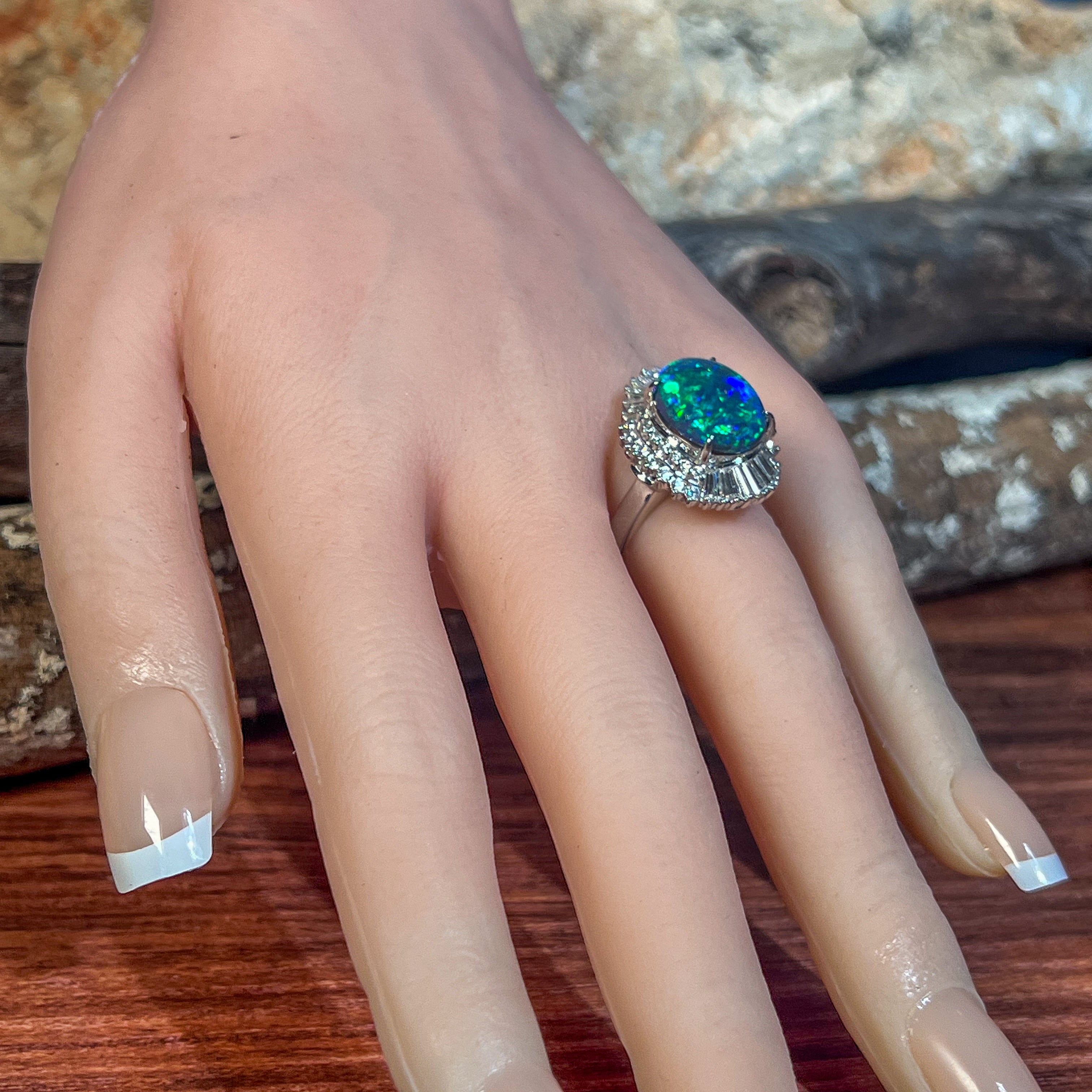 Elevate your style with this stunning platinum cluster ring featuring a mesmerizing 4.82ct black opal surrounded by sparkling diamonds. Its bold design makes a powerful statement, perfect for those who appreciate unique elegance and timeless luxury. This ring not only captivates with its vibrant colors but also offers lasting quality and sophistication for any special occasion.