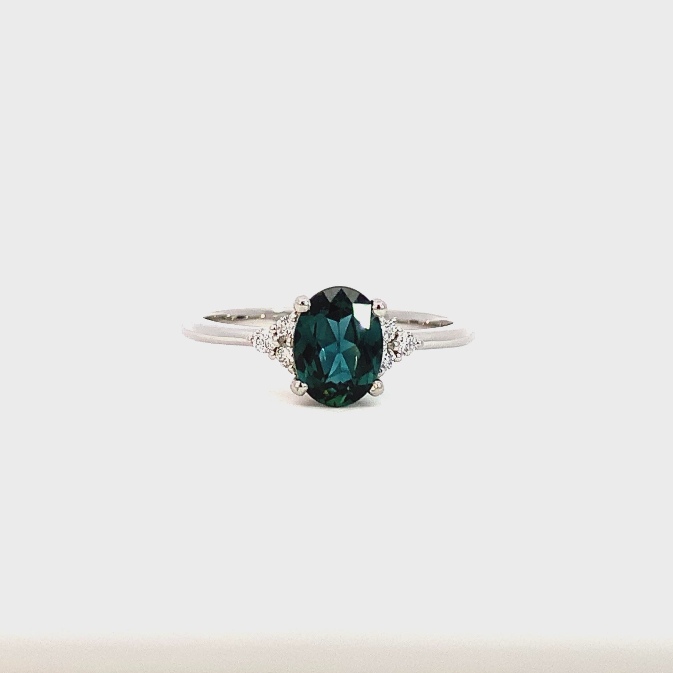 This teal sapphire engagement ring is the perfect symbol of your commitment to love. The platinum band is set with a 1.18ct teal blue sapphire at its center, surrounded by stunning round diamonds and finished with high polished edges. This ring is elegant and beautiful and will last as long as your love does.