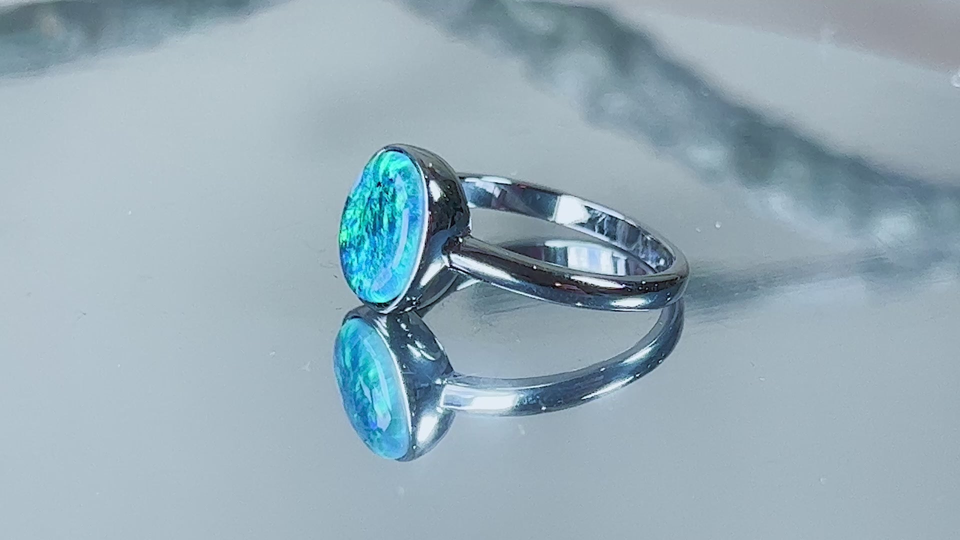 This Bezel-Set Solitaire Triplet Opal Ring is an elegant and minimalist piece of jewelry that will make the perfect gift for her. Featuring a 10x8mm genuine opal beautifully set in sterling silver, this promise ring will make any occasion sparkle! Stun her with this dainty and handcrafted piece of opal jewelry today!