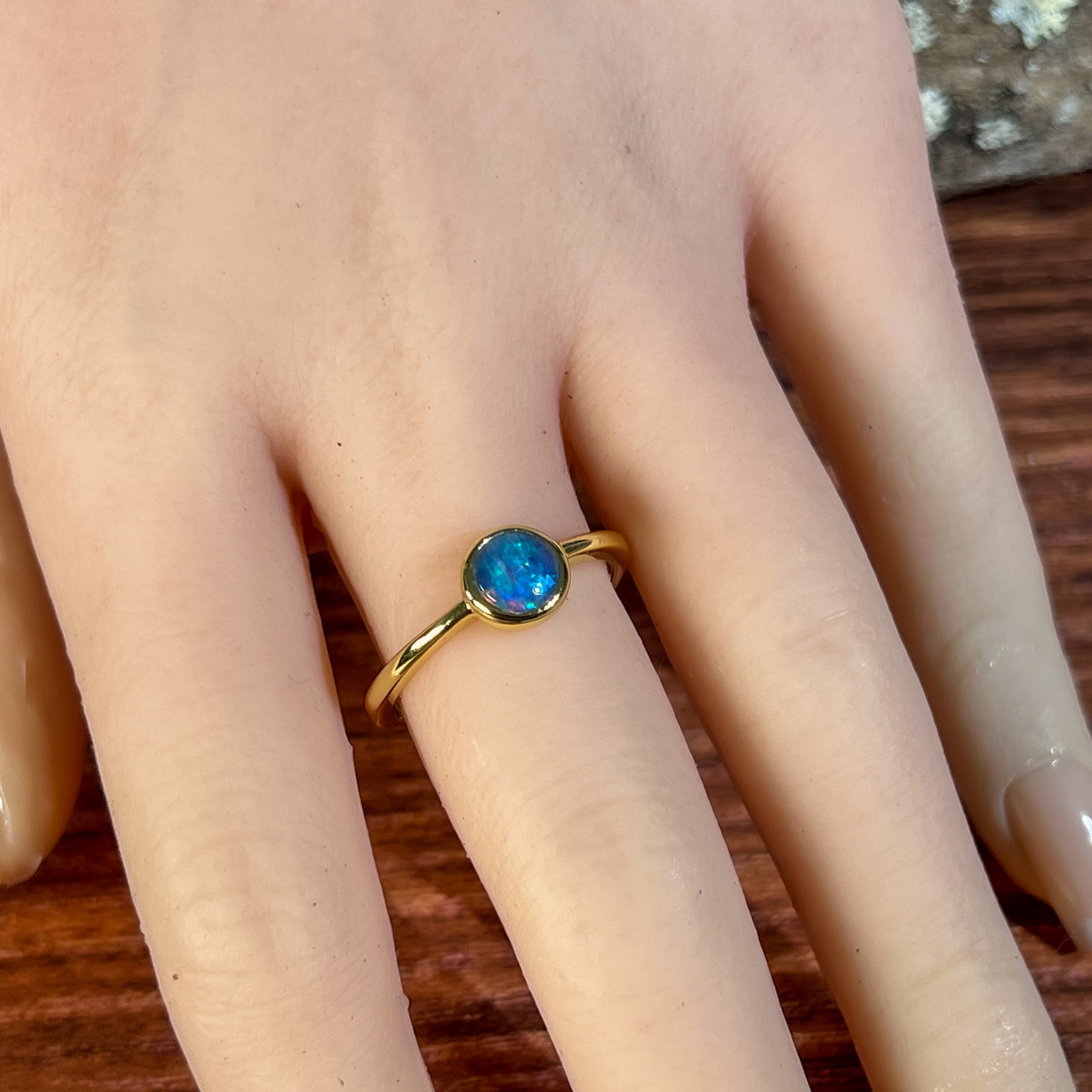 This gold plated silver ring features a 6mm round opal triplet set in a classic bezel, making it an elegant and timeless addition to any jewelry collection. The opal triplet reflects light beautifully and adds a touch of sophistication to any outfit. A must-have for those who appreciate classic and understated beauty.