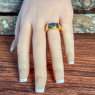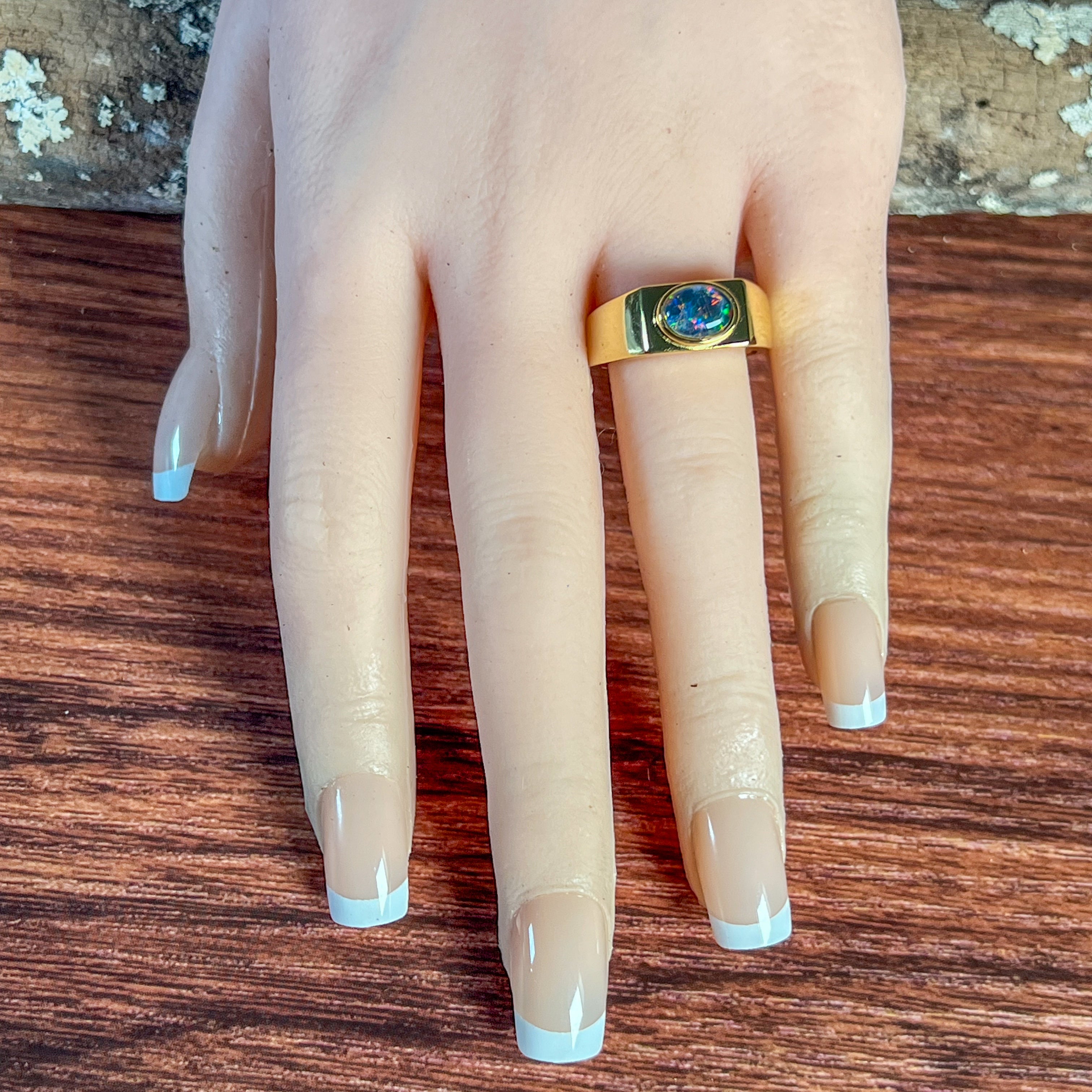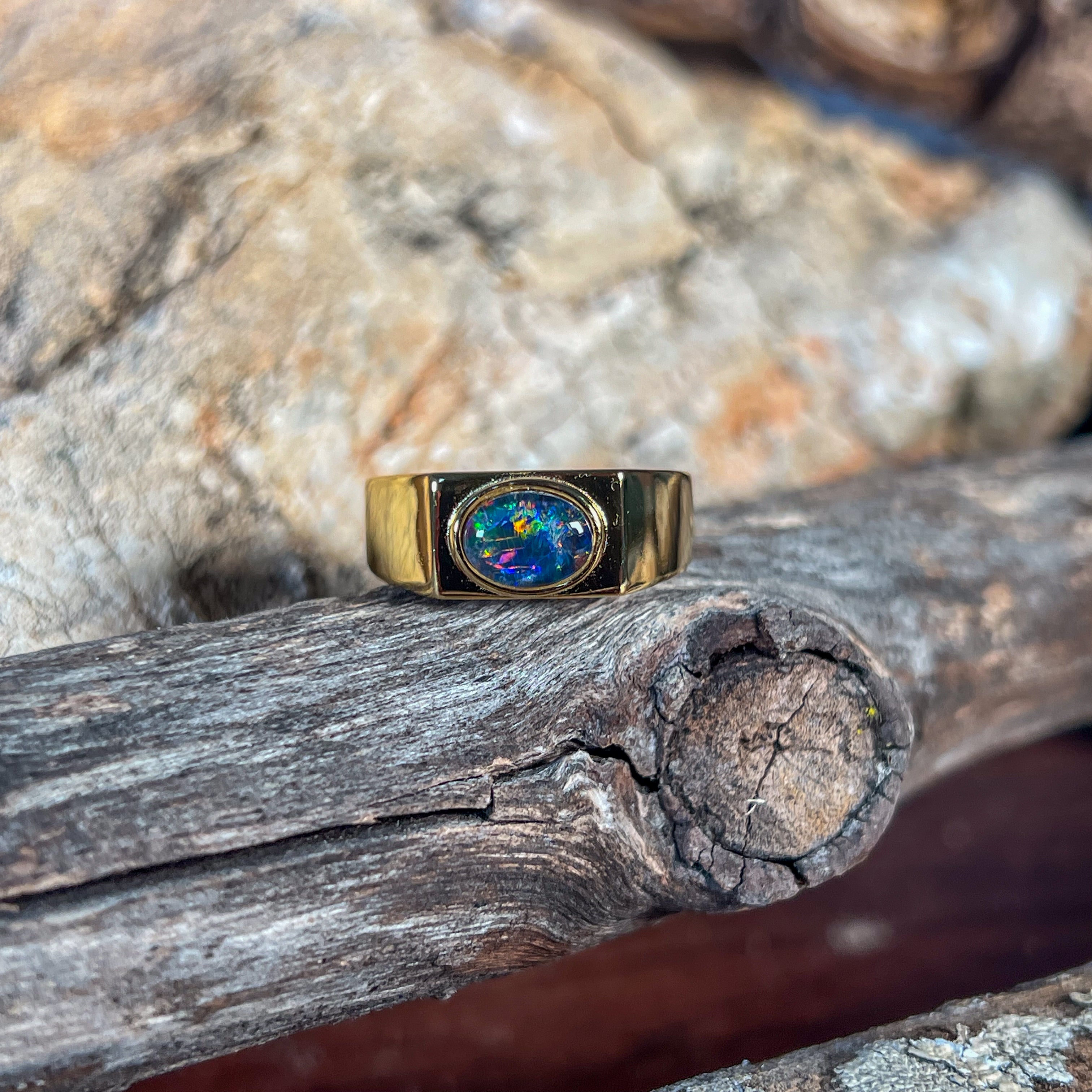 Introducing our unisex solitaire band, featuring a luxurious 8x6mm horizontal set Opal triplet rectangular shape ring. Made with gold plated Sterling Silver, this ring exudes sophistication and exclusivity. Elevate any outfit with this elegant and tasteful piece.