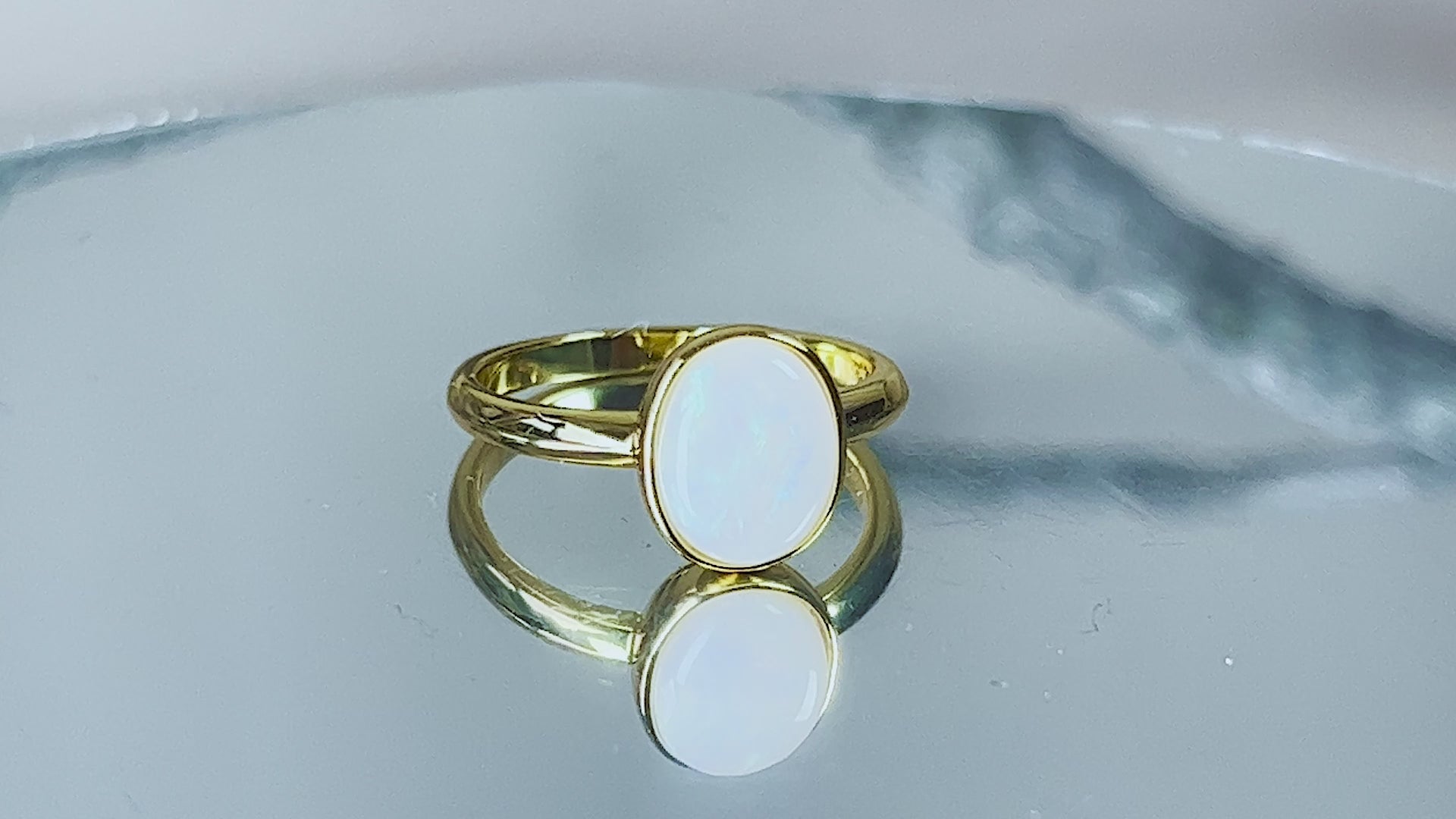 This statement piece is a must-have for any jewelry collection - a gorgeous gold-plated sterling silver ring with a sparkling, bezel-set white opal gem. This minimalist design will make the perfect thoughtful gift for the special woman in your life. Luxurious yet timeless, she'll cherish this stunning jewelry piece for years to come!