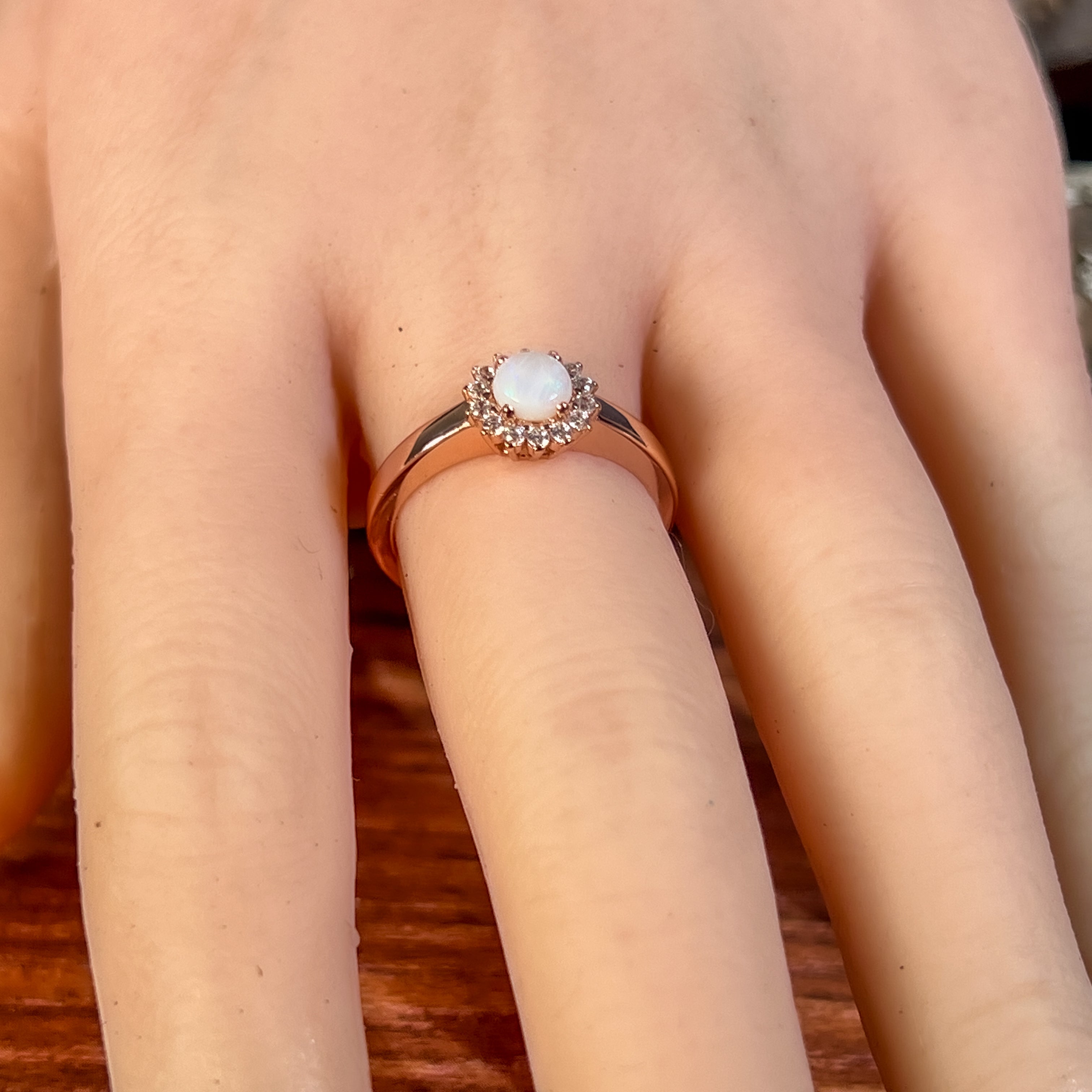 Add a touch of elegance to your jewelry collection with our Rose Gold plated silver cluster ring. The 5mm Round White Opal adds a classic element that will elevate any outfit. Make a statement with this timeless piece!