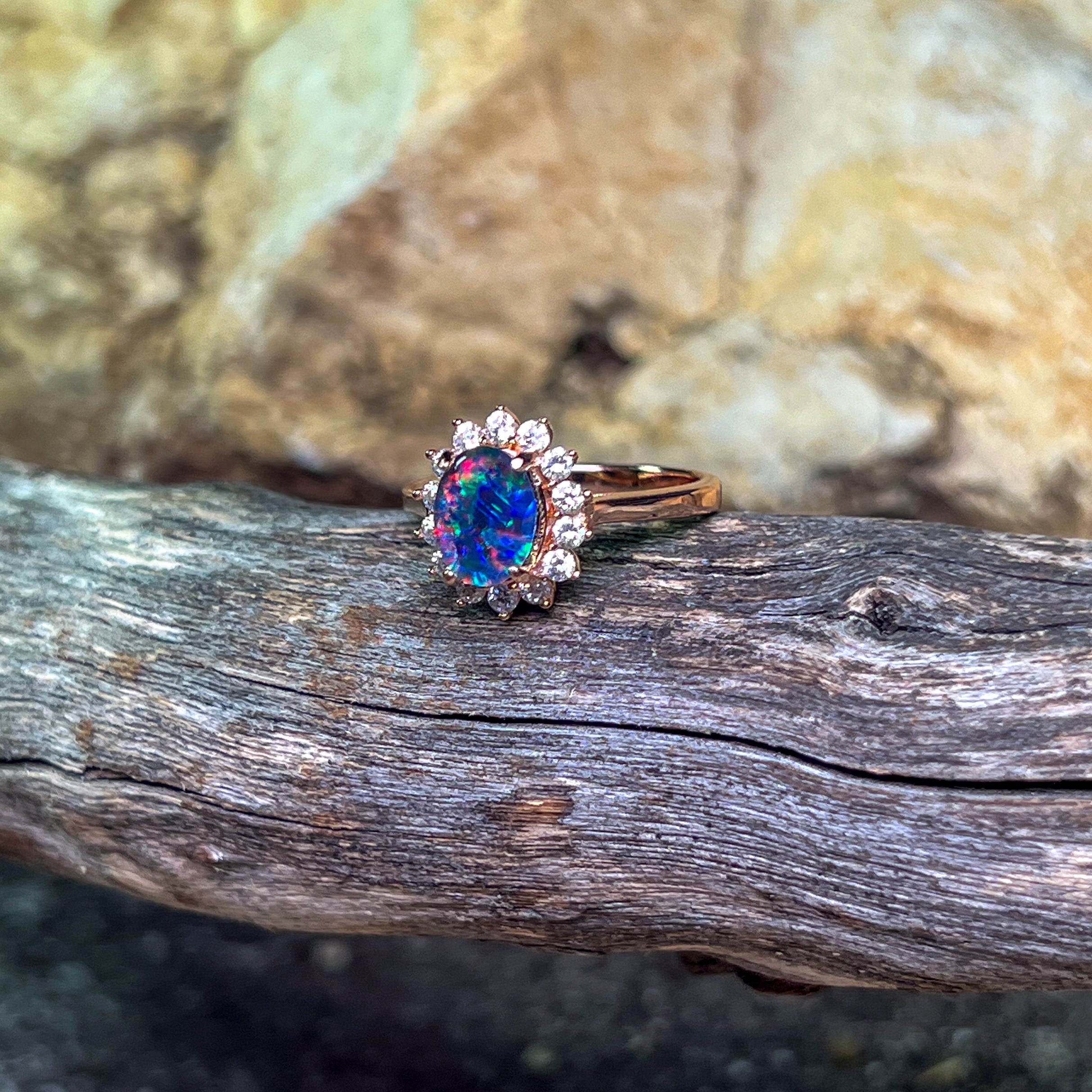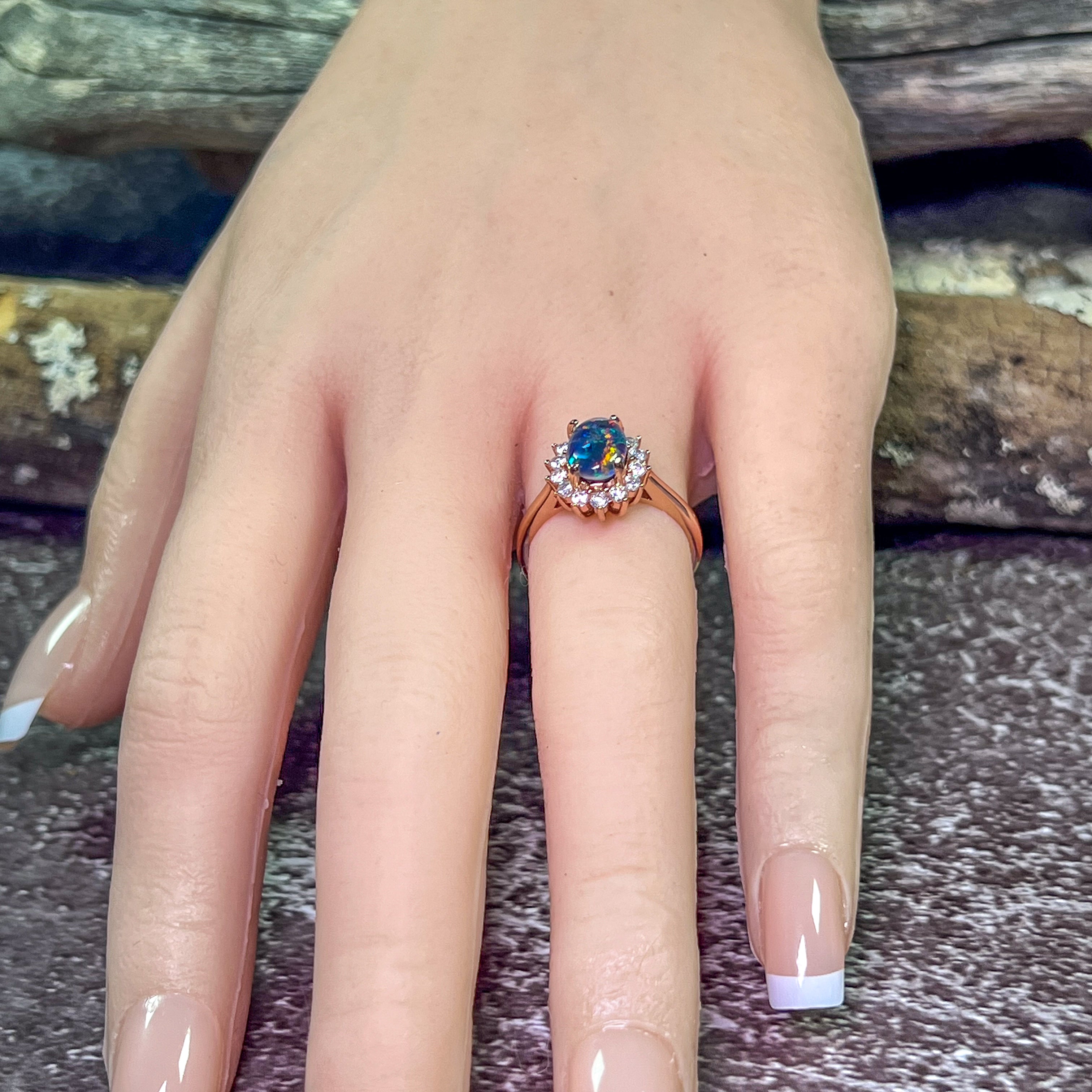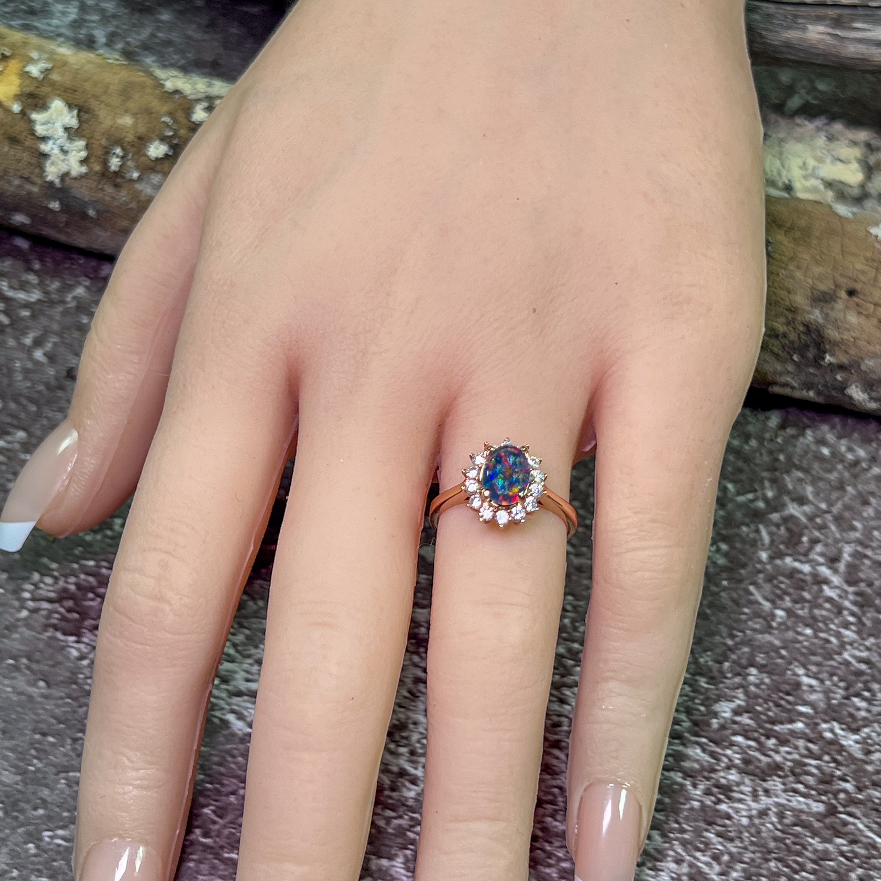 Indulge in luxury with our Rose Gold plated sterling silver 8x6mm cluster ring. Featuring a stunning gold opal birthstone, this ring exudes elegance and sophistication. Elevate any outfit with its unique and timeless design. Fall in love with the beauty and exclusivity of this piece.