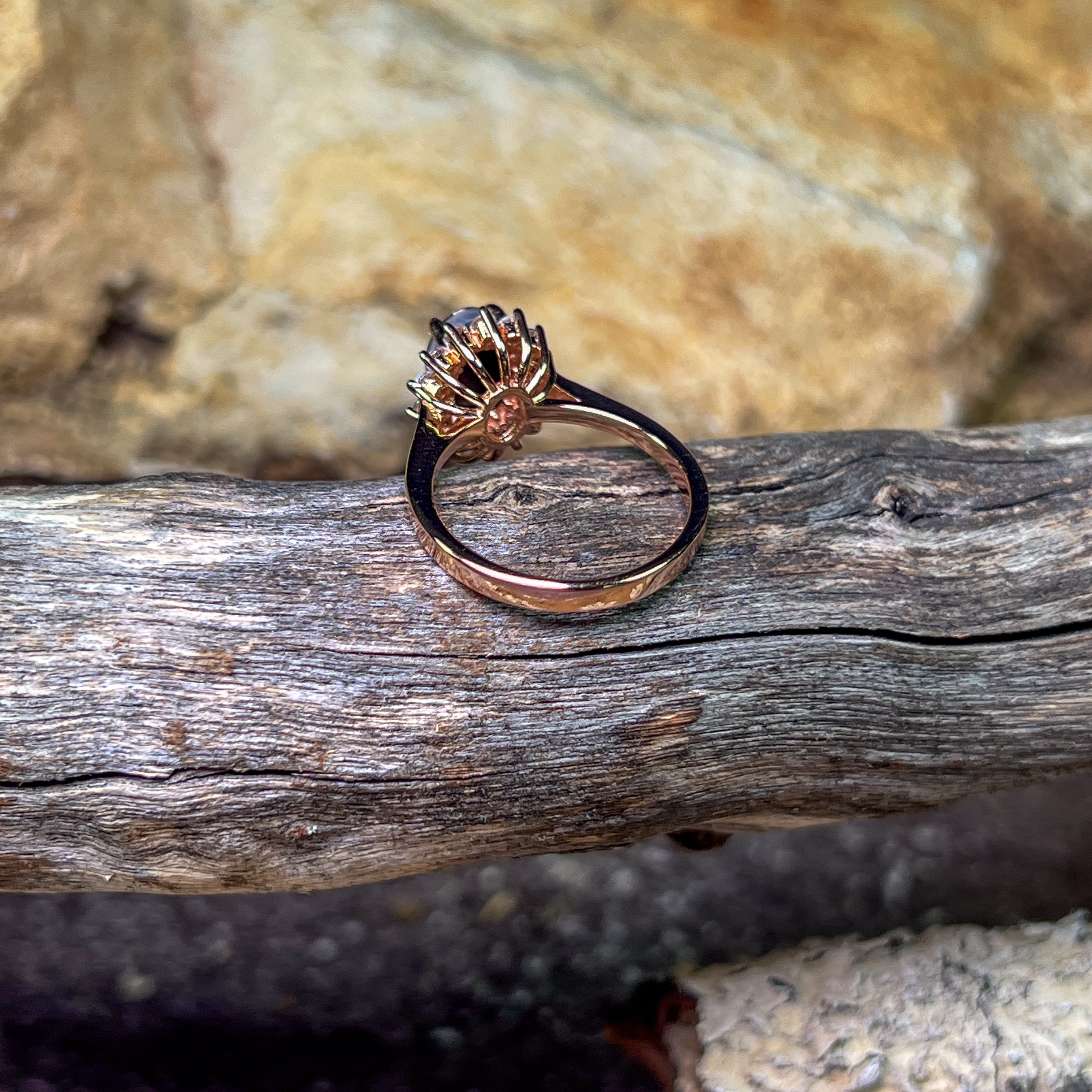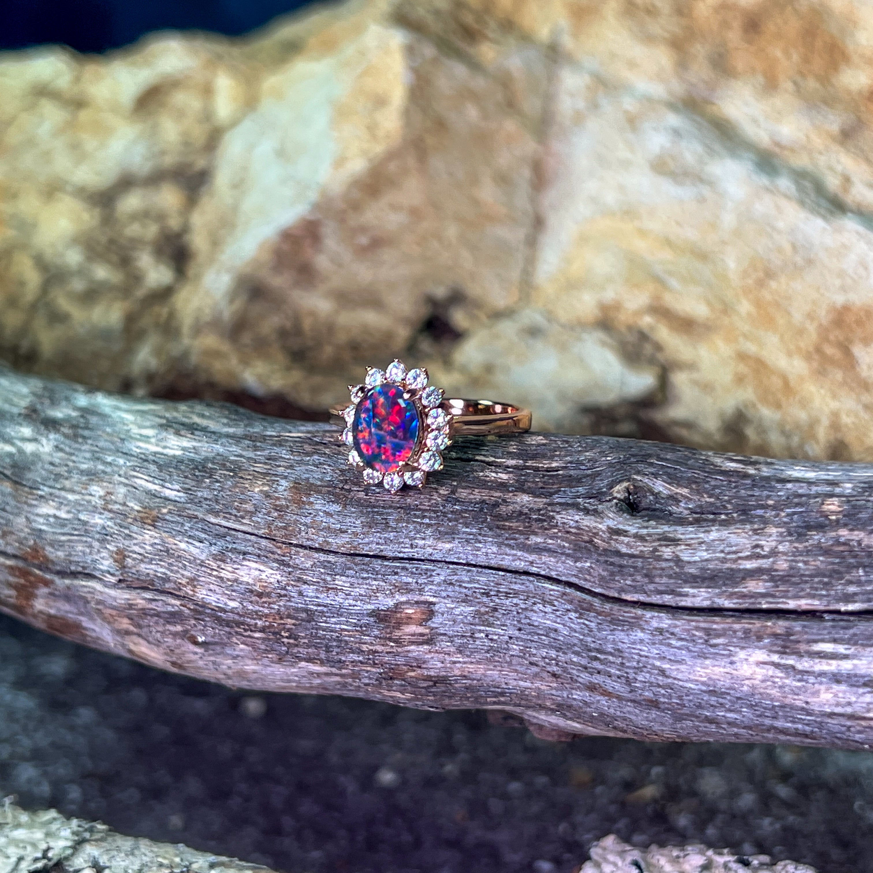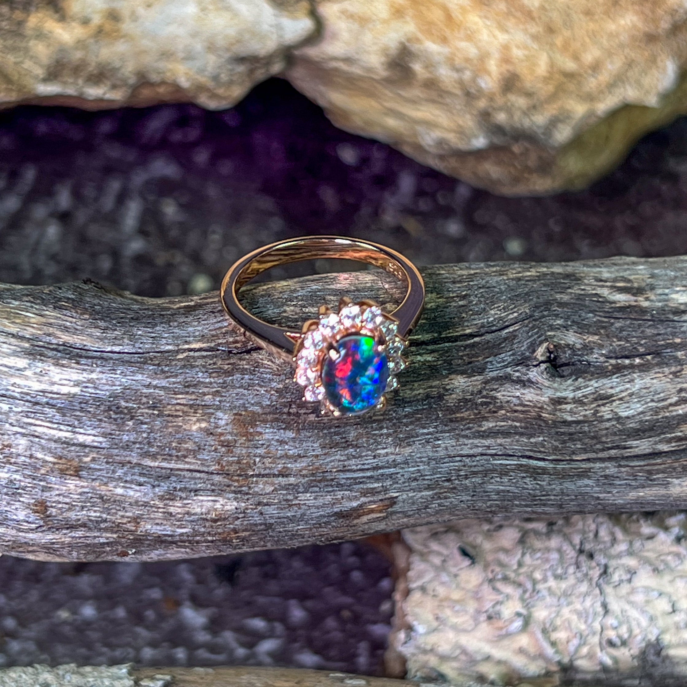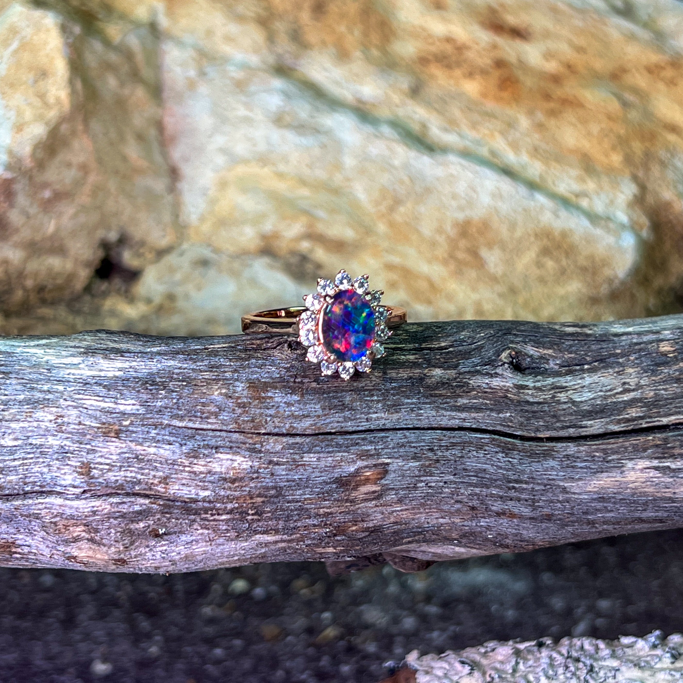 Indulge in luxury with our Rose Gold plated sterling silver 8x6mm cluster ring. Featuring a stunning gold opal birthstone, this ring exudes elegance and sophistication. Elevate any outfit with its unique and timeless design. Fall in love with the beauty and exclusivity of this piece.