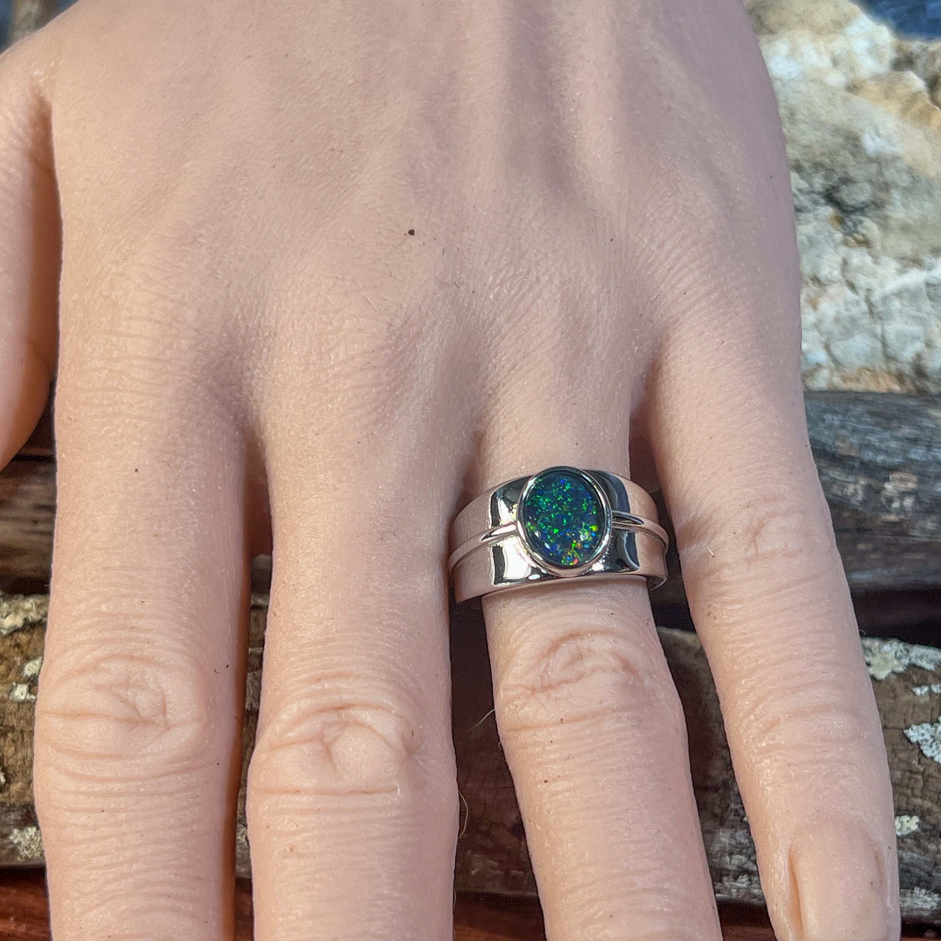 Sterling Silver 11x9mm Opal triplet graduating band step shape ring
