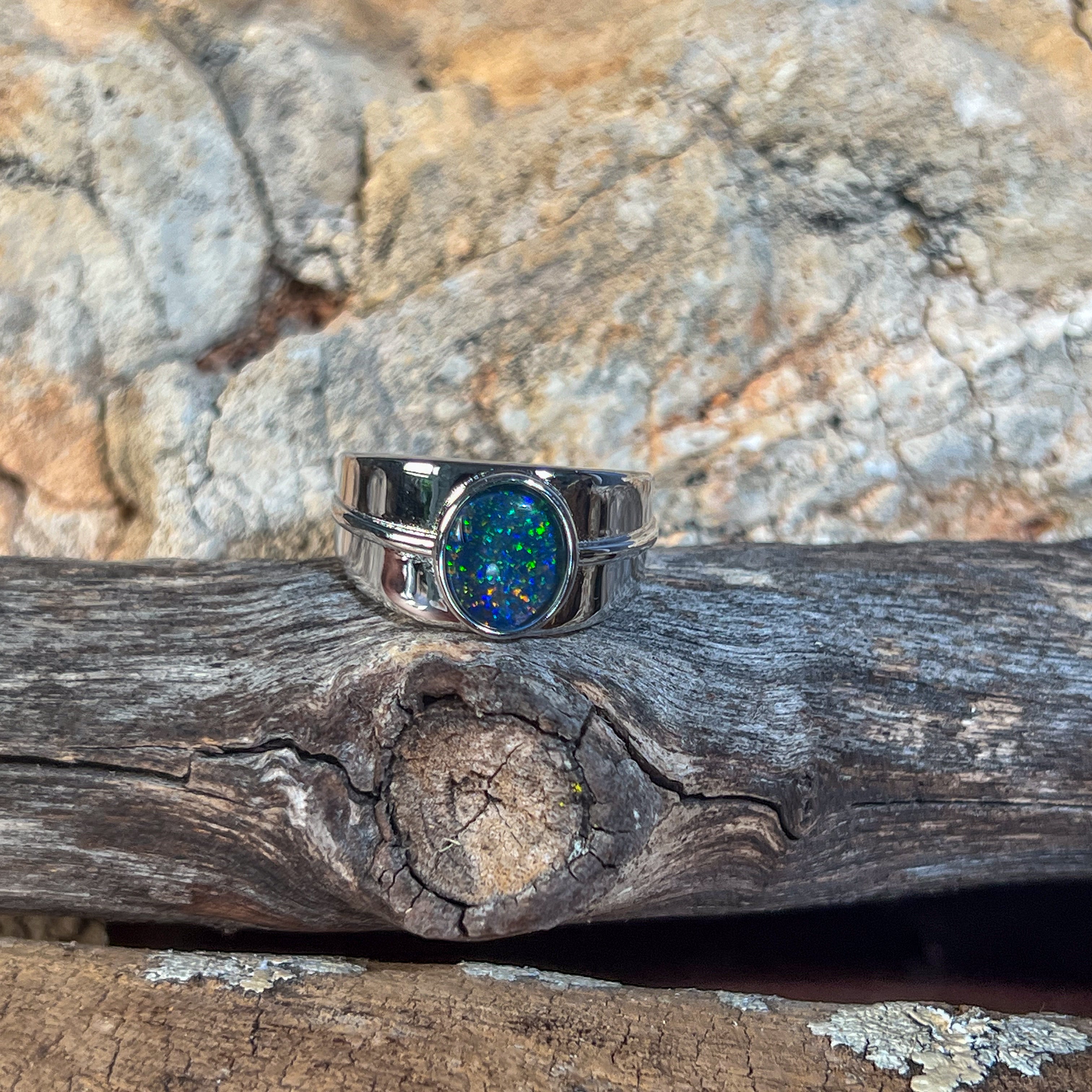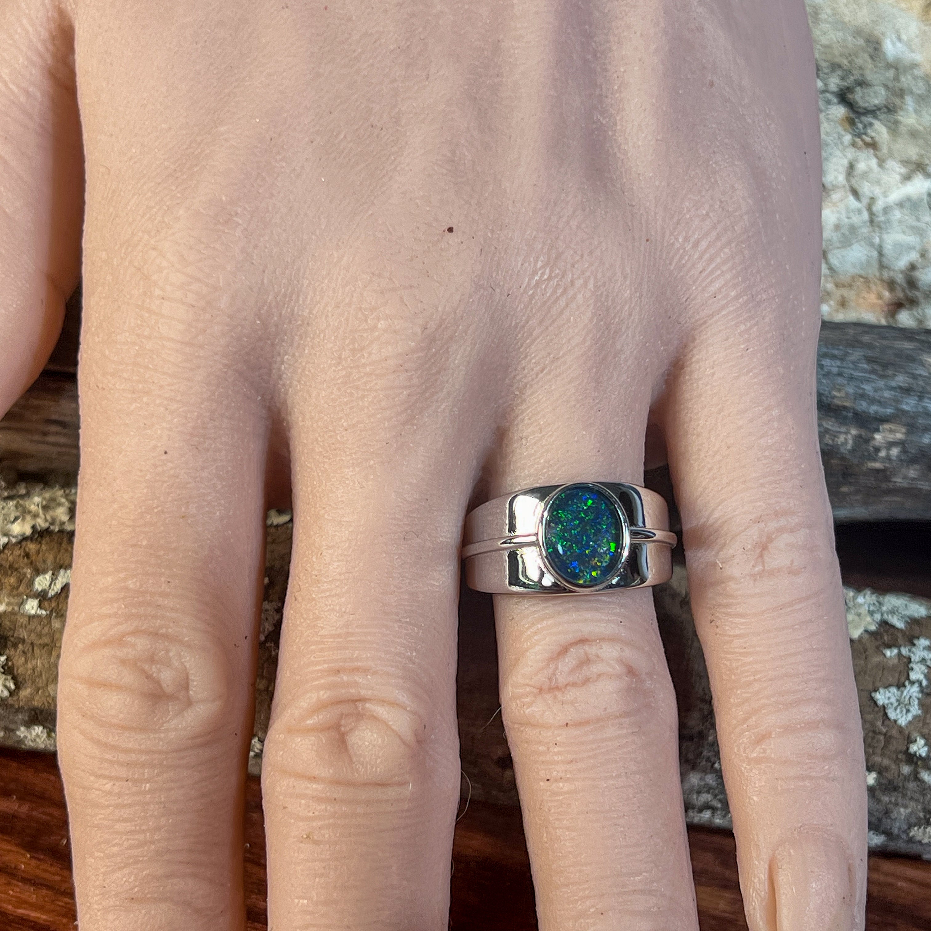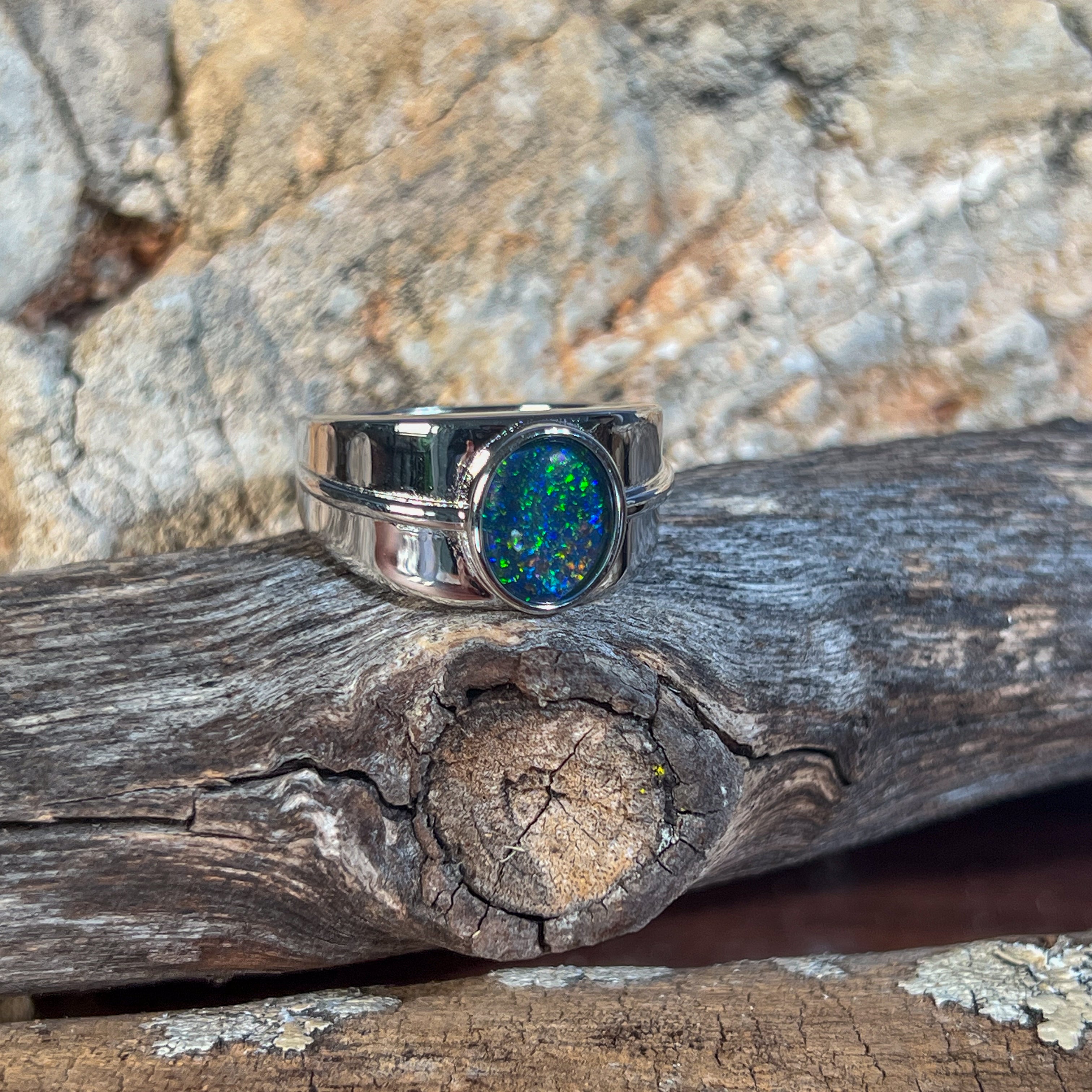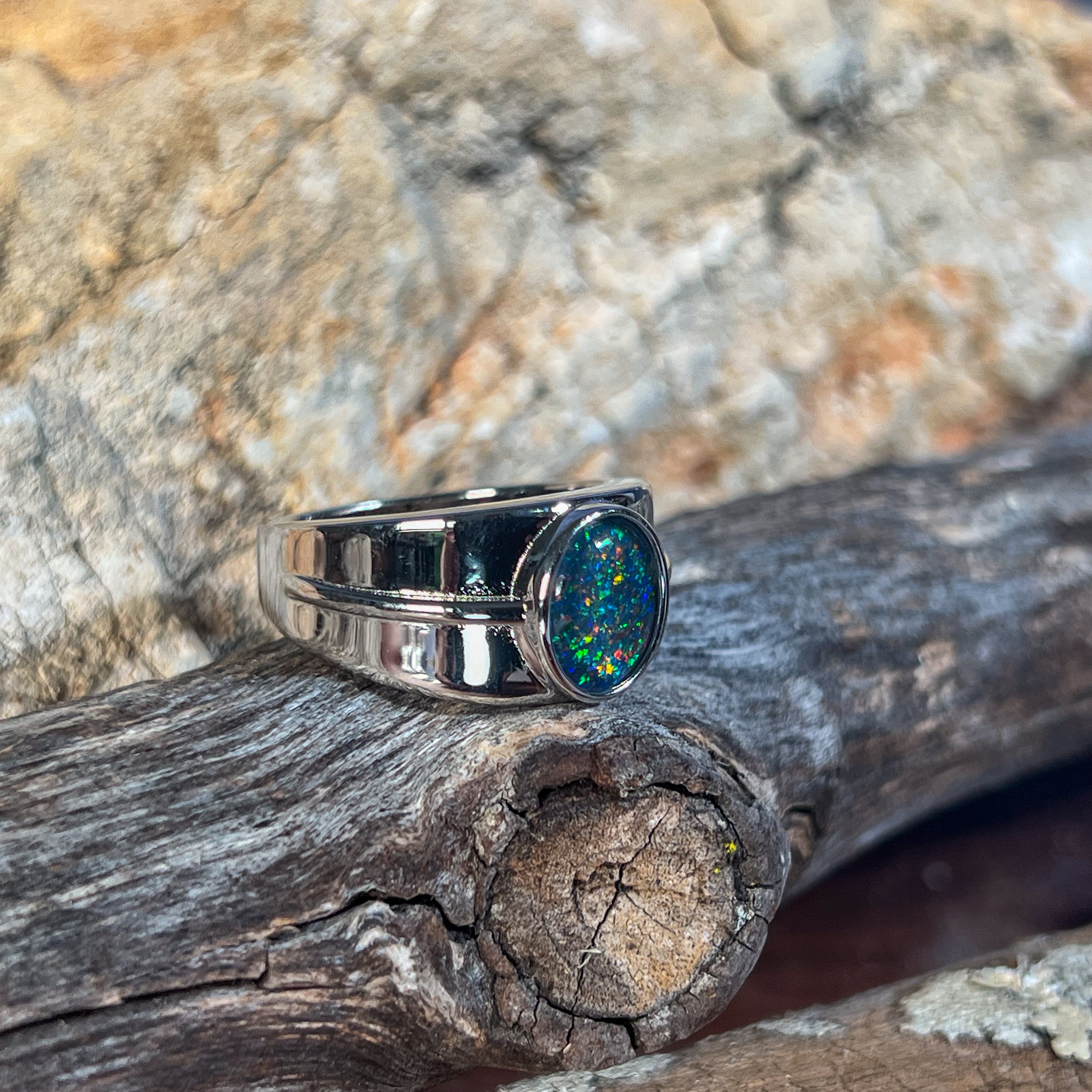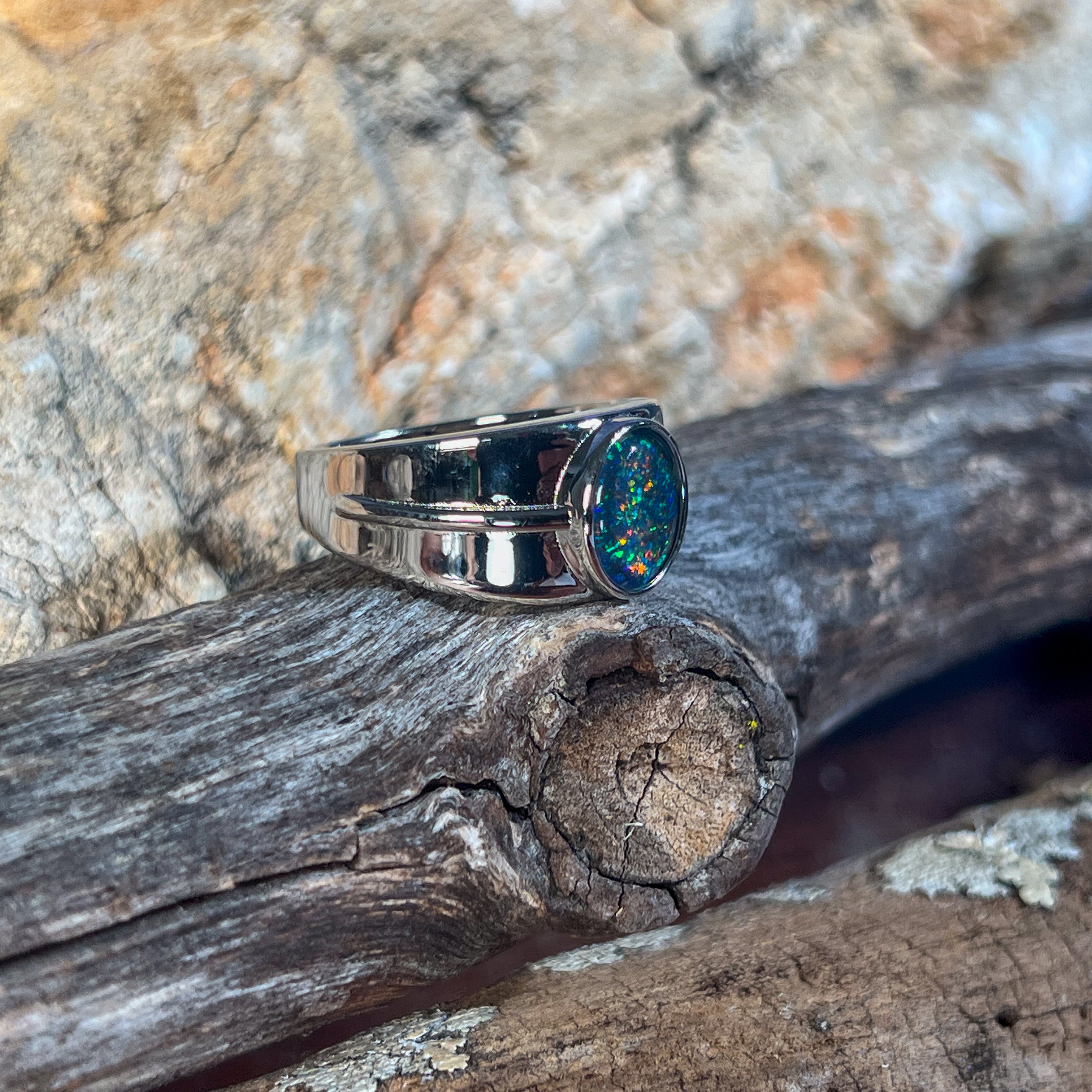 Experience the luxurious shine and sophisticated style of our Sterling Silver Opal Triplet Ring. This broad tapered ring features a unique step shape and a graduating design, perfectly crafted for the modern gentleman. Add a touch of elegance to any outfit with this stunning piece.