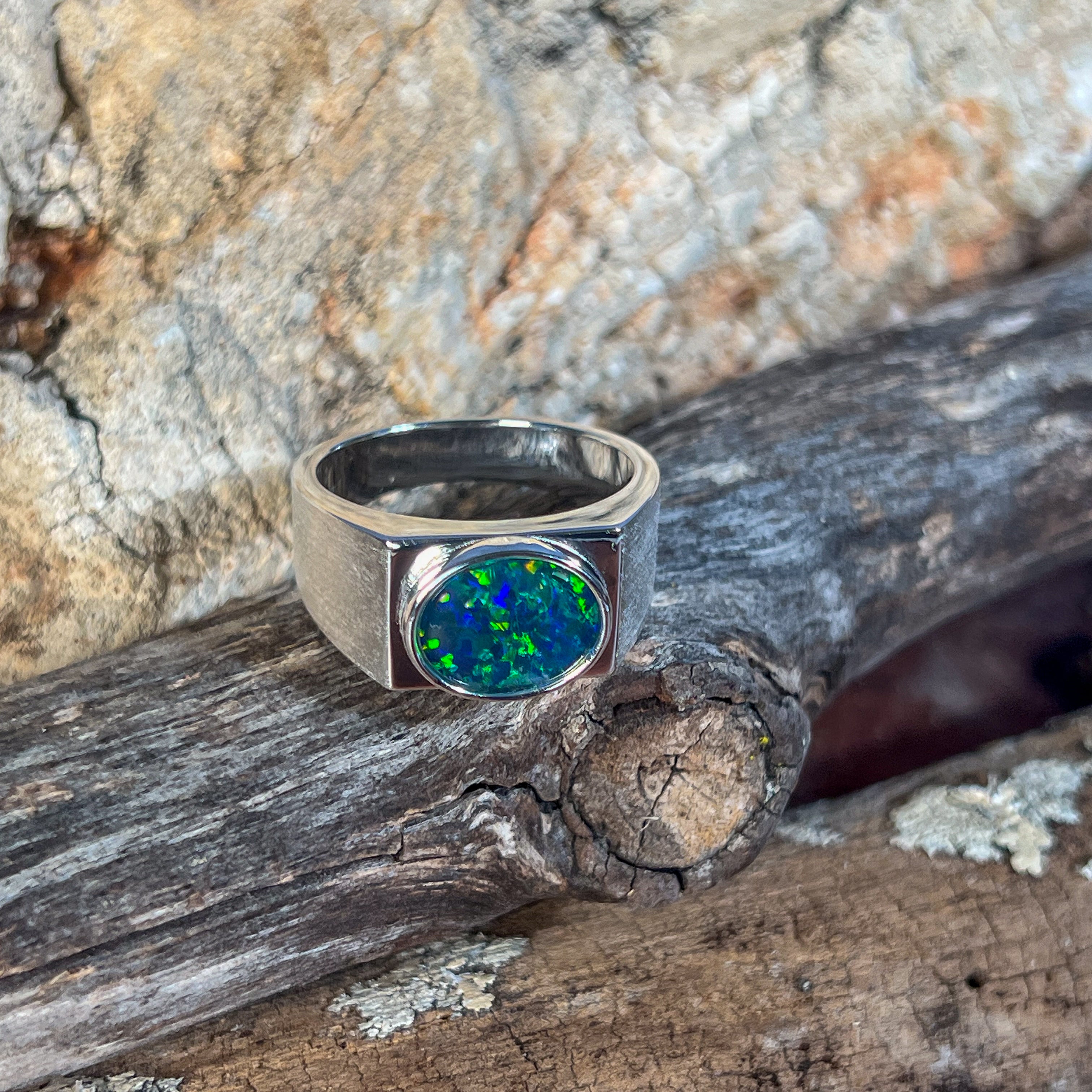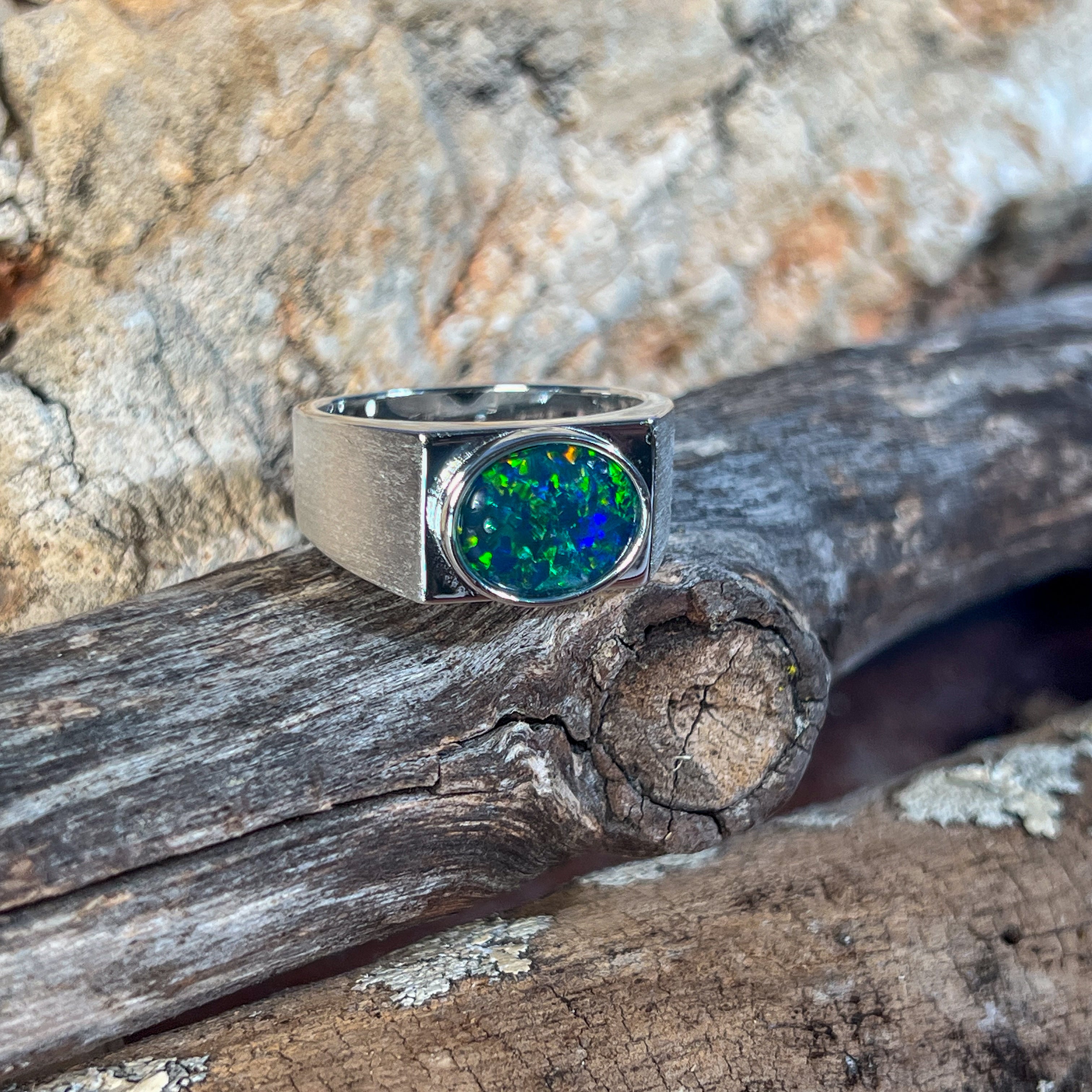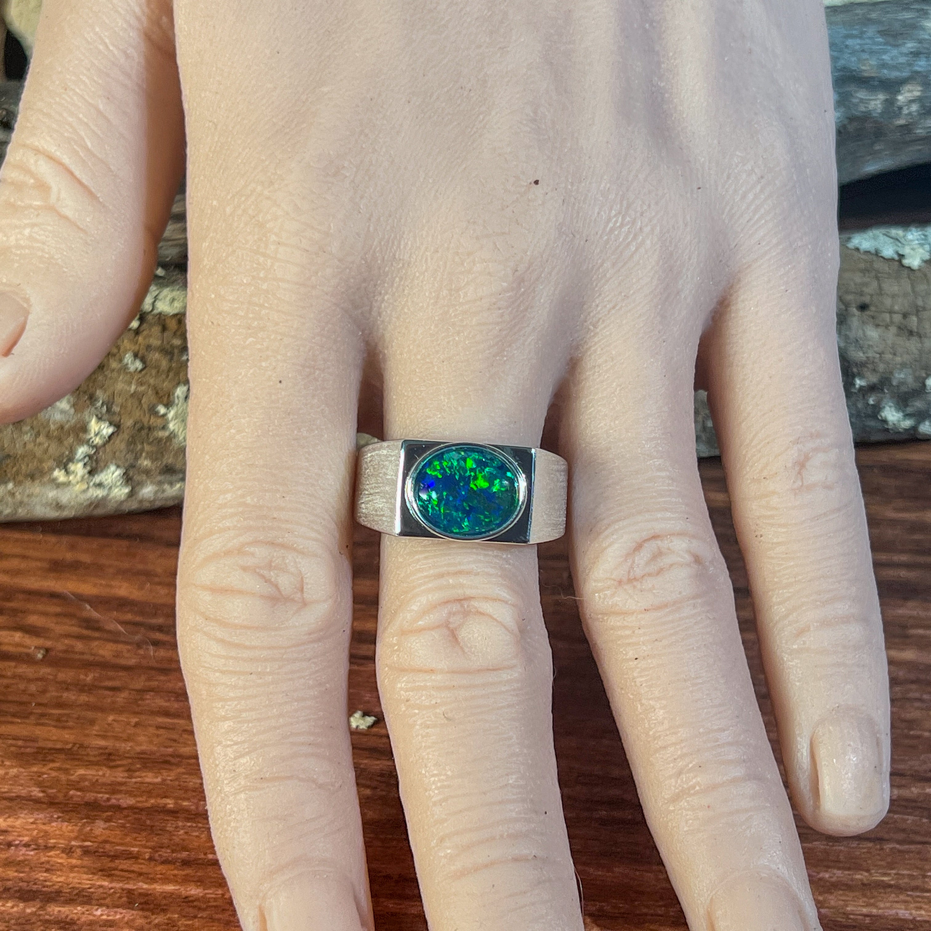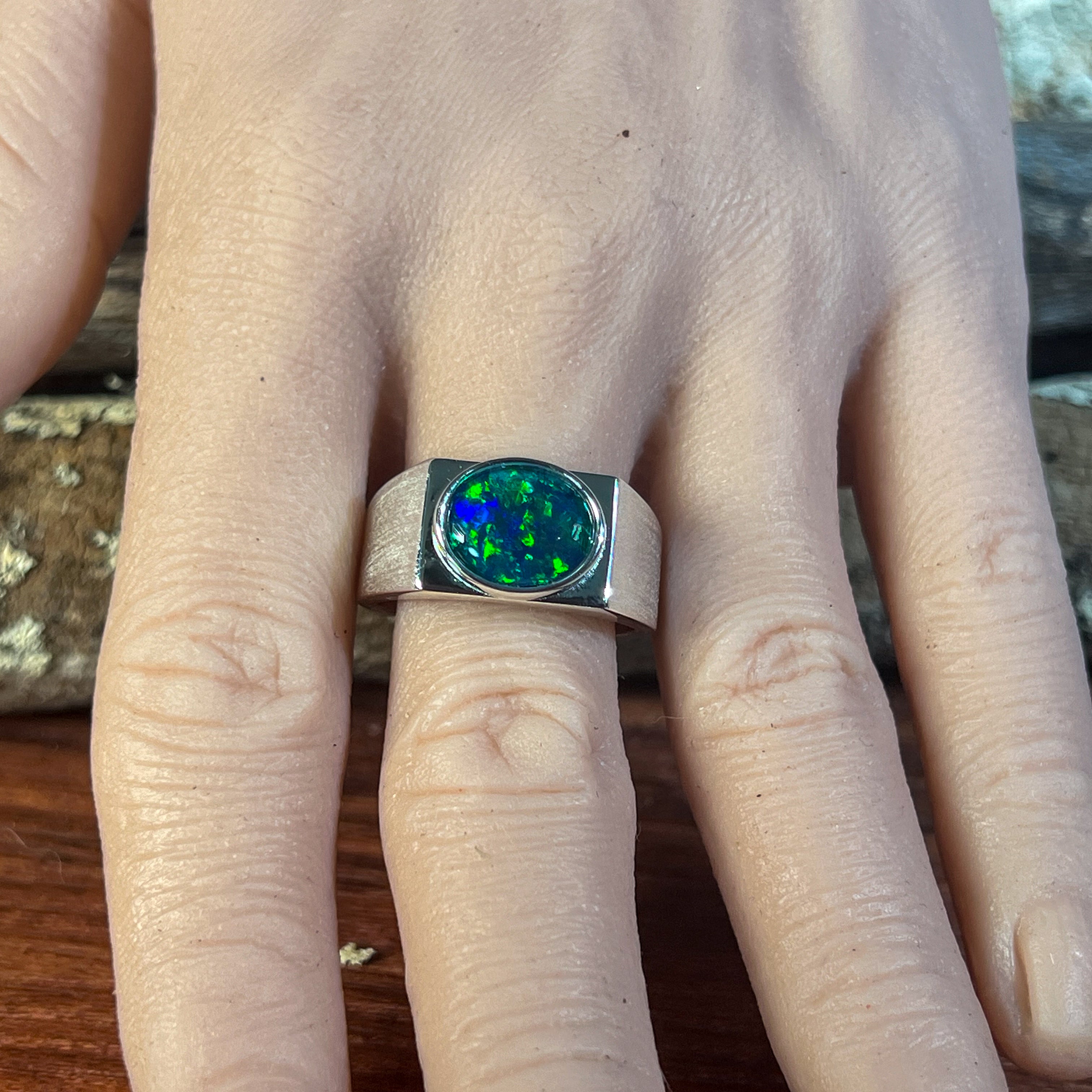 Unleash your unique sense of style with our Sterling Silver Opal Triplet Rectangular Ring. The broad rectangular shape is perfect for men and the matte finish adds a touch of sophistication. This ring is a must-have accessory for those who want to make a bold statement!