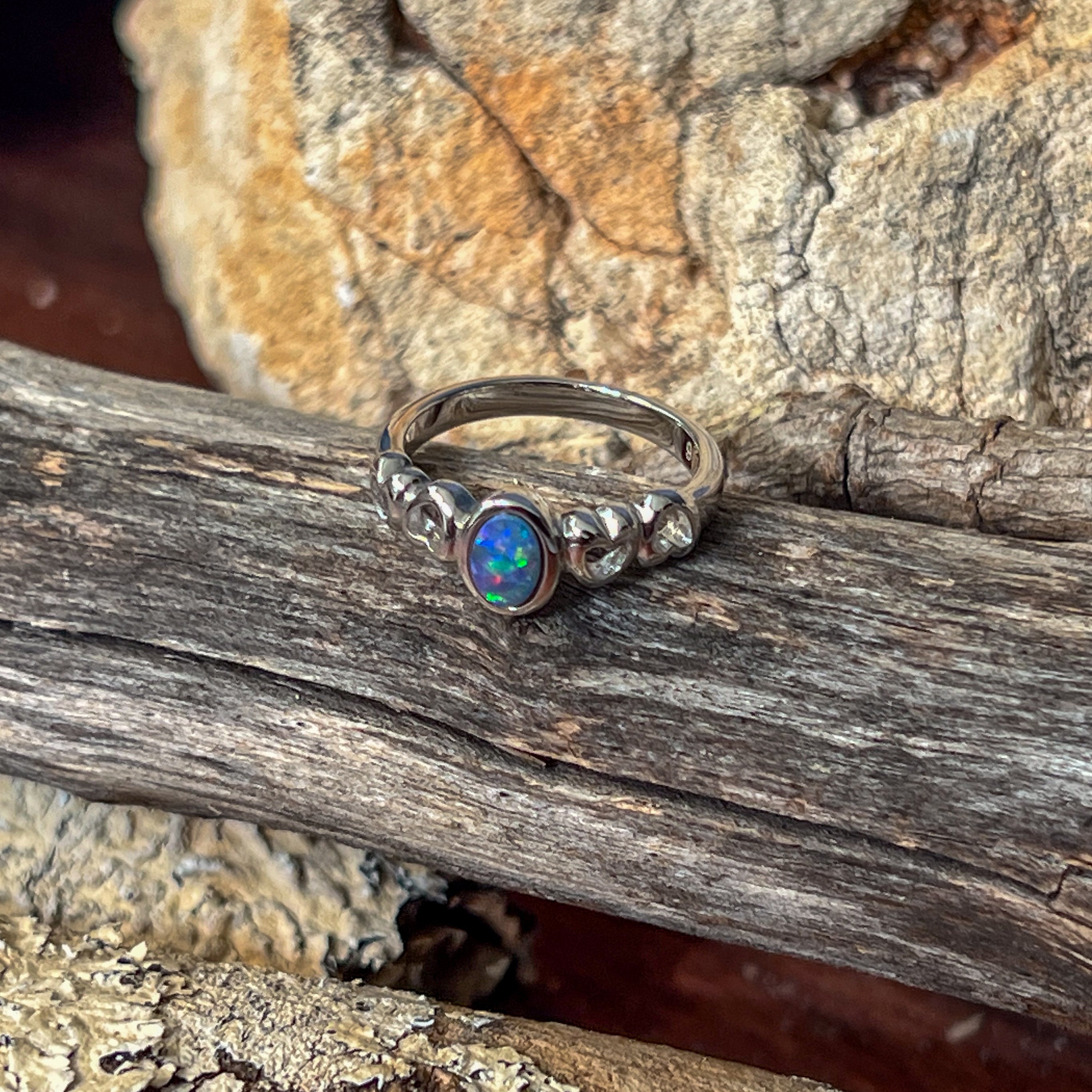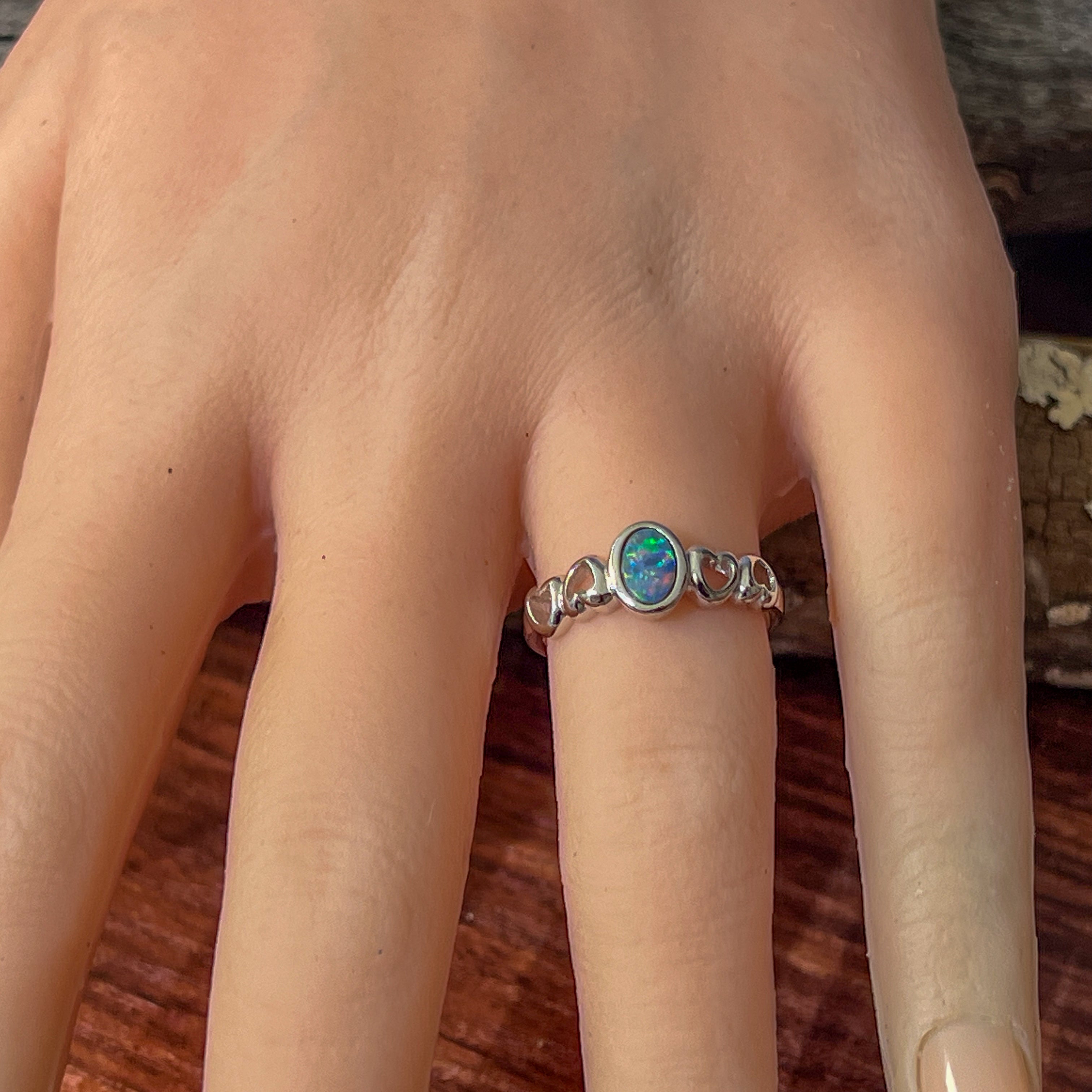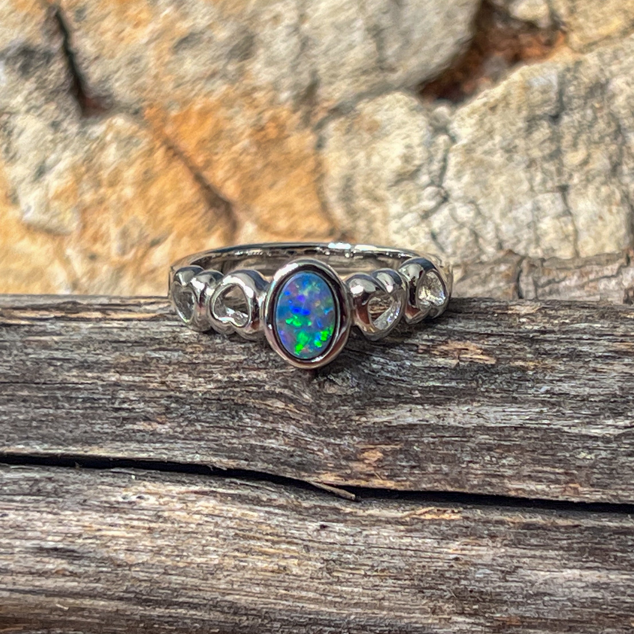 Add a touch of whimsy to your style with this sterling silver ring featuring a charming 6x4mm opal doublet nestled within a playful heart cut-out design. Its sparkling opal brings vibrant colors to life, making every gesture shine with joy and personality. Perfect for those who love a little fun and sparkle on their fingers!