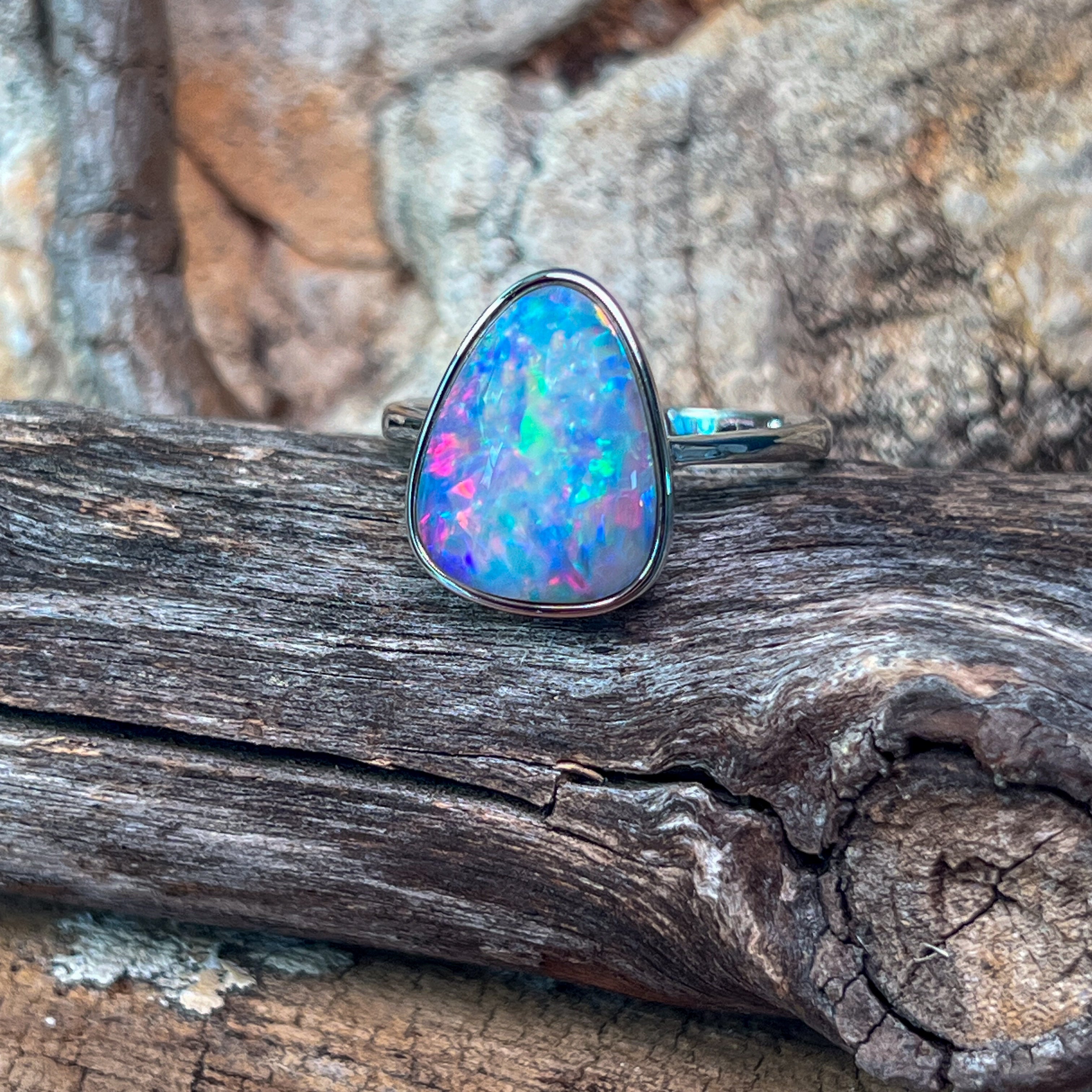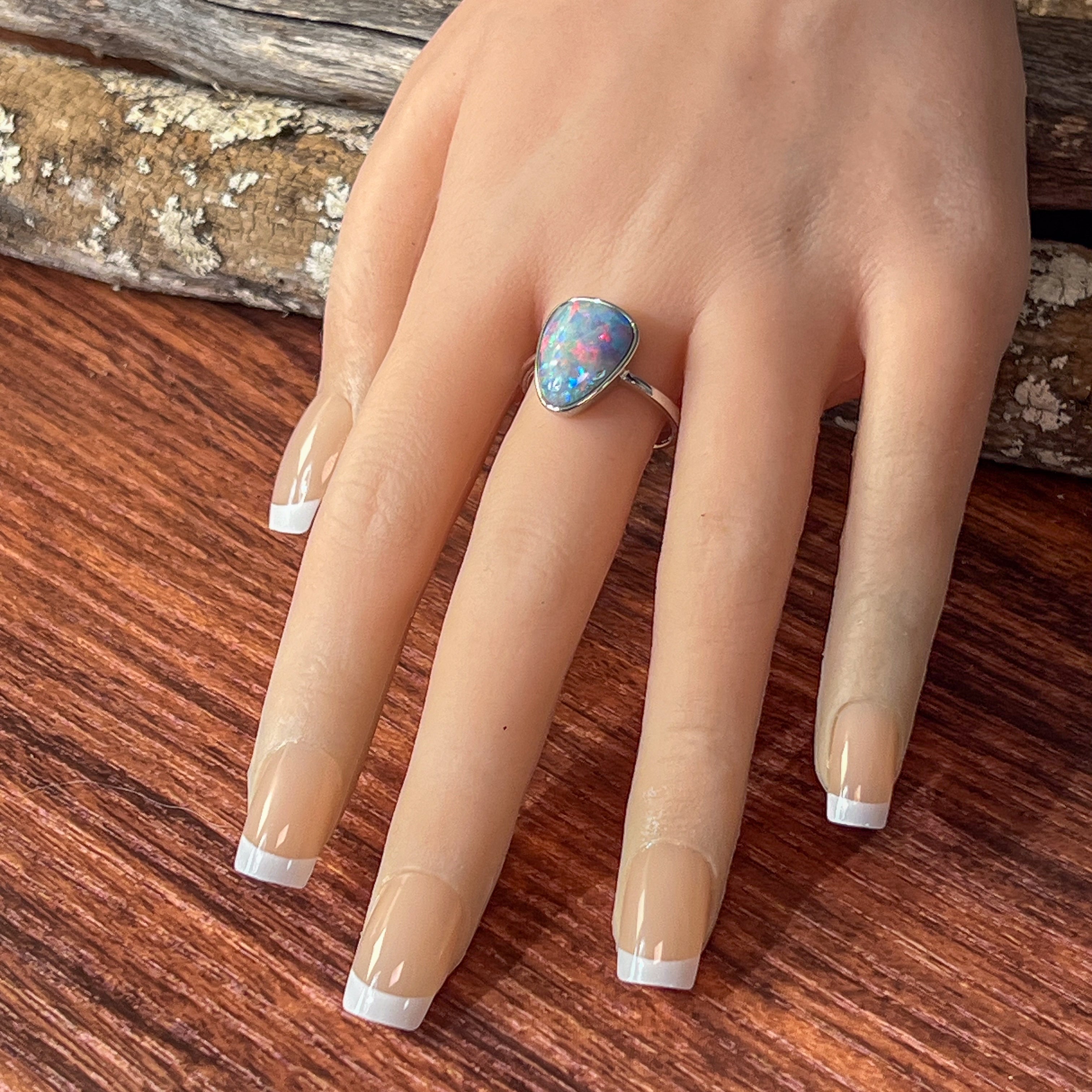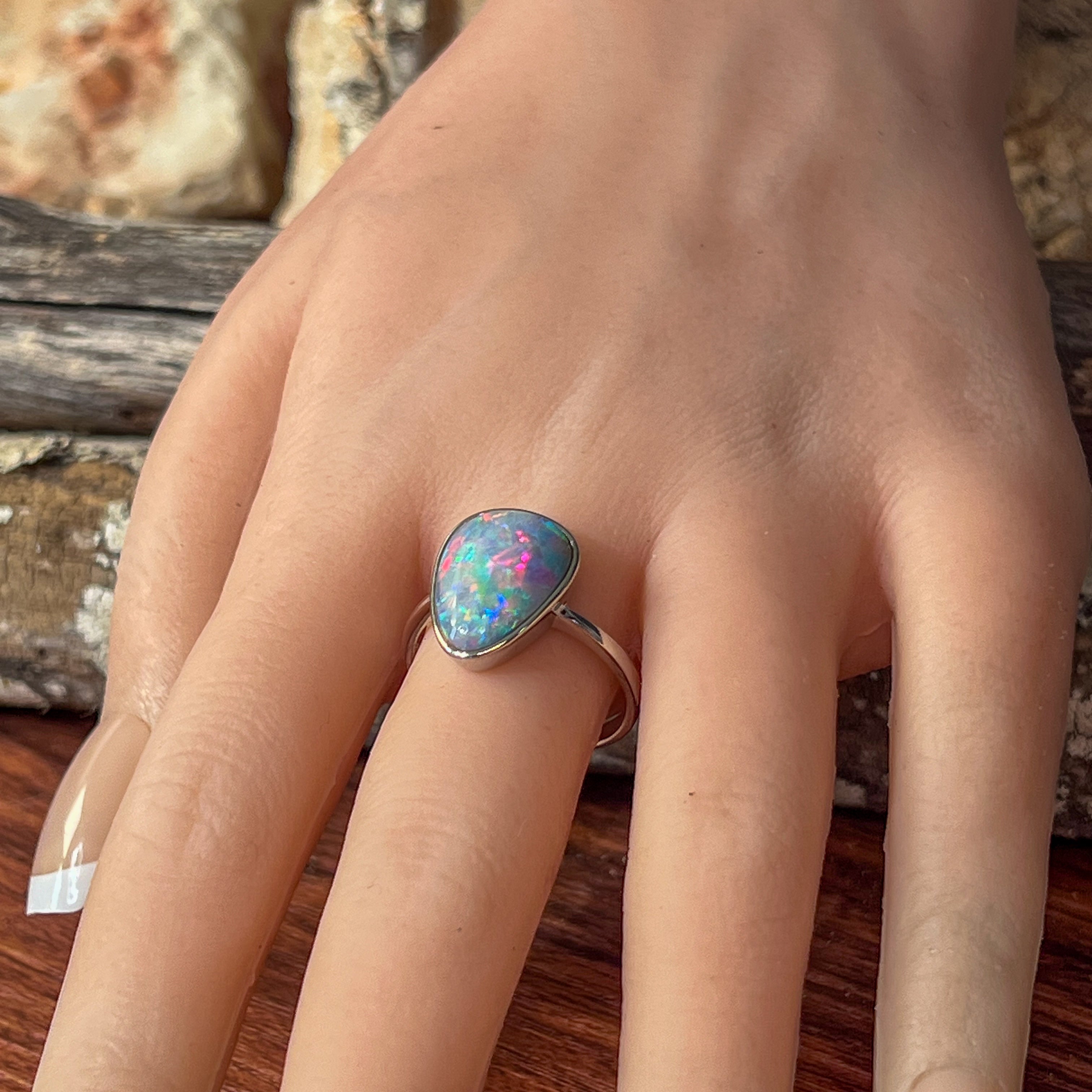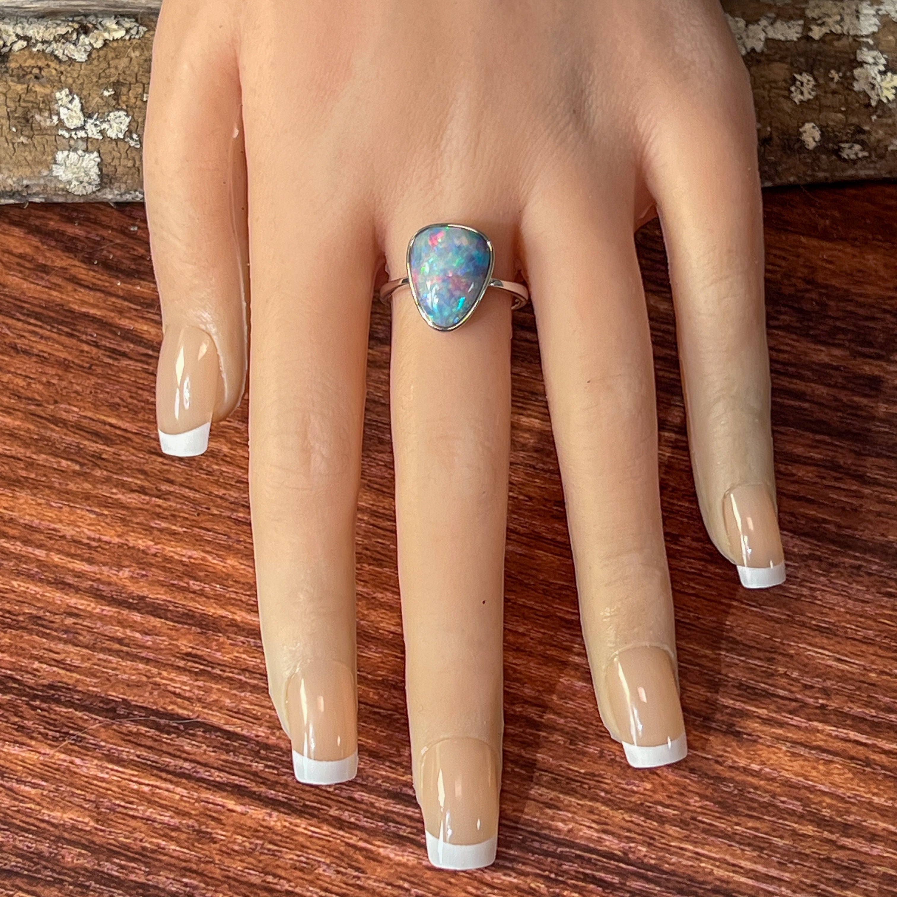 Sterling Silver bezel set Opal Doublet curved solitaire triangle shape ring