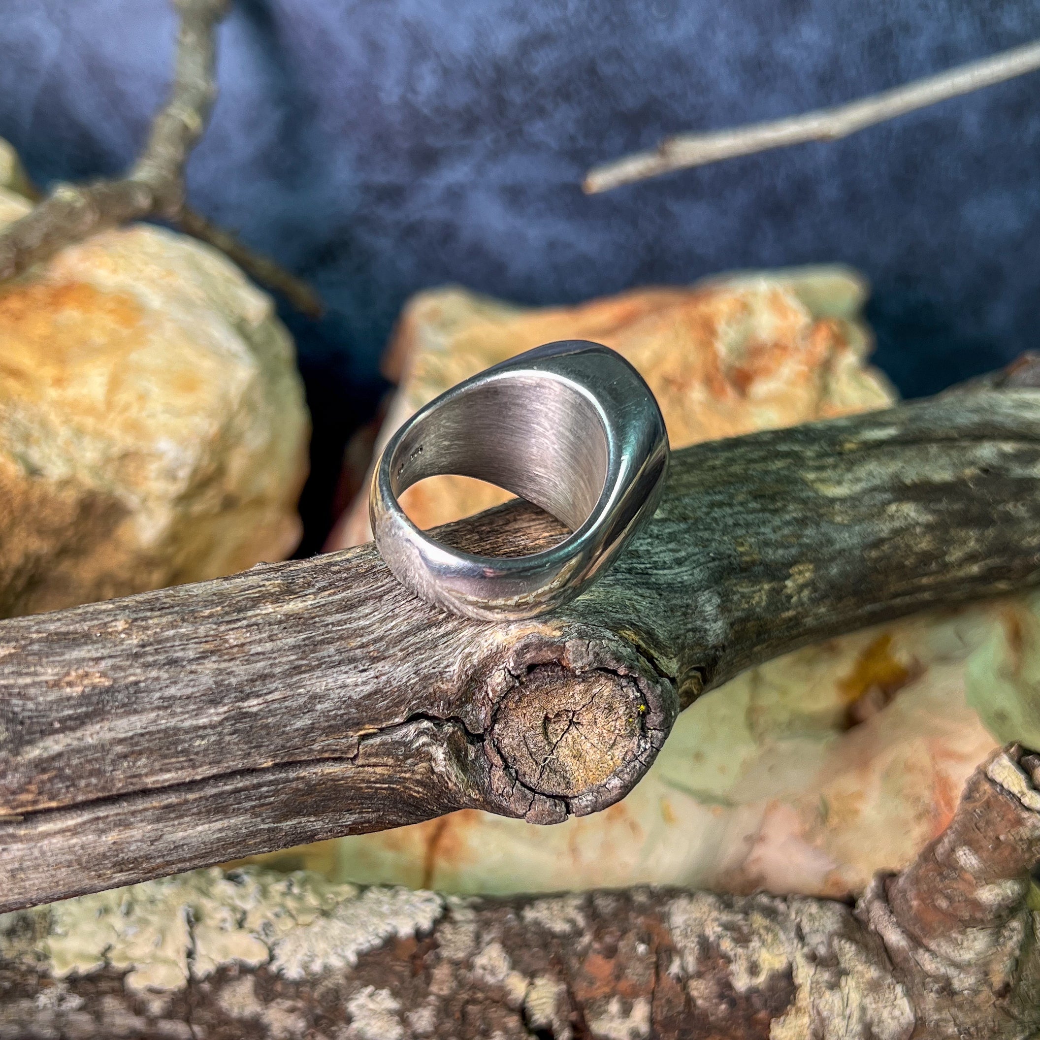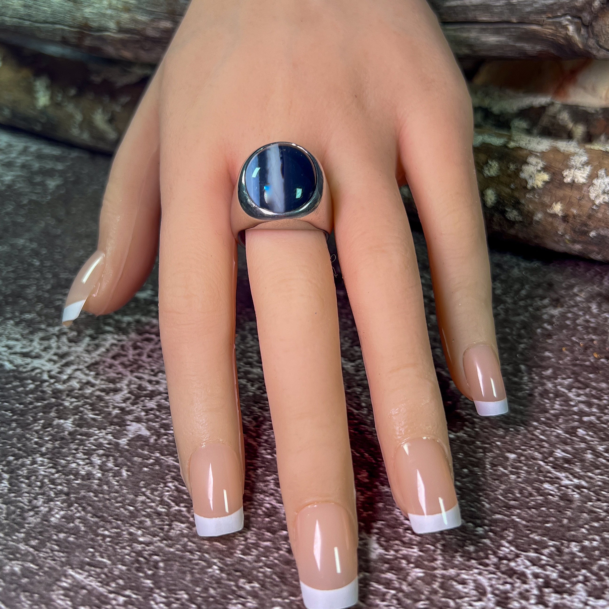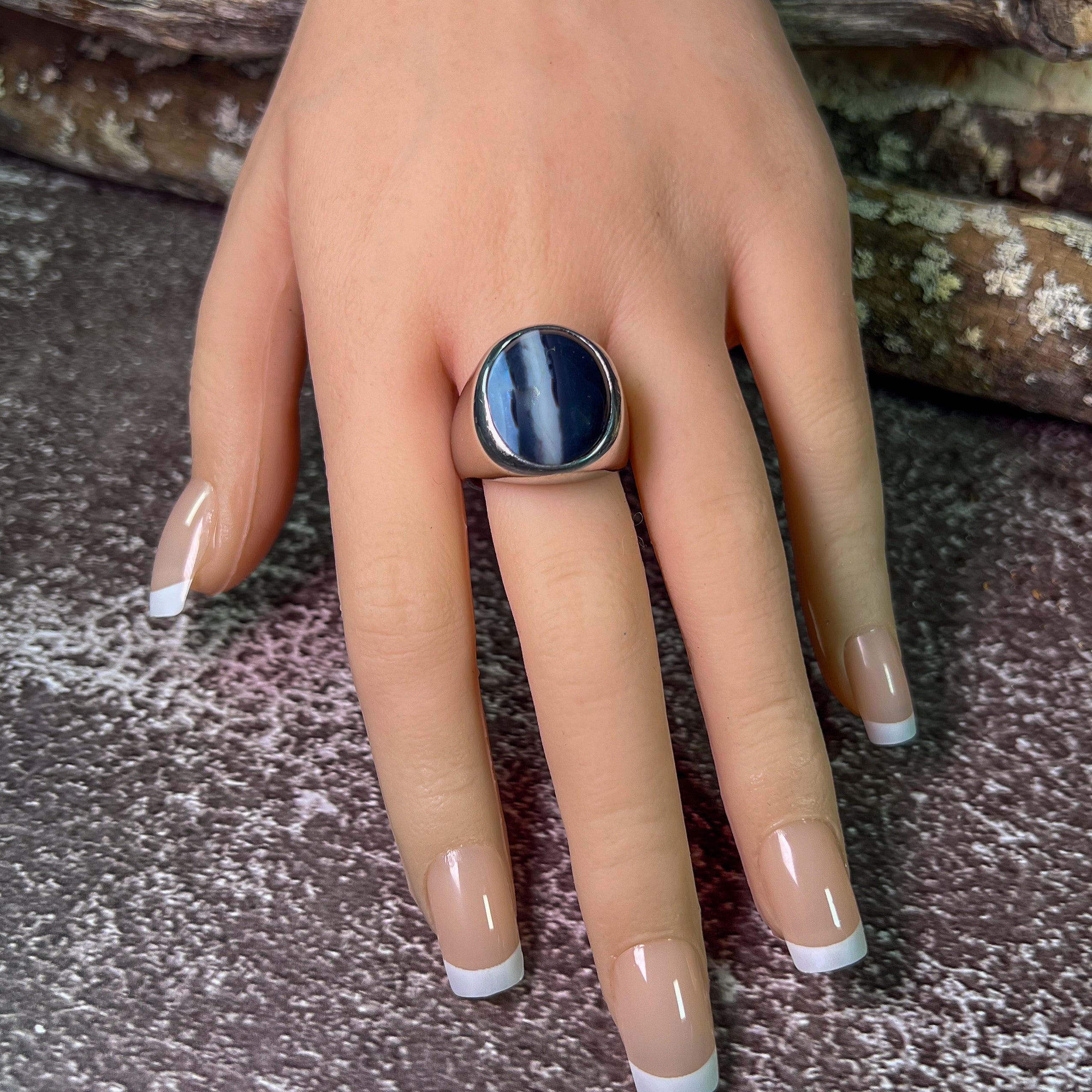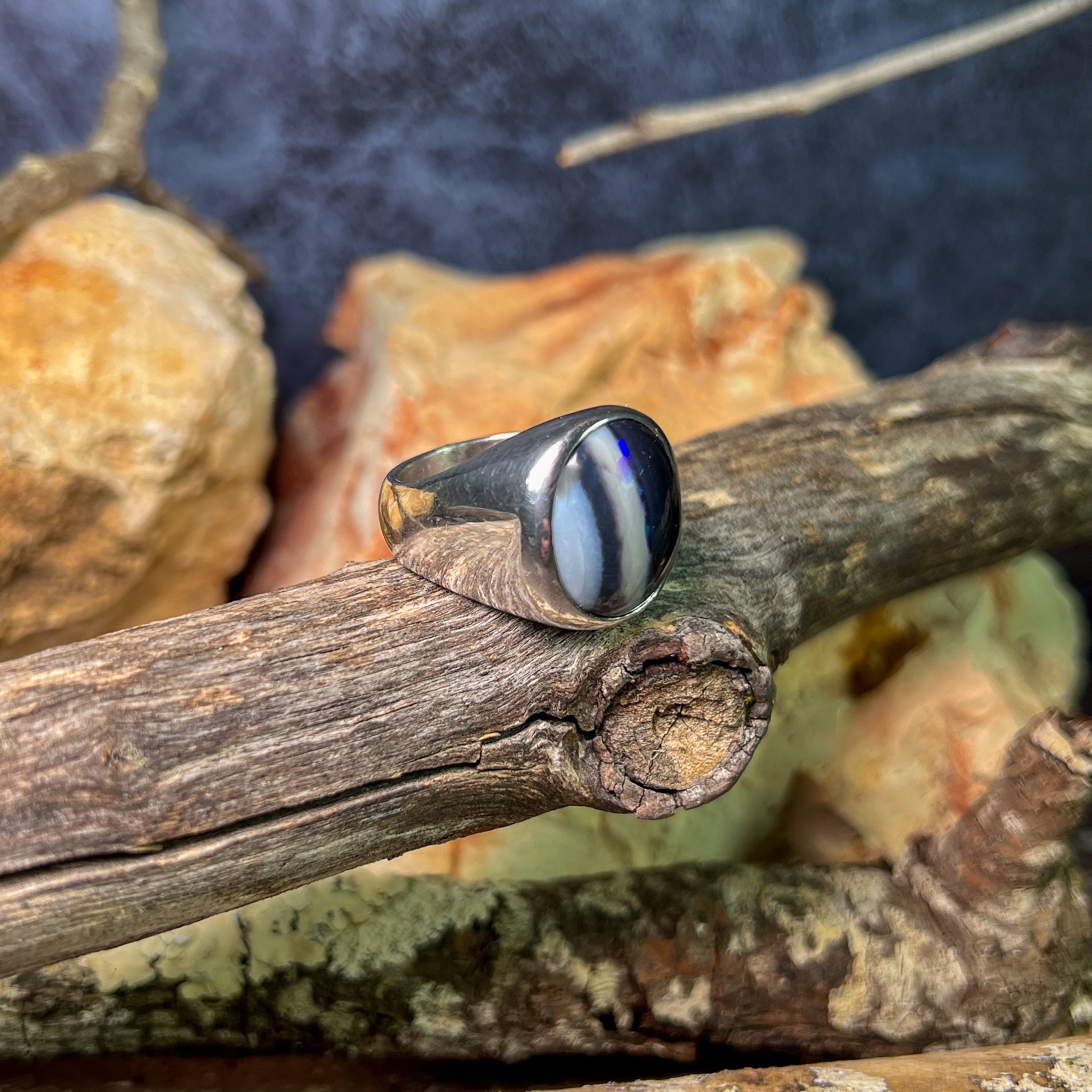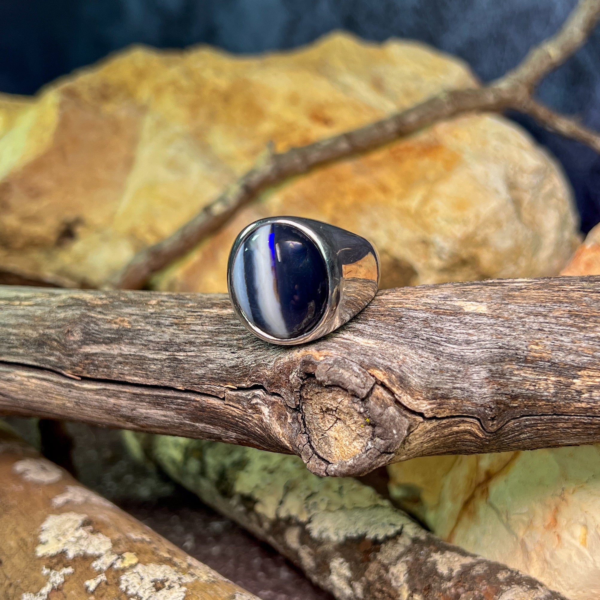 Elevate your style with this sleek Sterling Silver Black Opal ring. Crafted for him, this mens ring features a stunning black opal that will add a touch of sophistication to any outfit. Upgrade your jewelry collection with this unique and timeless piece.