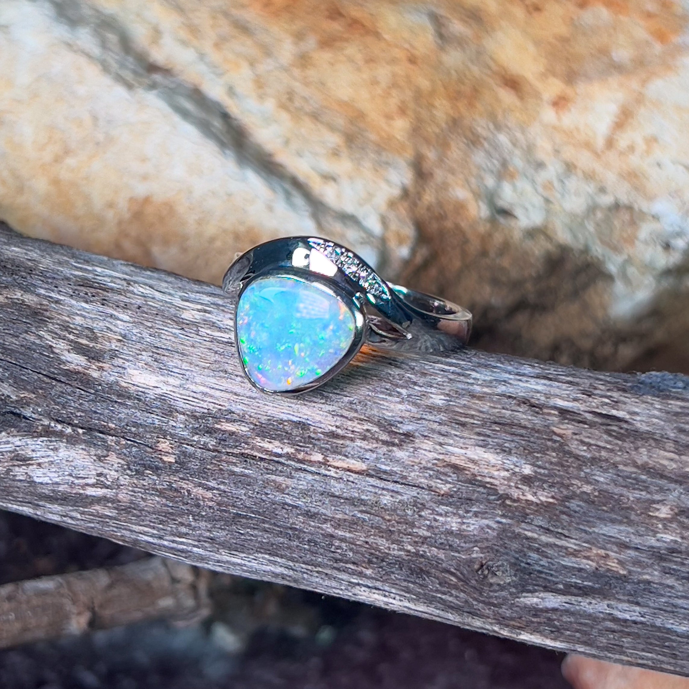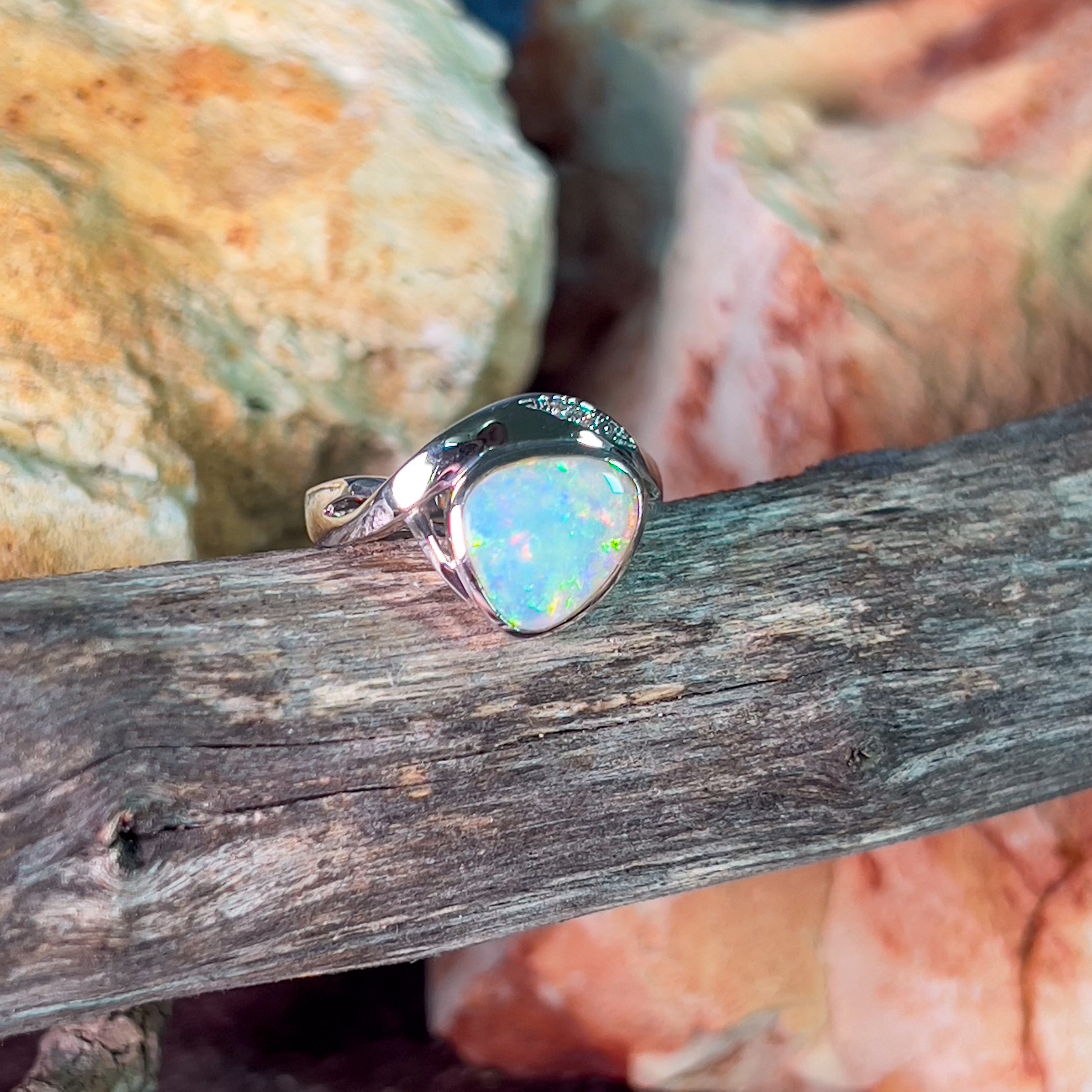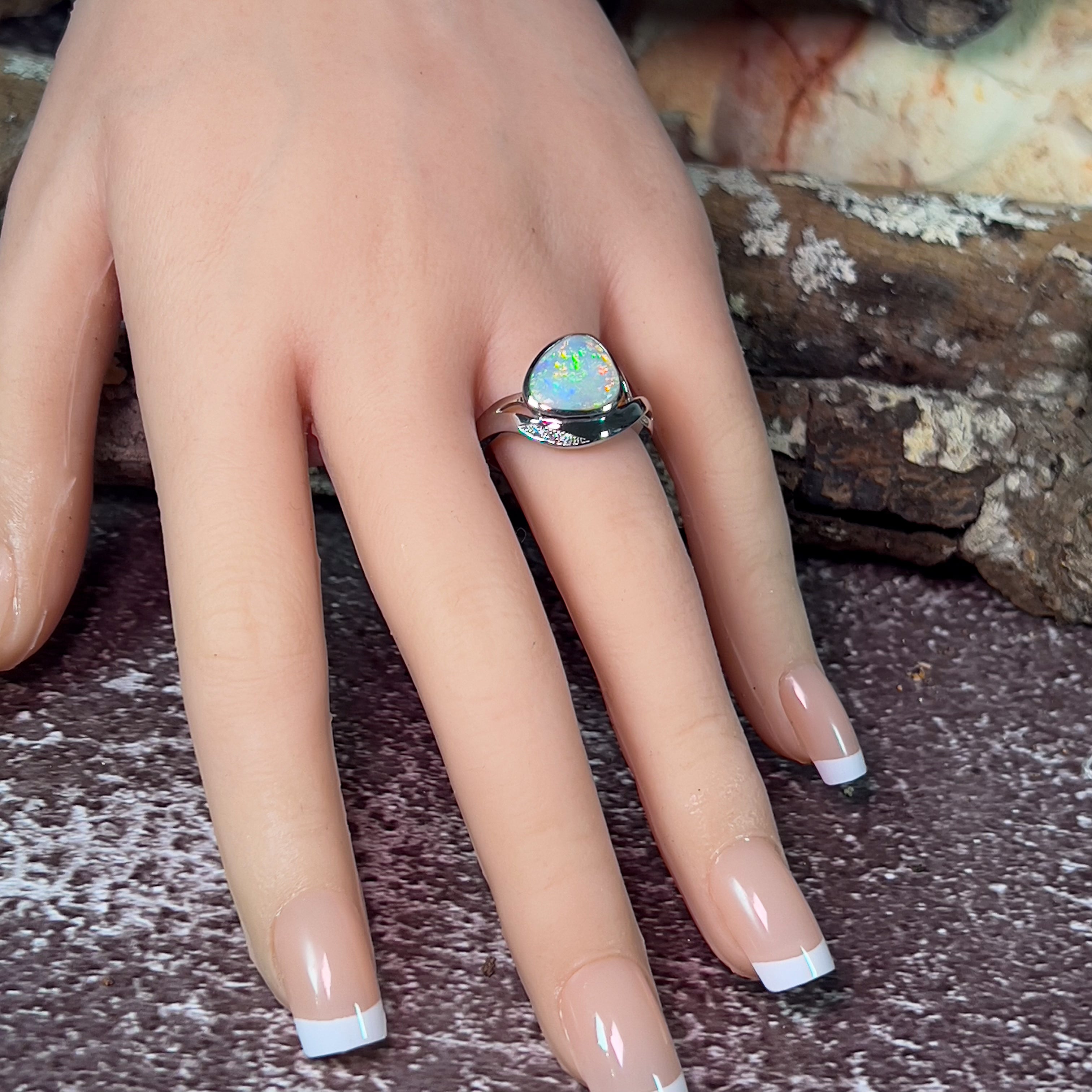 Experience the brilliance of our Sterling Silver Freeform Crystal Opal and CZ Ring! The stunning teal hue of the opal is complemented by sparkling cubic zirconia in a unique freeform design. Add a touch of elegance and color to your accessory game with this statement piece.