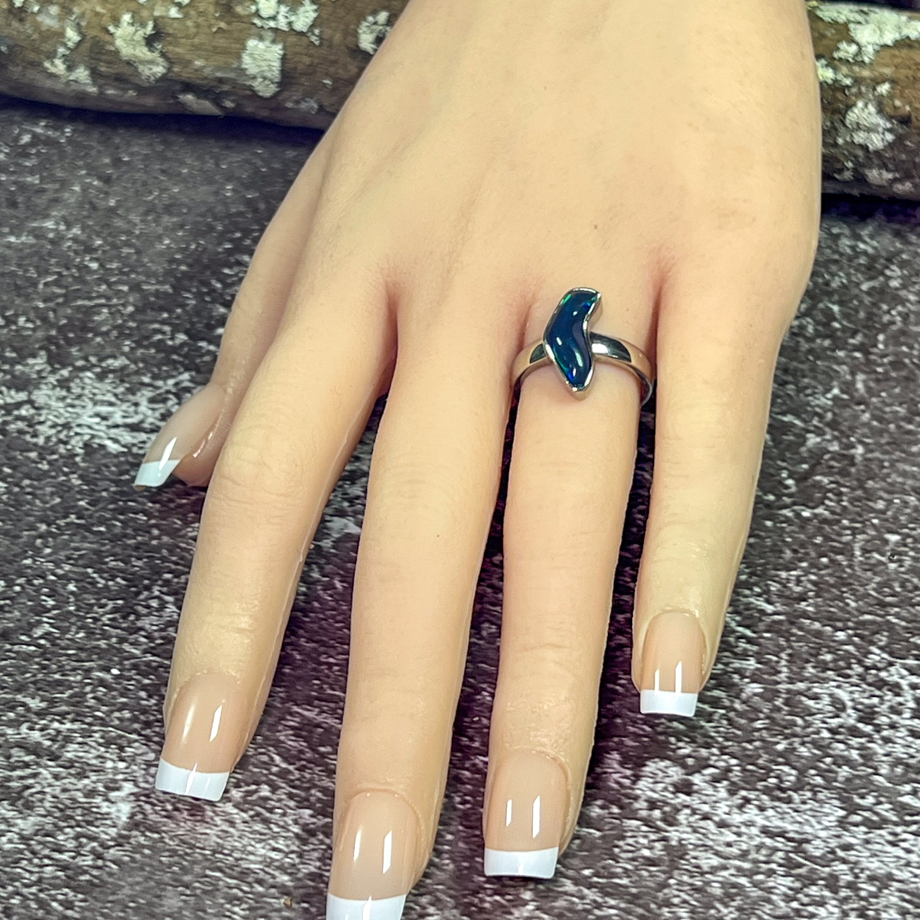 Indulge in the mesmerizing beauty of this Sterling Silver Freeform Green Blue Black Opal 2.15ct ring. The intriguing freeform design showcases a stunning black opal, radiating vibrant green and blue hues. Elevate your style with this unique and elegant piece.
