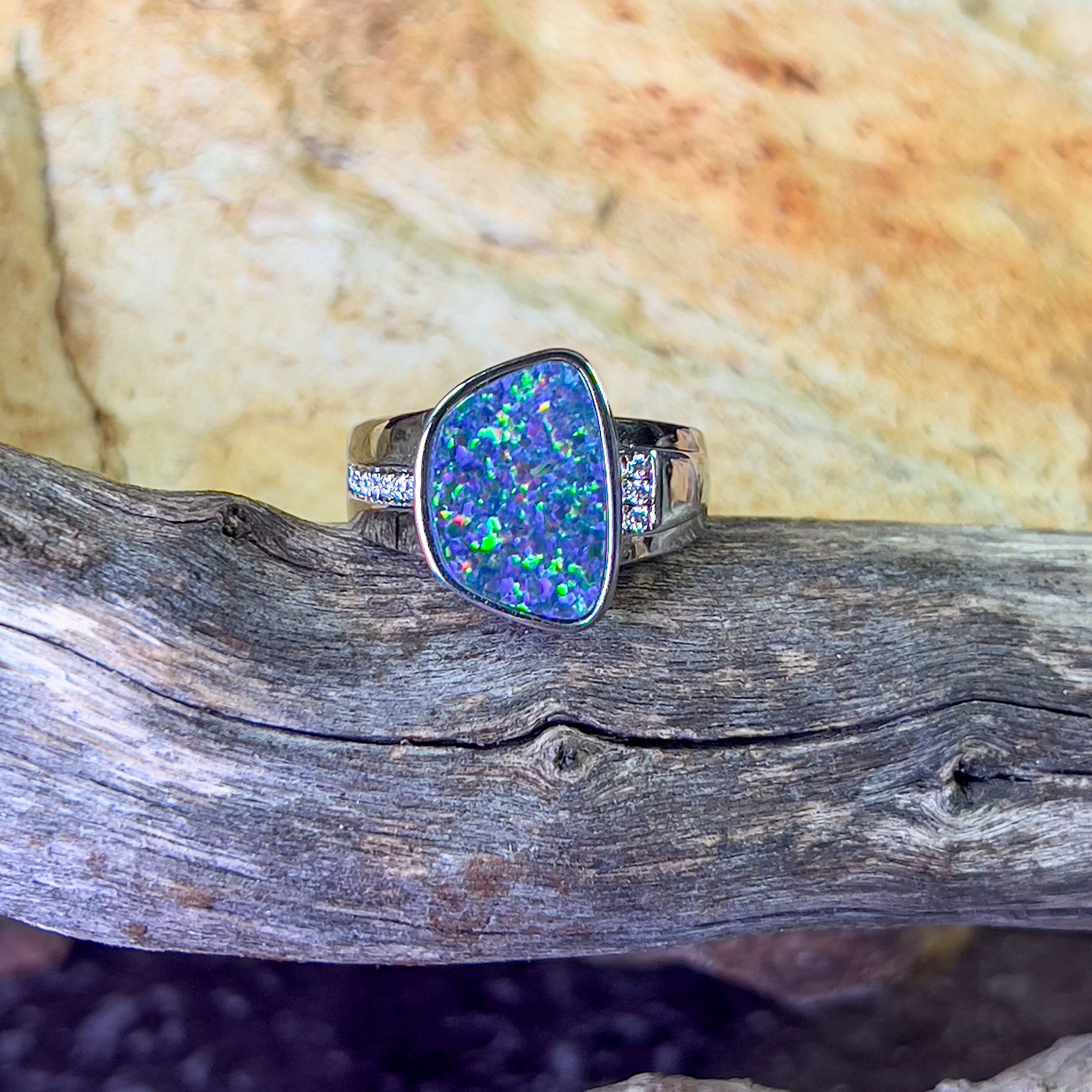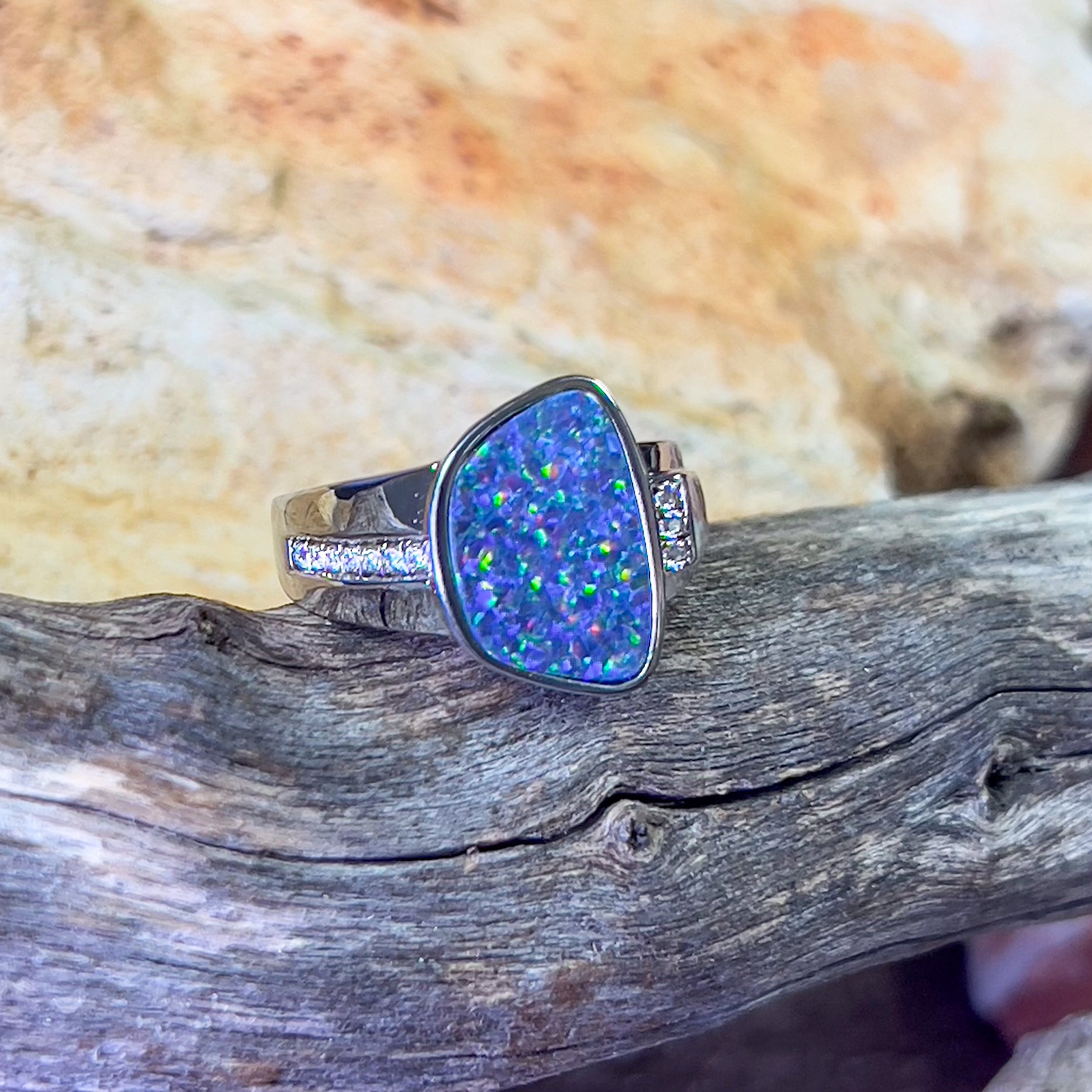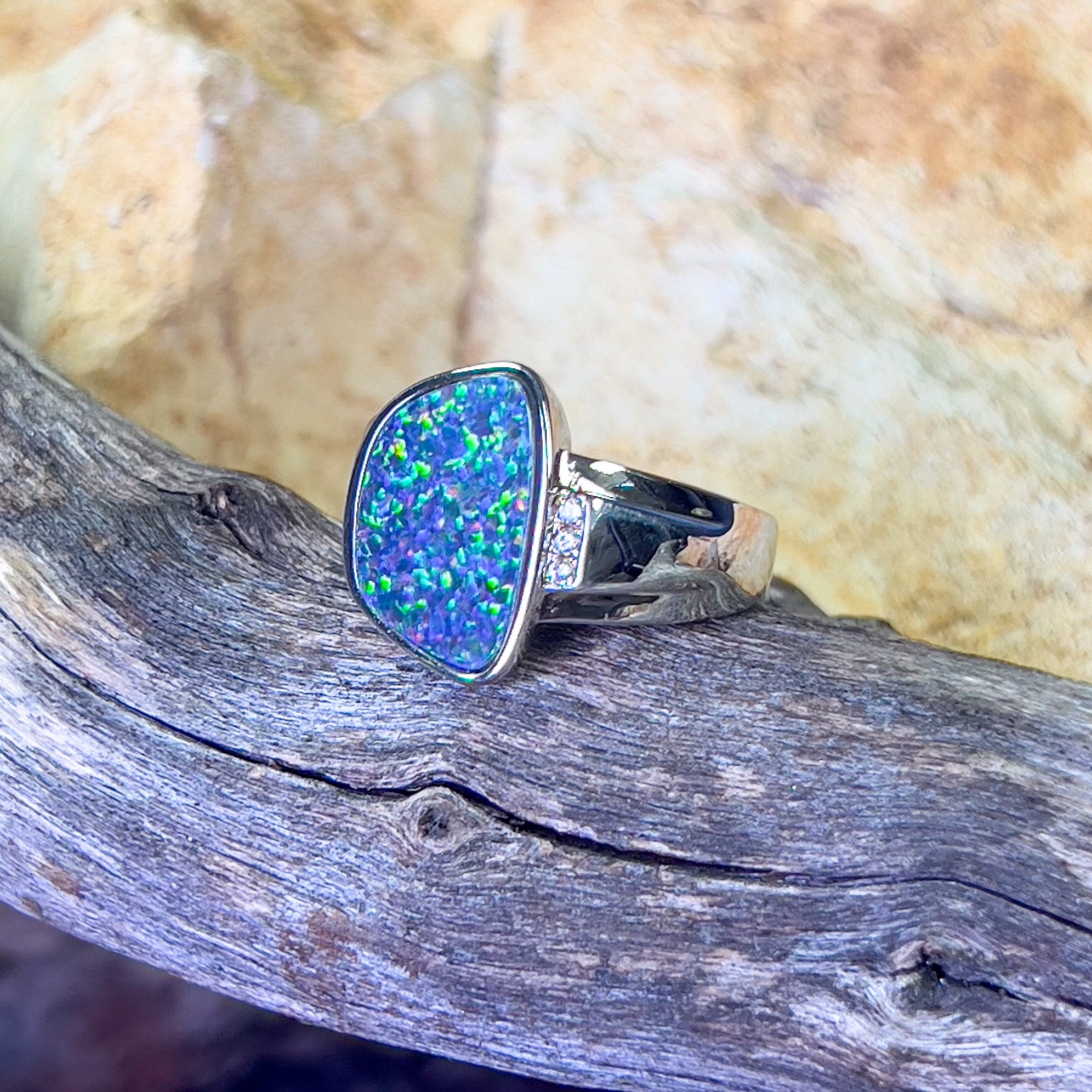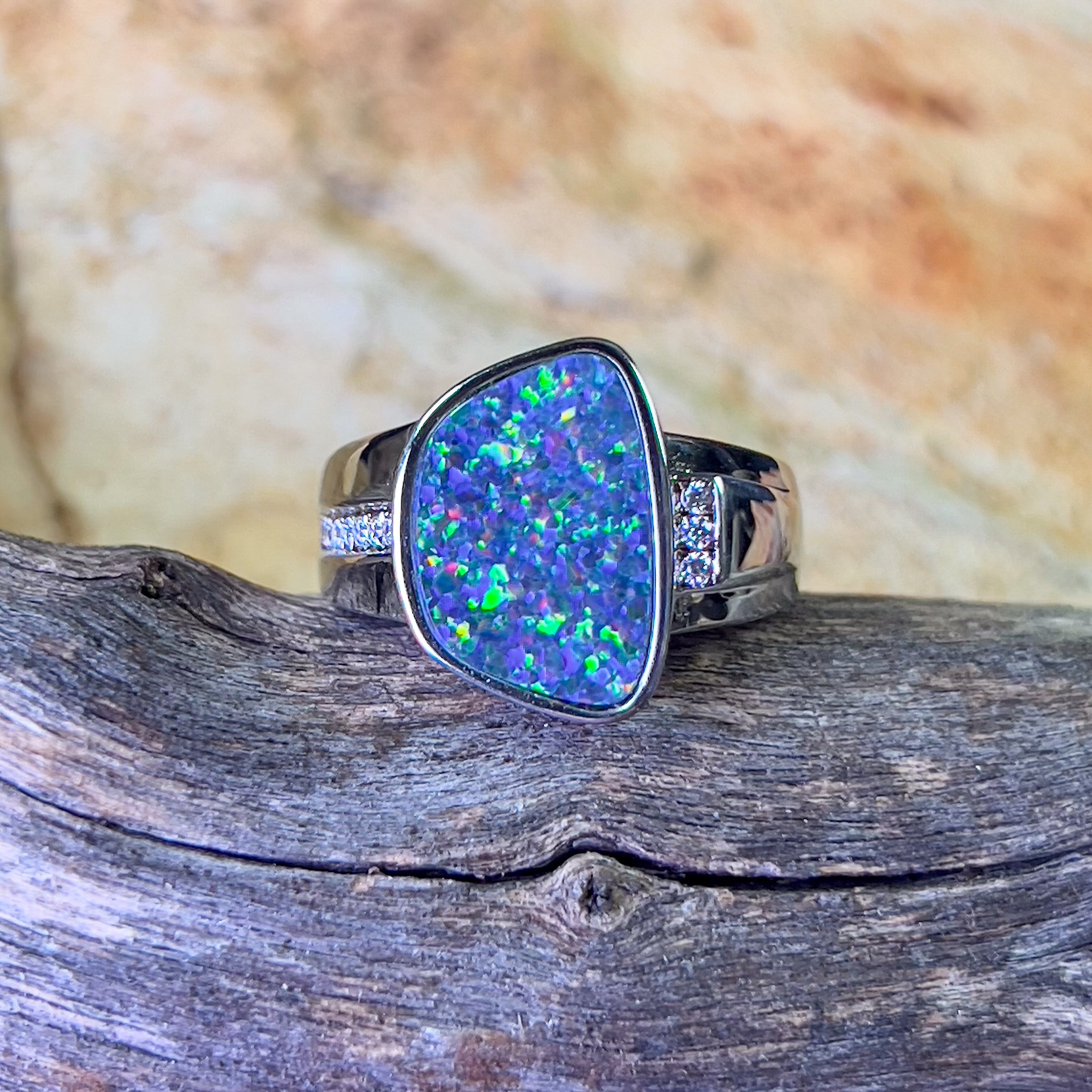 Spruce up your style with this Sterling Silver Opal doublet and cz ring. Perfect for the modern man, this freeform shape ring adds a touch of elegance to any outfit. Dress to impress with this must-have accessory. (Ring band sold separately)