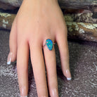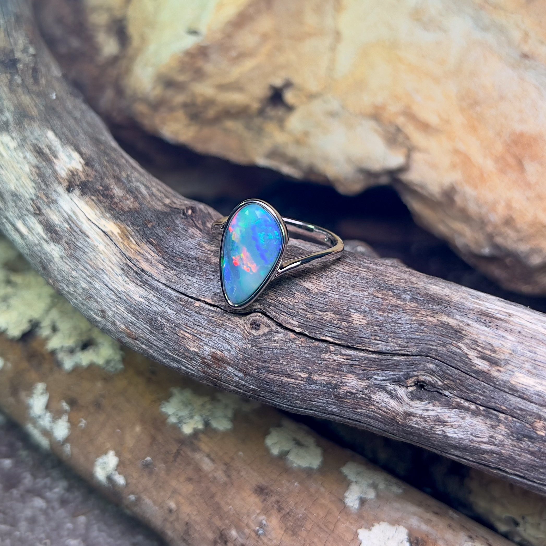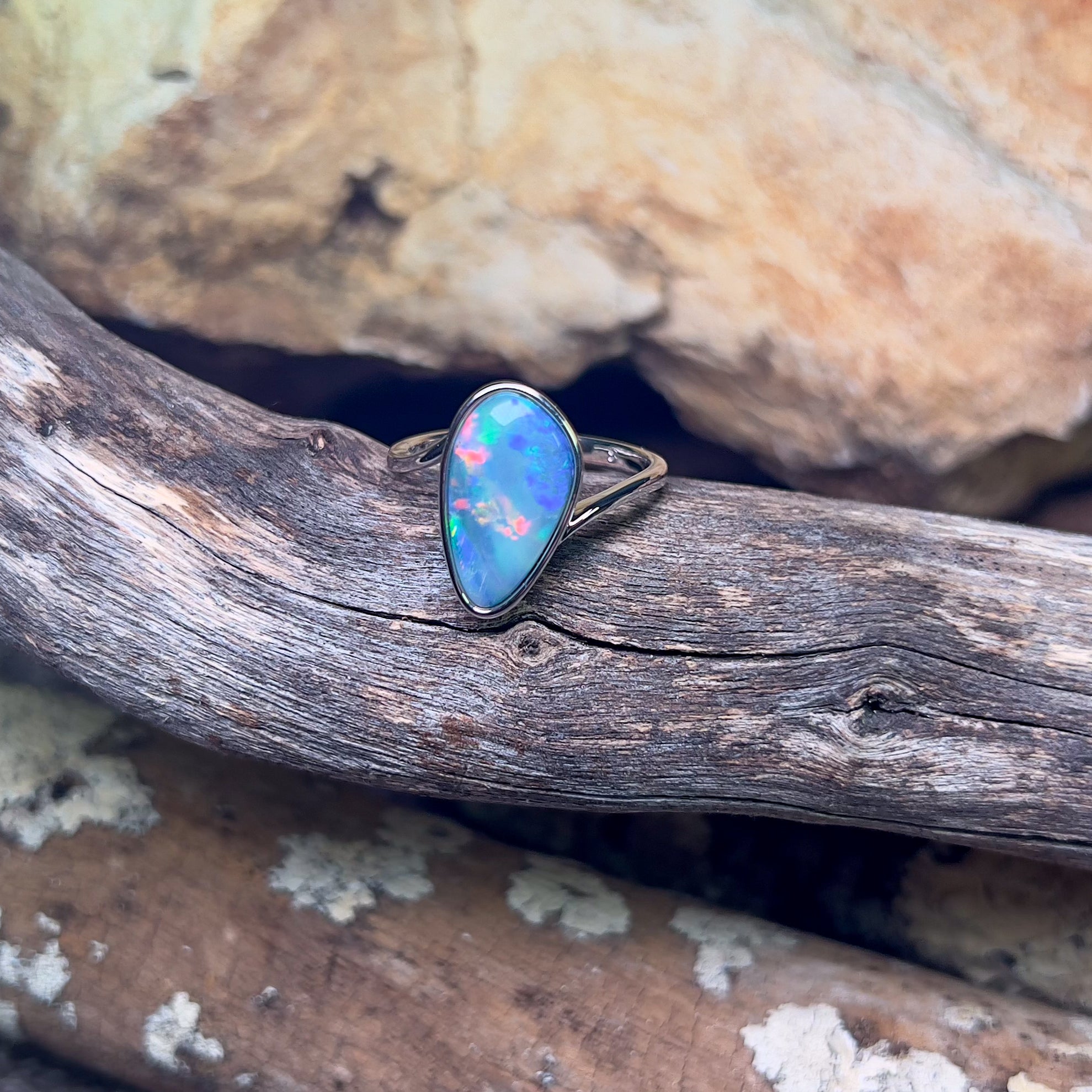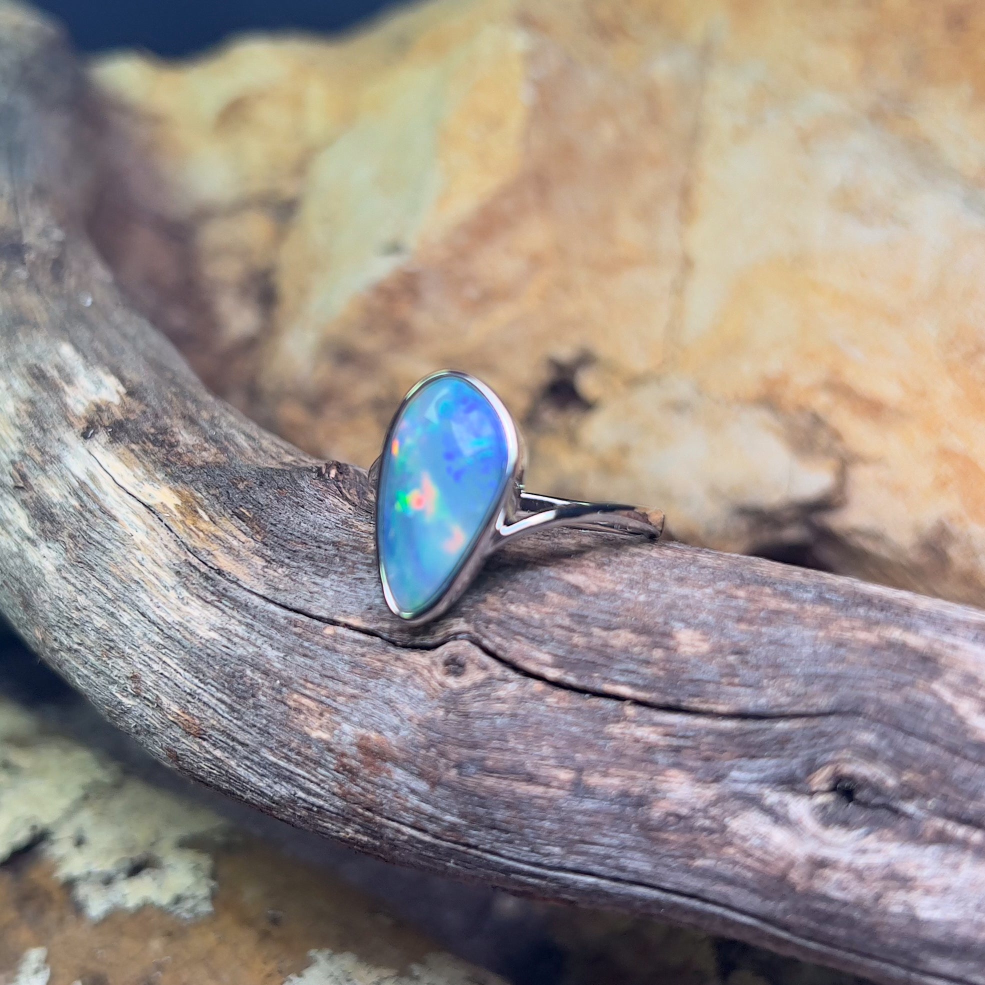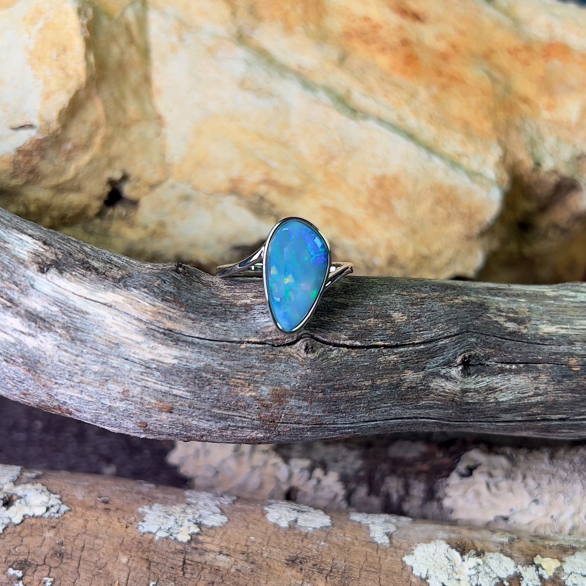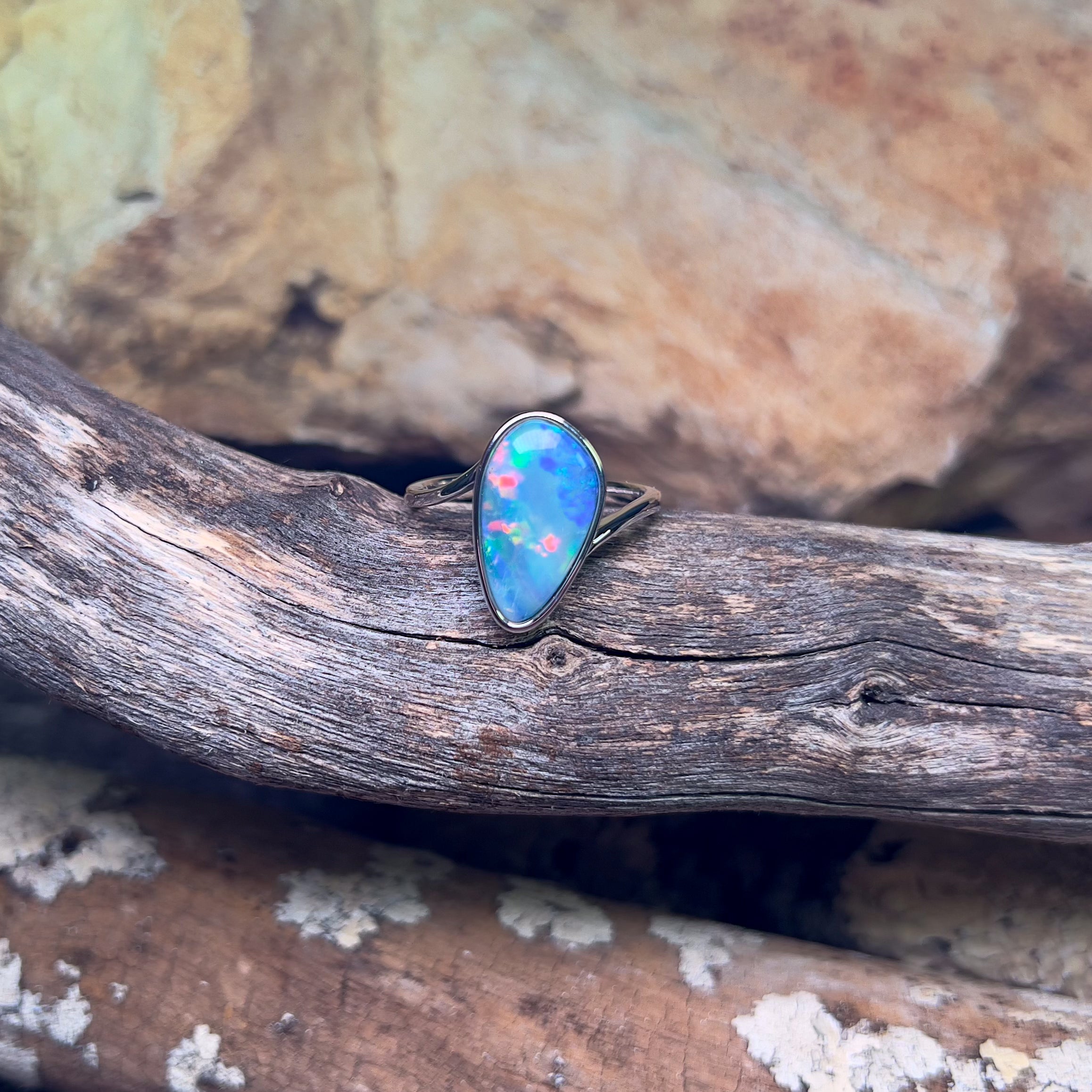 This stunning Sterling Silver Opal doublet solitaire pear shape ring features a natural opal that radiates beauty and elegance. Perfect for adding a touch of sophistication to any outfit, this ring is sure to make a statement and leave a lasting impression. Embrace the natural beauty with this exquisite piece.