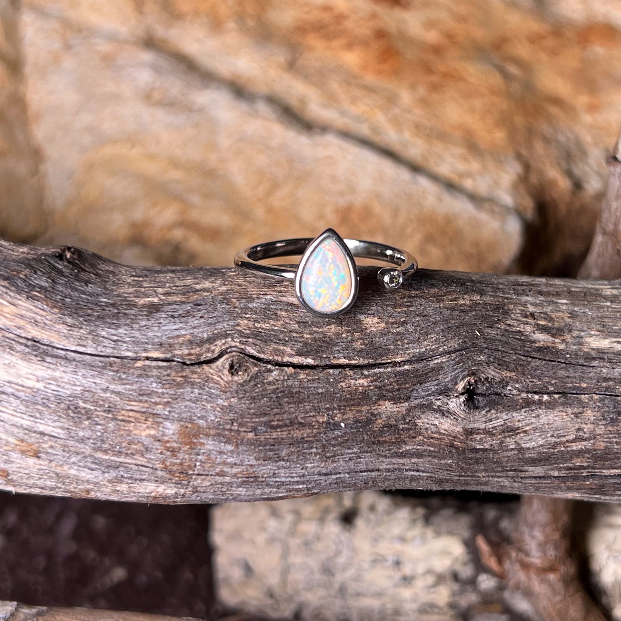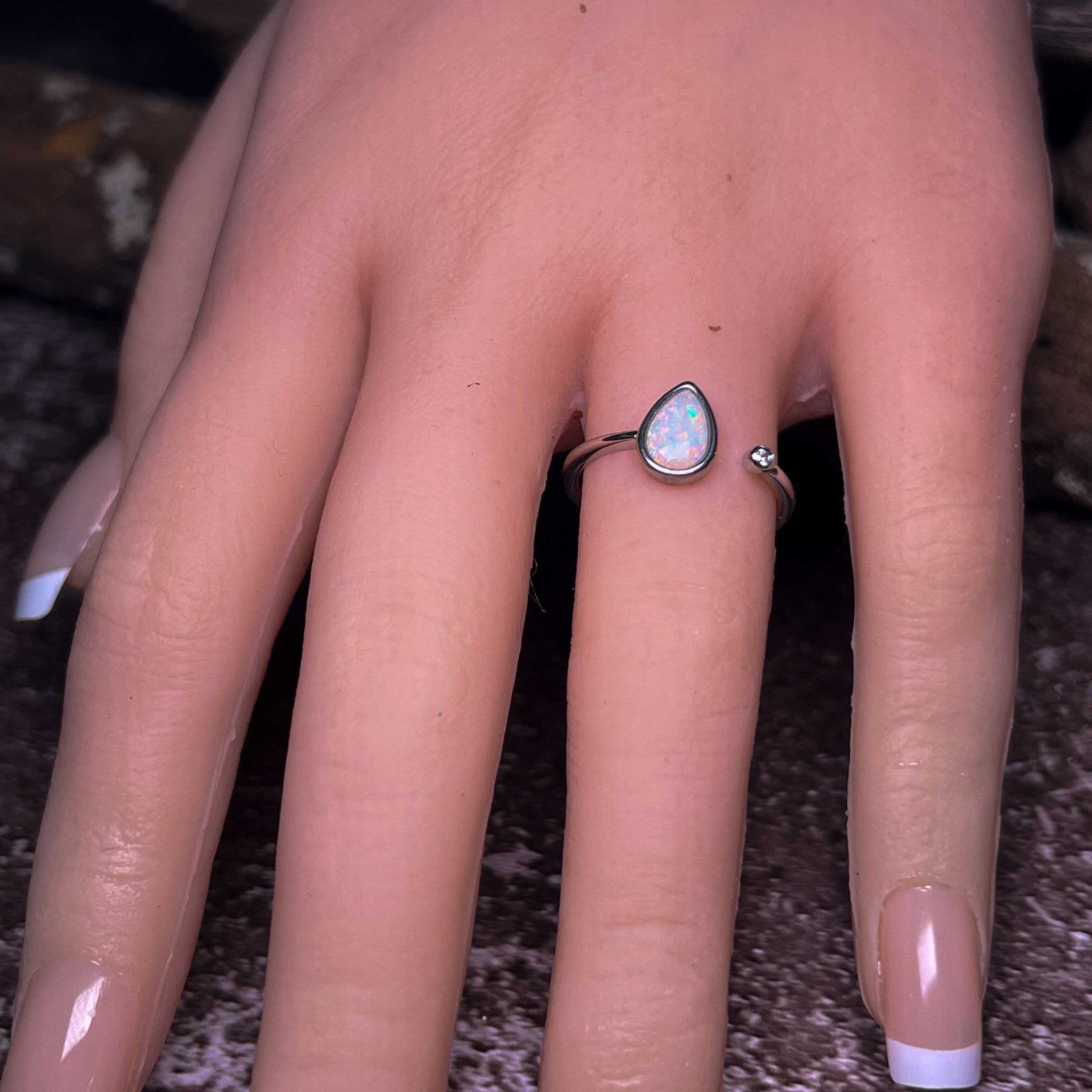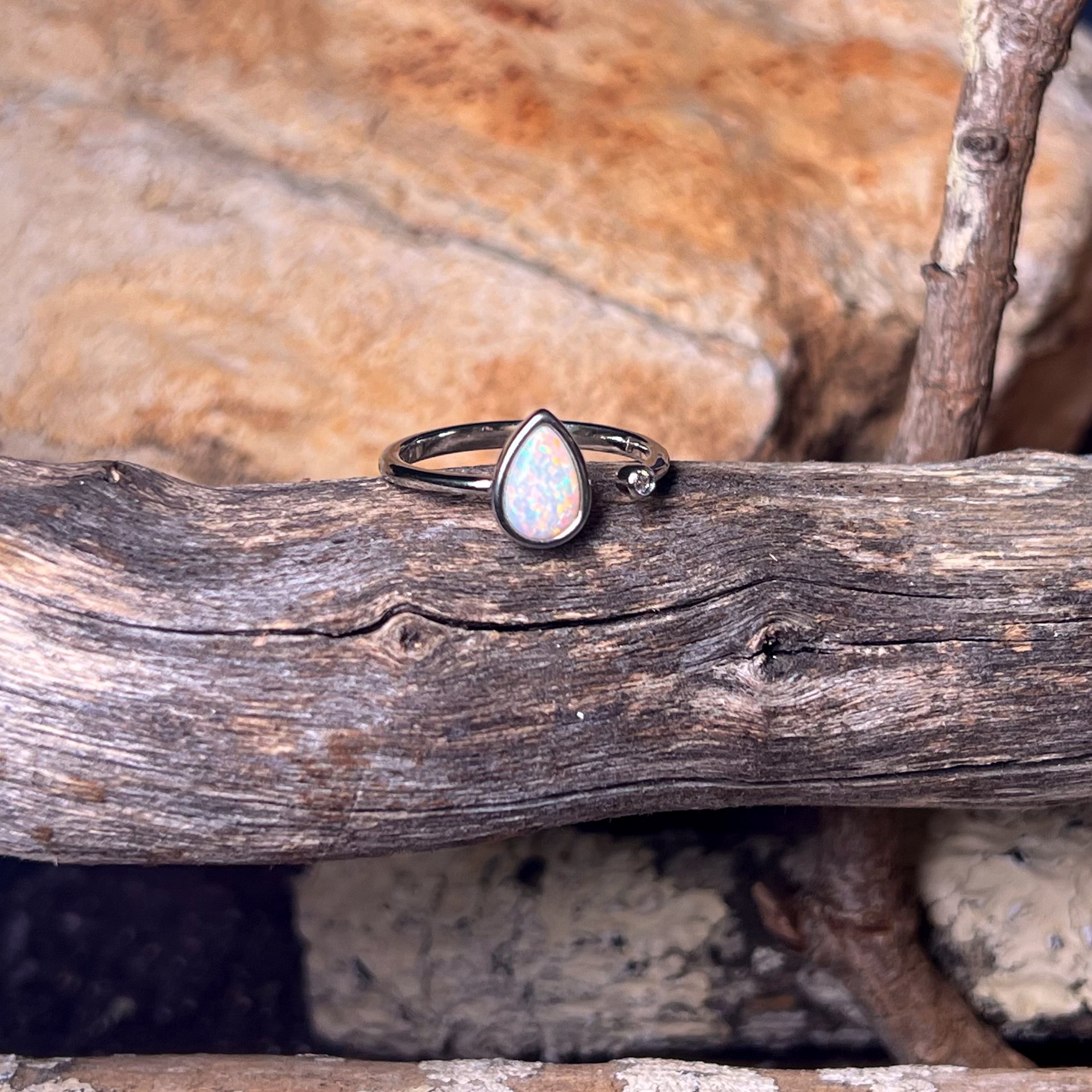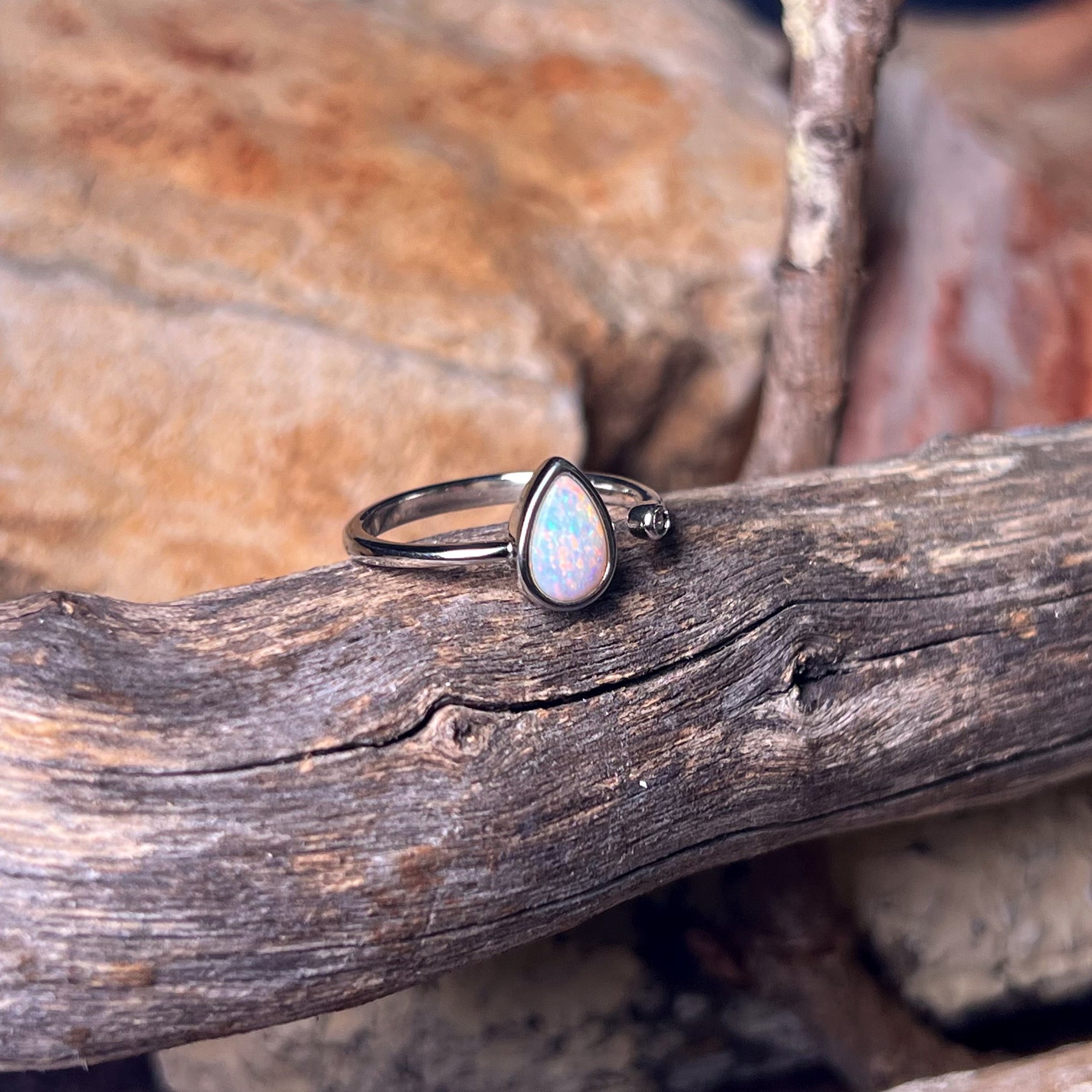 This stunning open ring features a dainty white opal set in a beautiful pear shape. Made with high-quality sterling silver, this solitaire ring is the perfect accessory to add a touch of elegance and sophistication to any outfit. The unique design allows for easy adjustability and comfort, making it a must-have for any jewelry lover. Elevate your style with this timeless piece.