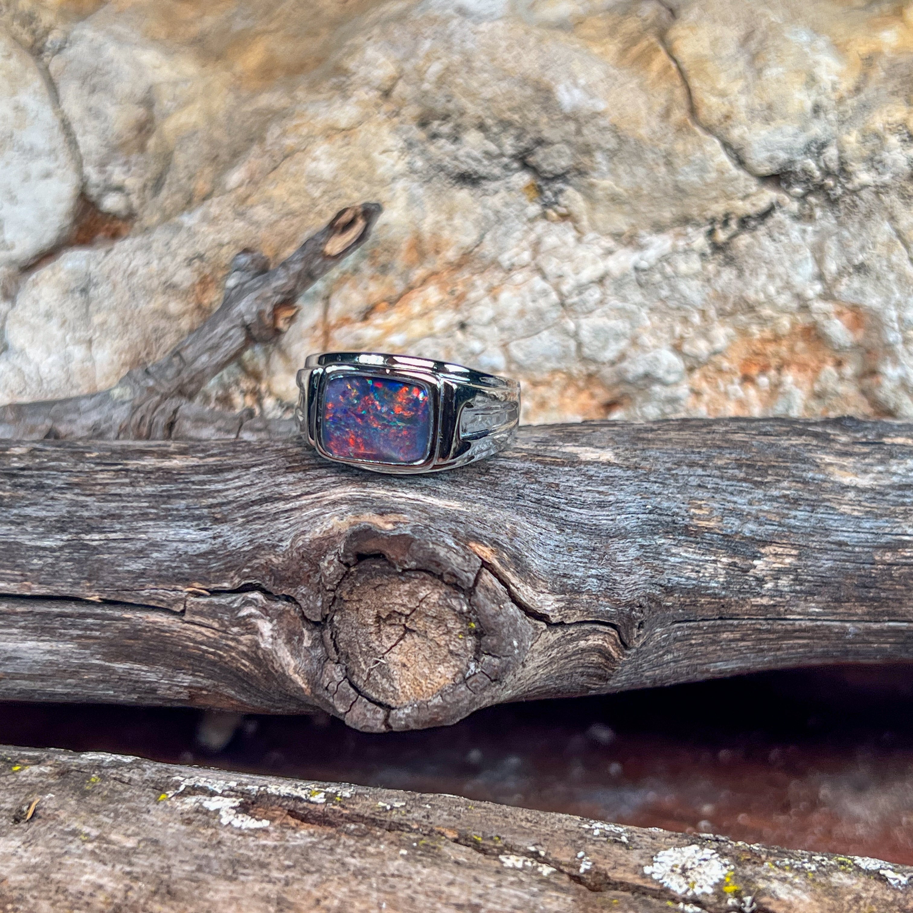 Sterling Silver rectangular Opal Triplet bezel set ring