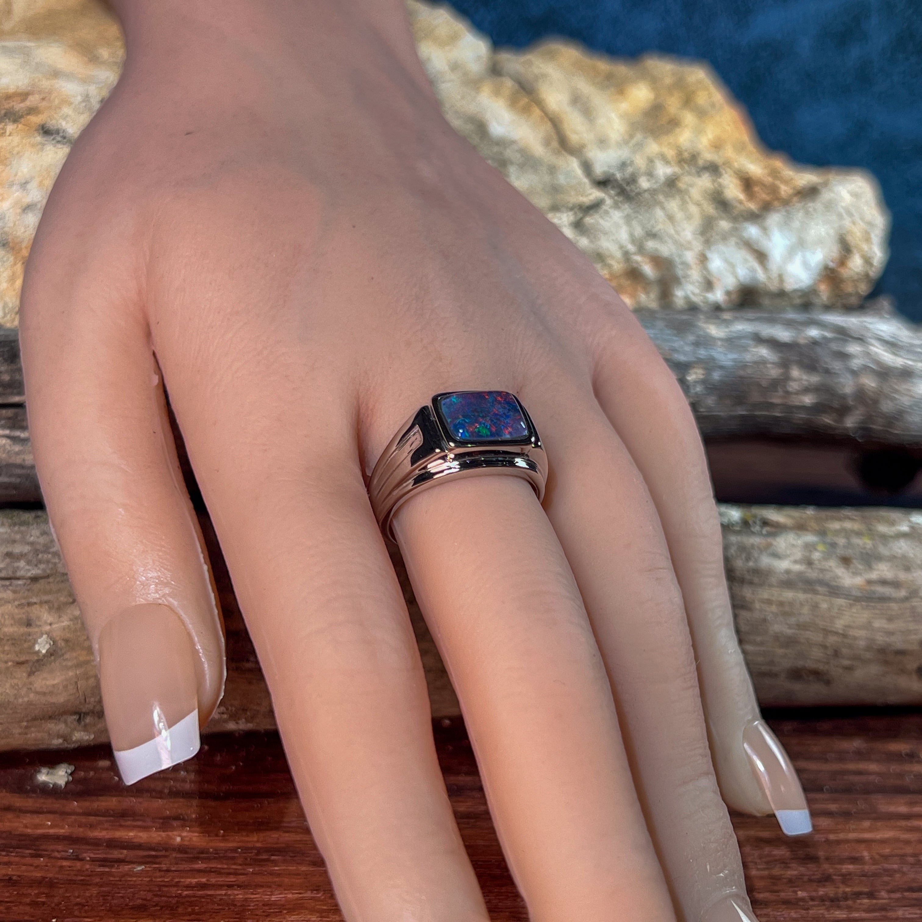 Elevate your style with this sterling silver ring featuring a striking rectangular opal triplet, expertly bezel set for lasting security. The vibrant opal displays a captivating play of color, making it a perfect statement piece that adds elegance to any outfit. Crafted with care, this ring combines durability and unique beauty, ideal for those who appreciate fine craftsmanship and timeless