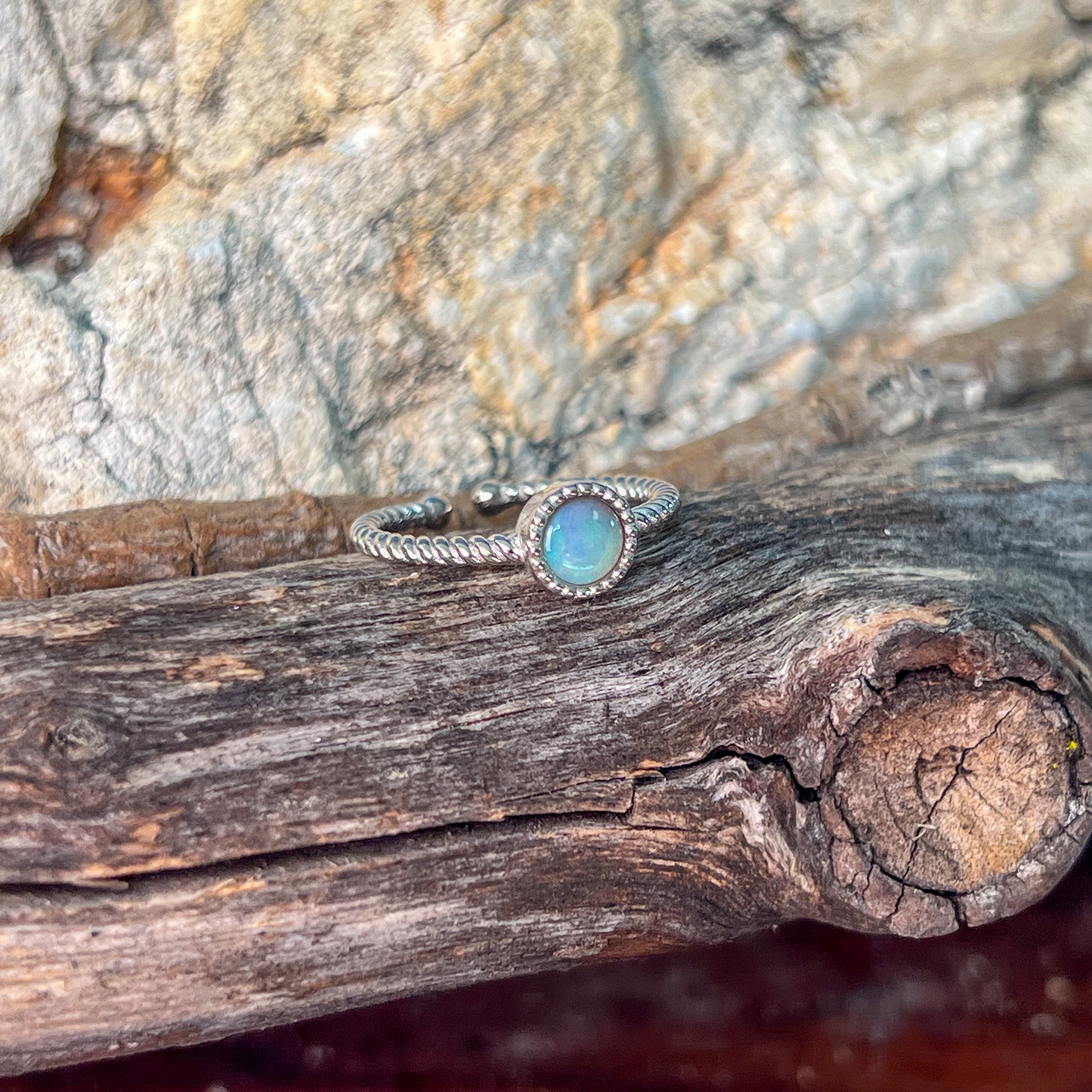 Add a splash of sparkle to your day with this Sterling Silver rope design solitaire Crystal Opal ring. Its twisting rope band wraps around a dazzling crystal opal, catching the light and turning heads wherever you go. Perfect for those who love a little whimsy with their elegance, this ring brings charm and shine to any outfit.