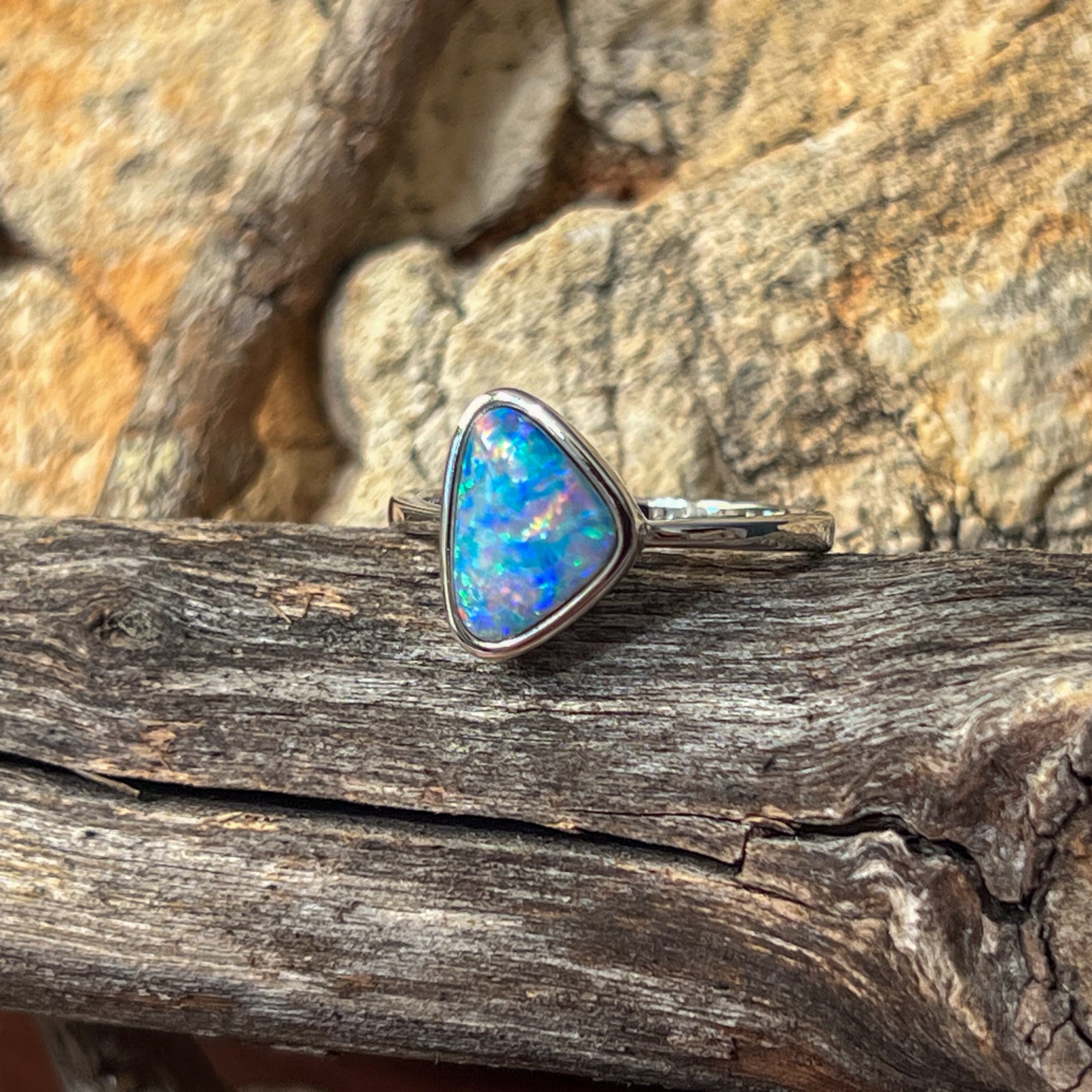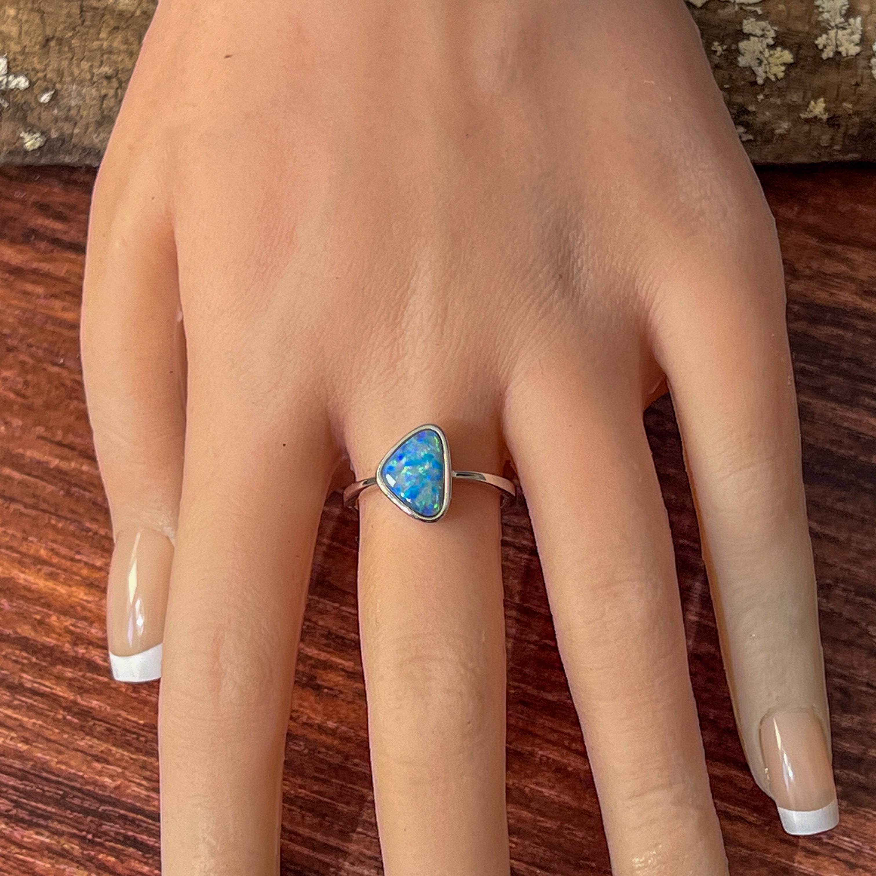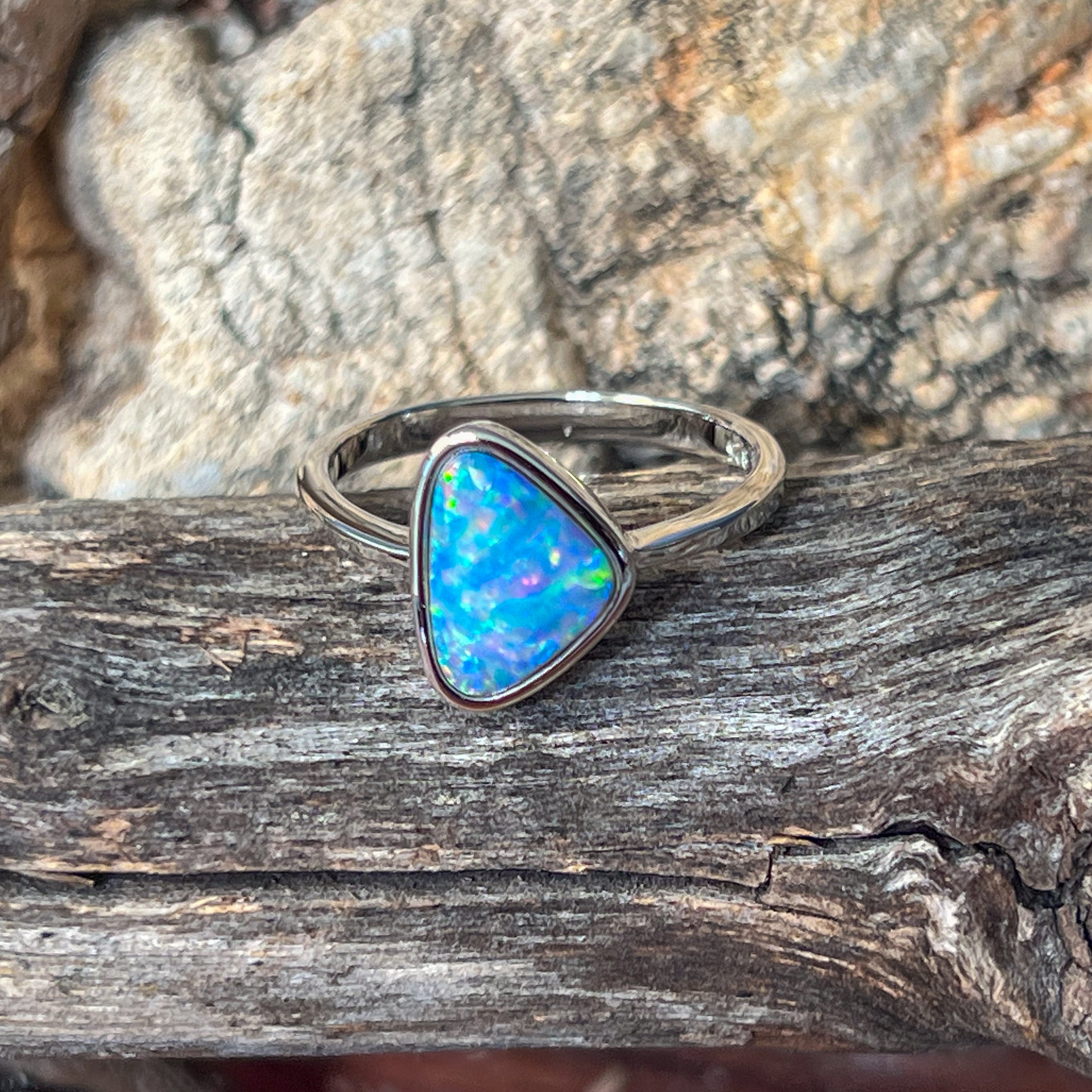 Sterling Silver Triangle Blue Green Yellow Opal doublet bezel set solitaire ring