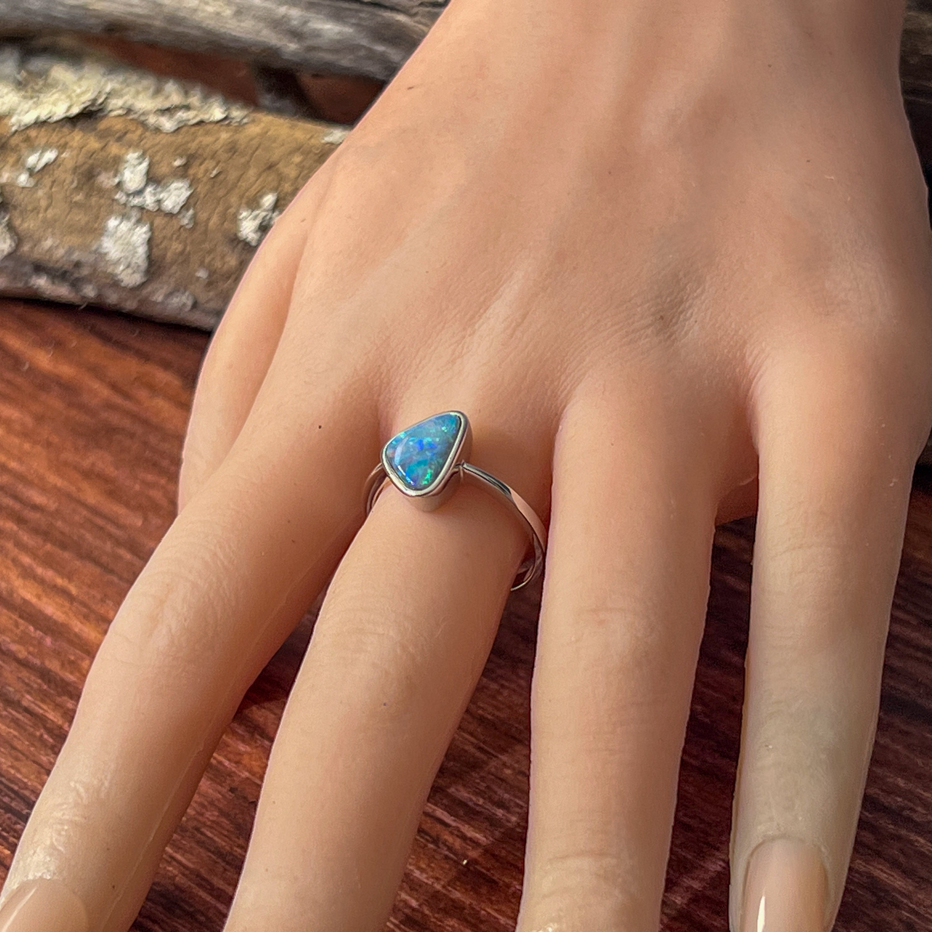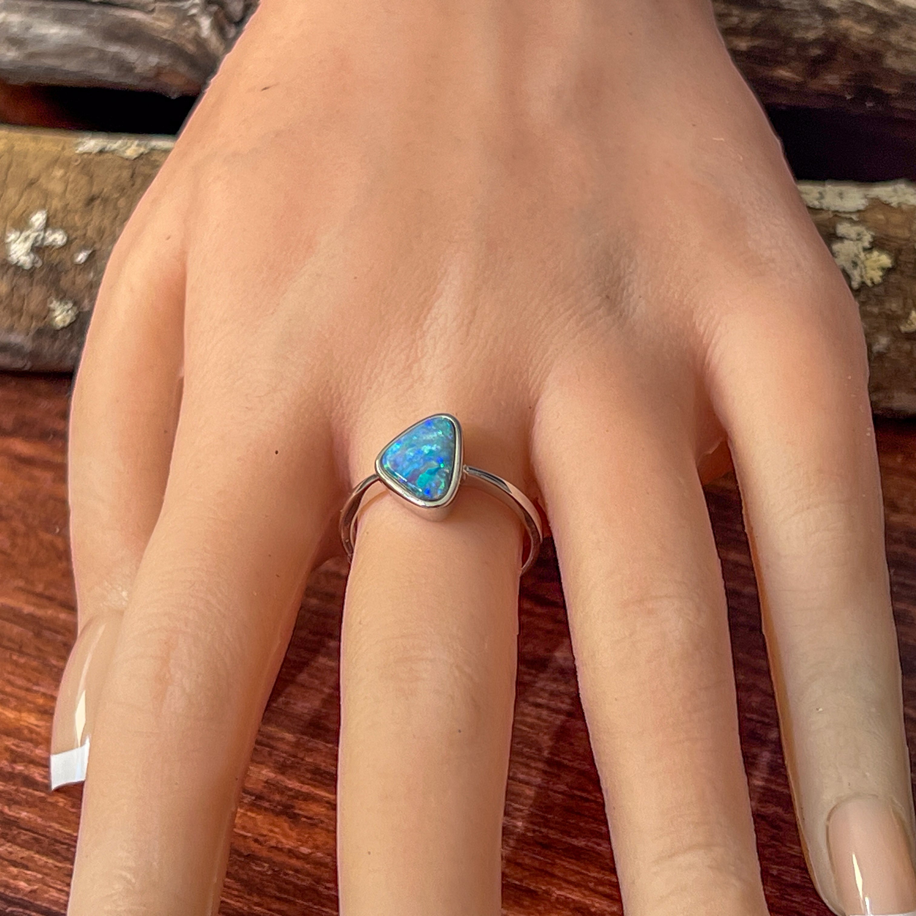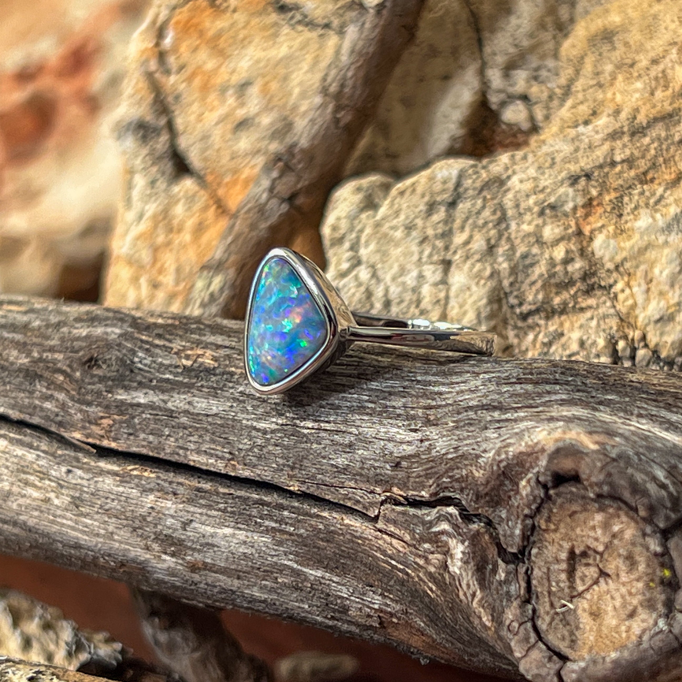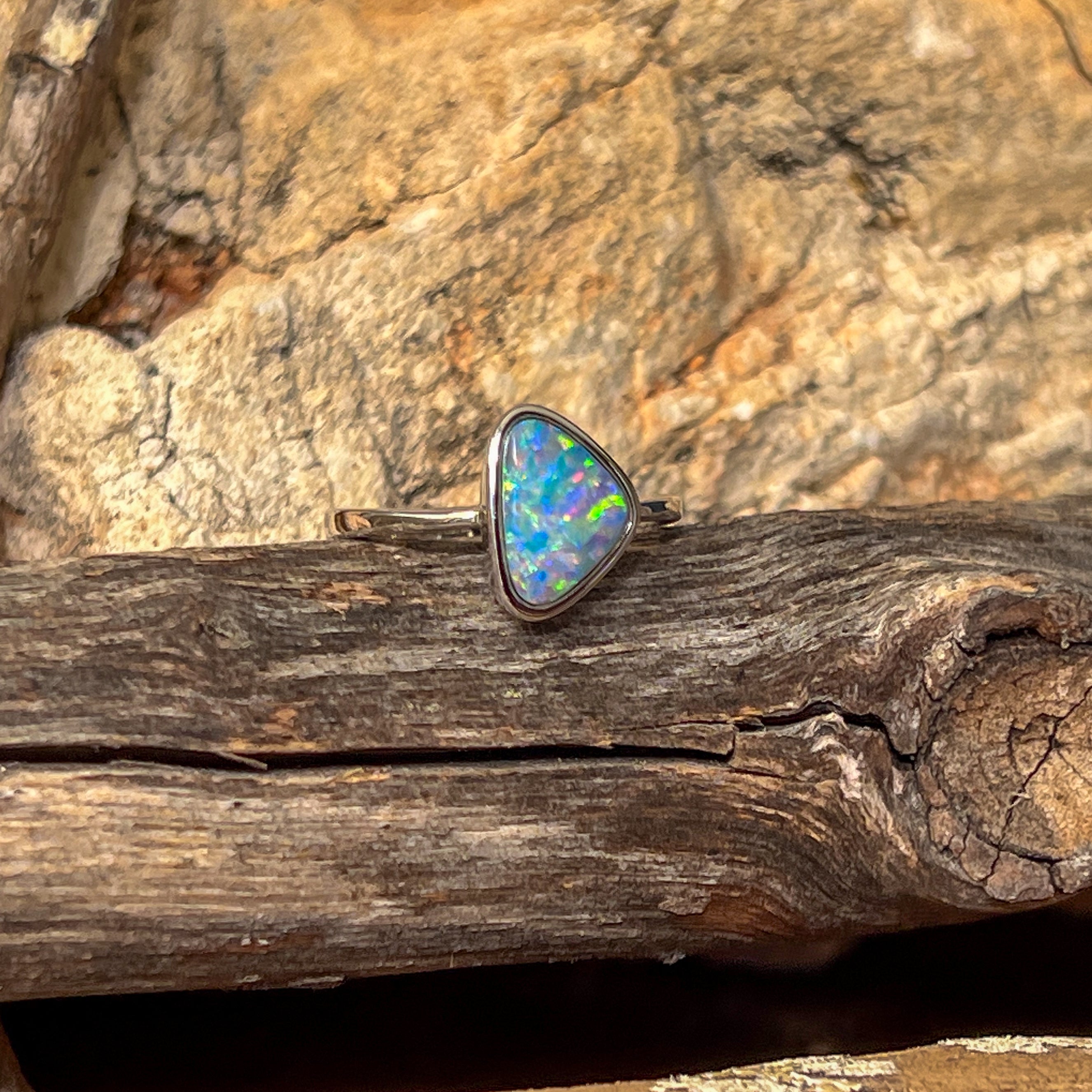 Sterling Silver Triangle Blue Green Yellow Opal doublet bezel set solitaire ring