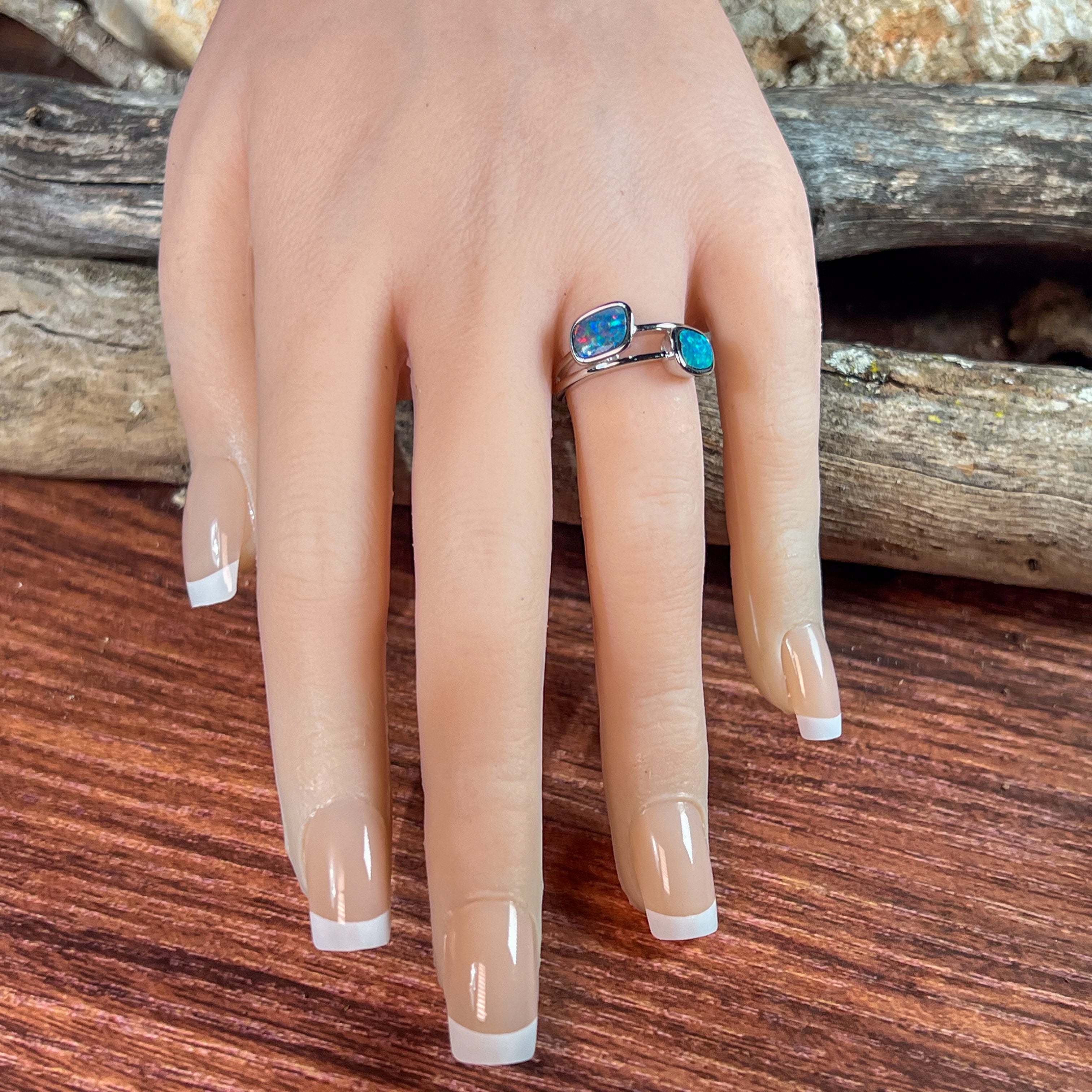 Elevate your accessory game with this Sterling Silver split ring featuring vibrant red and green opals. Its unique design blends modern elegance with bold color, making it perfect for adding a striking touch to any outfit. Durable and stylish, this ring offers lasting shine and effortless sophistication for everyday wear or special occasions.