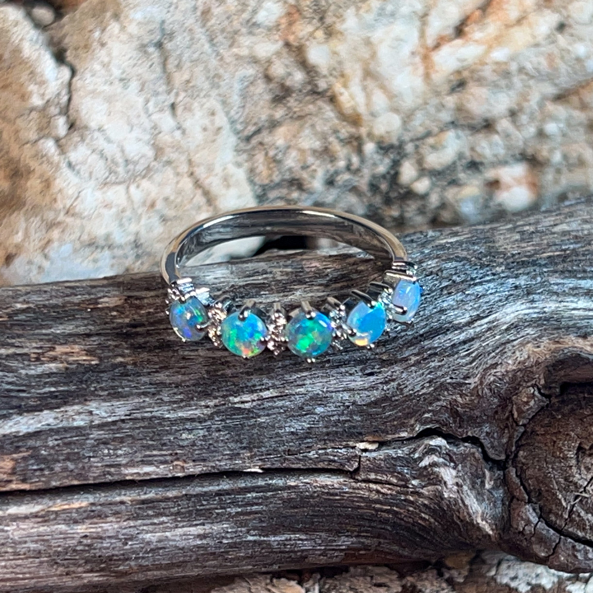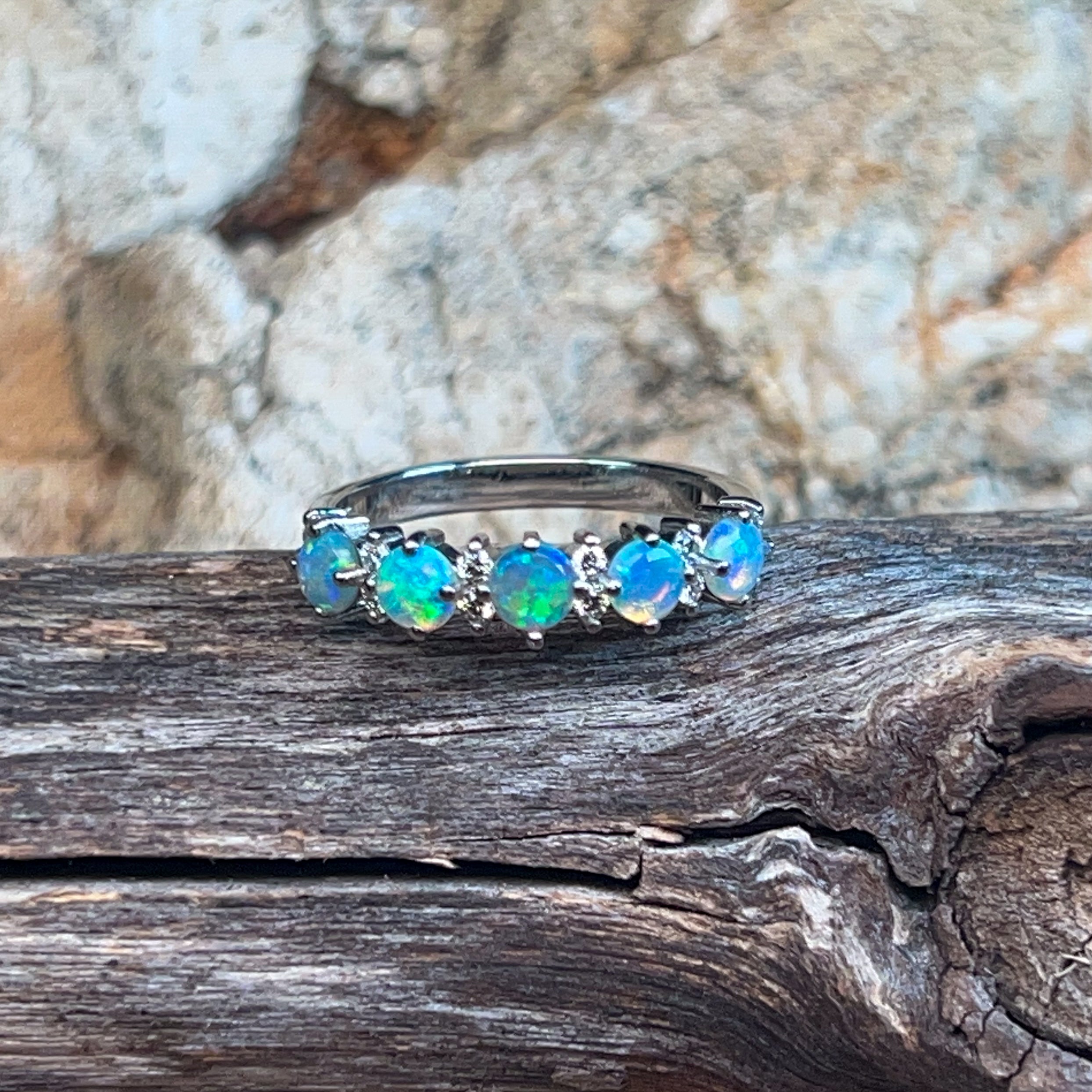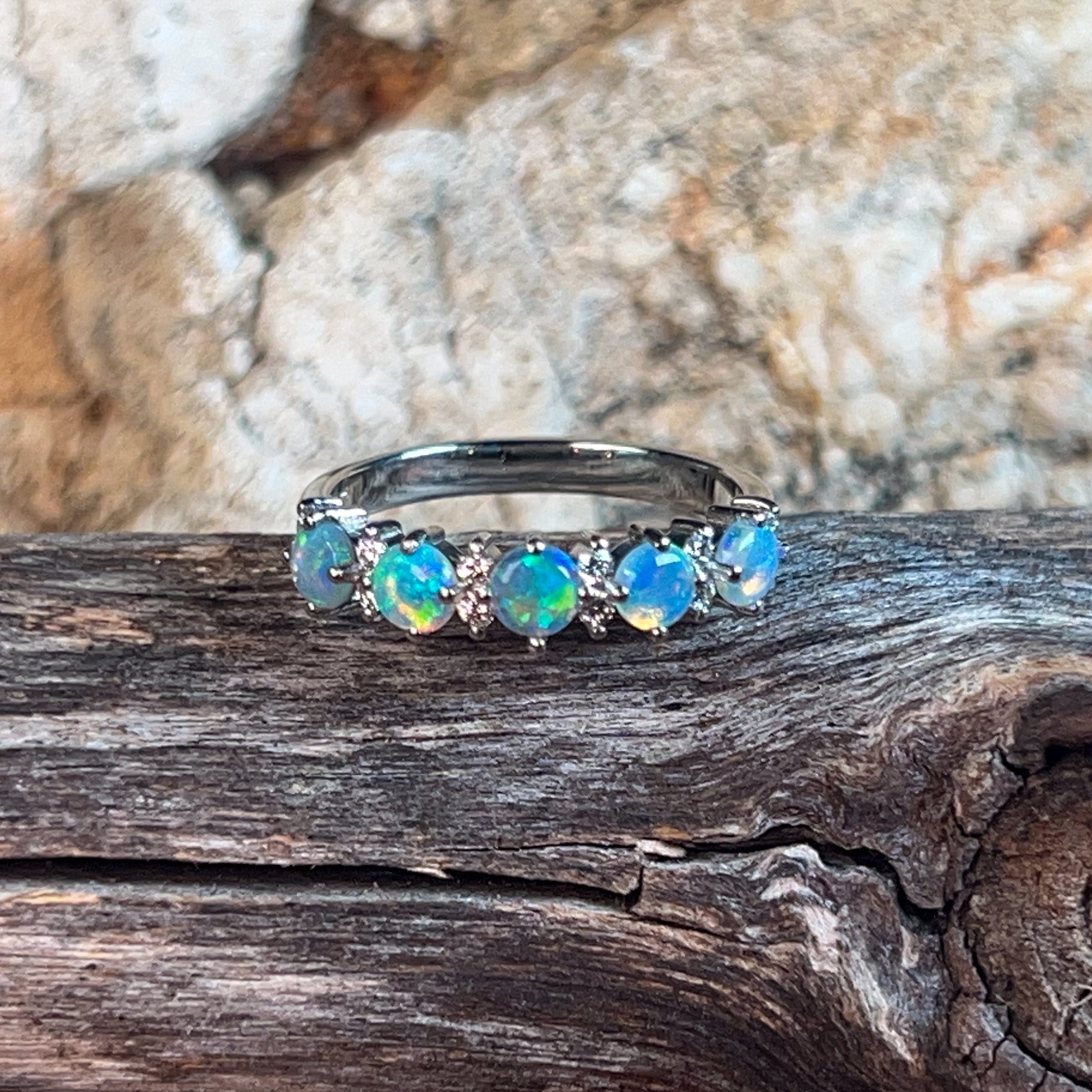 Imagine saying "yes" to forever with a ring that sparkles with pure magic. This platinum eternity-style beauty features a mesmerizing Crystal Opal at its heart, surrounded by brilliant diamonds that dance with every gesture. The timeless design celebrates your unique love story—because your engagement ring should be as extraordinary as your commitment. Crafted with precision and passion, this showstopper combines the ethereal fire of Australian opal with the enduring elegance of platinum and diamonds. A ring that's genuinely one-of-a-kind, just like your love.