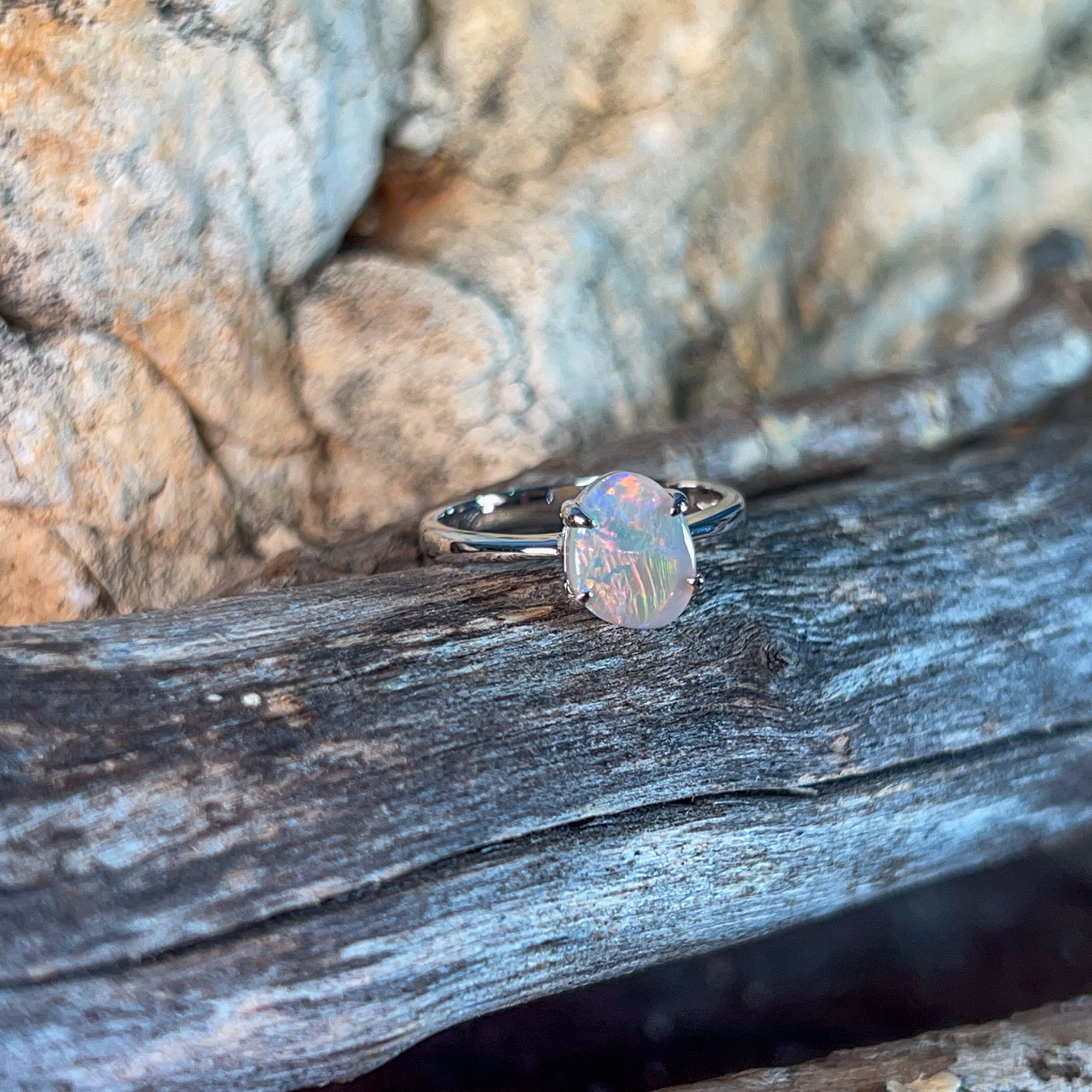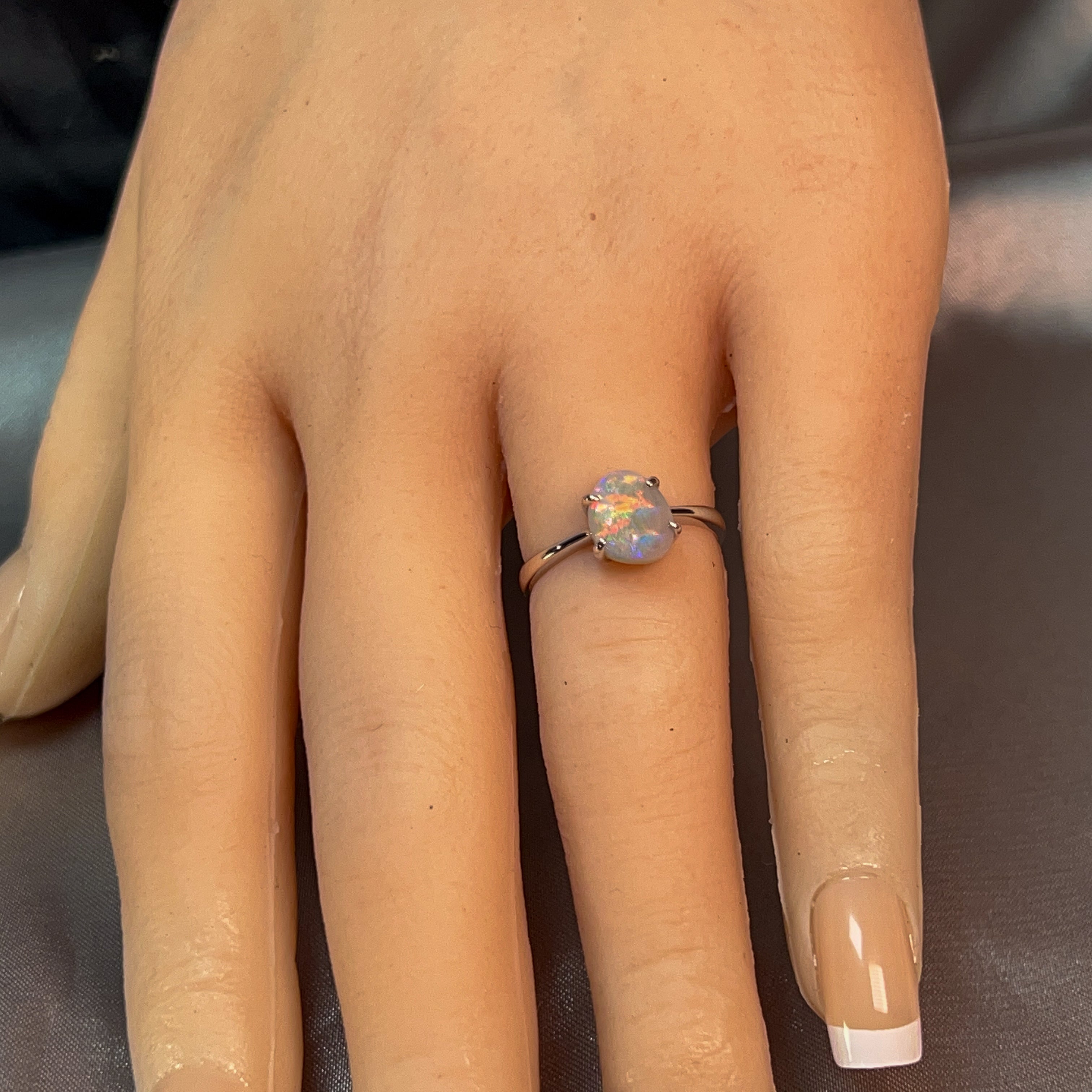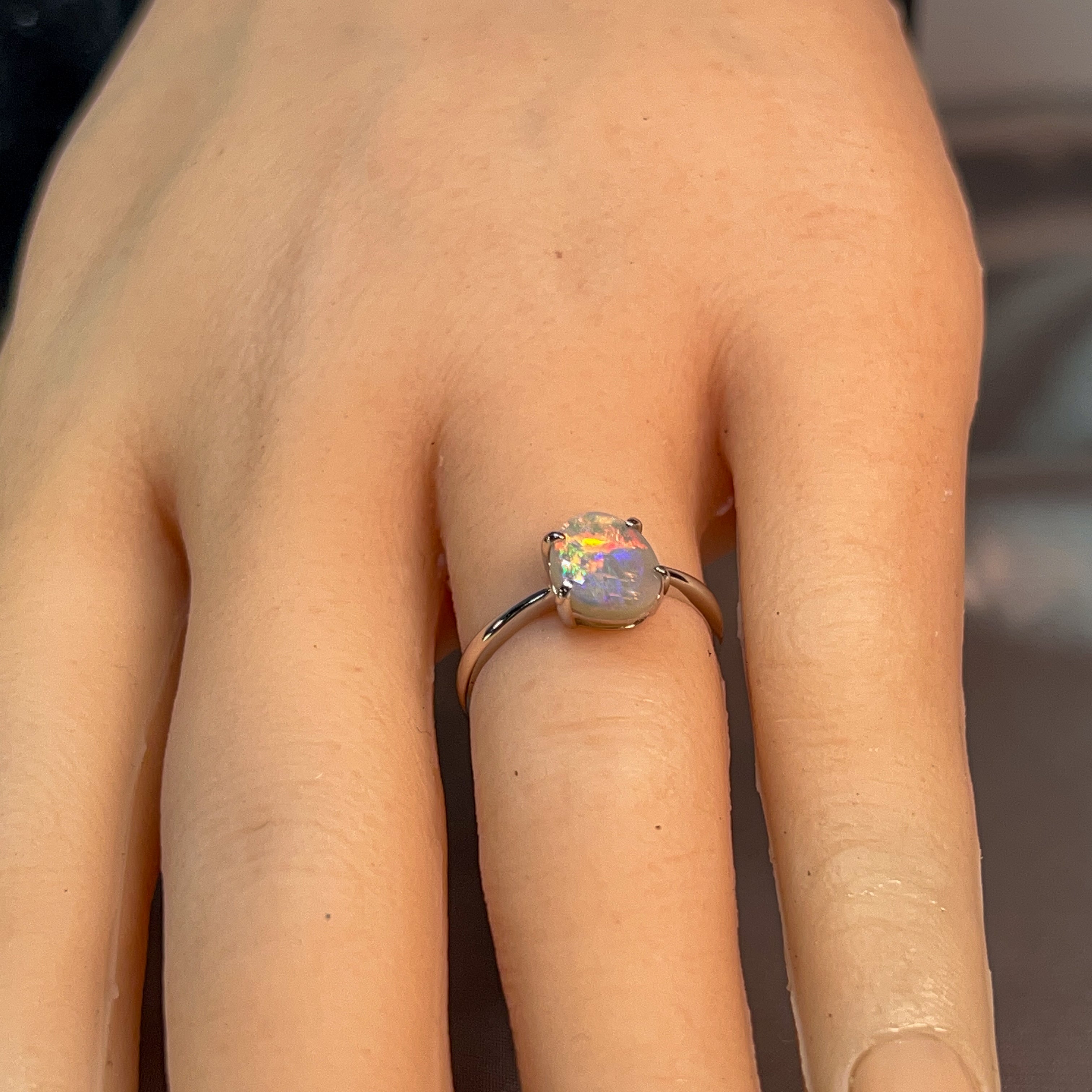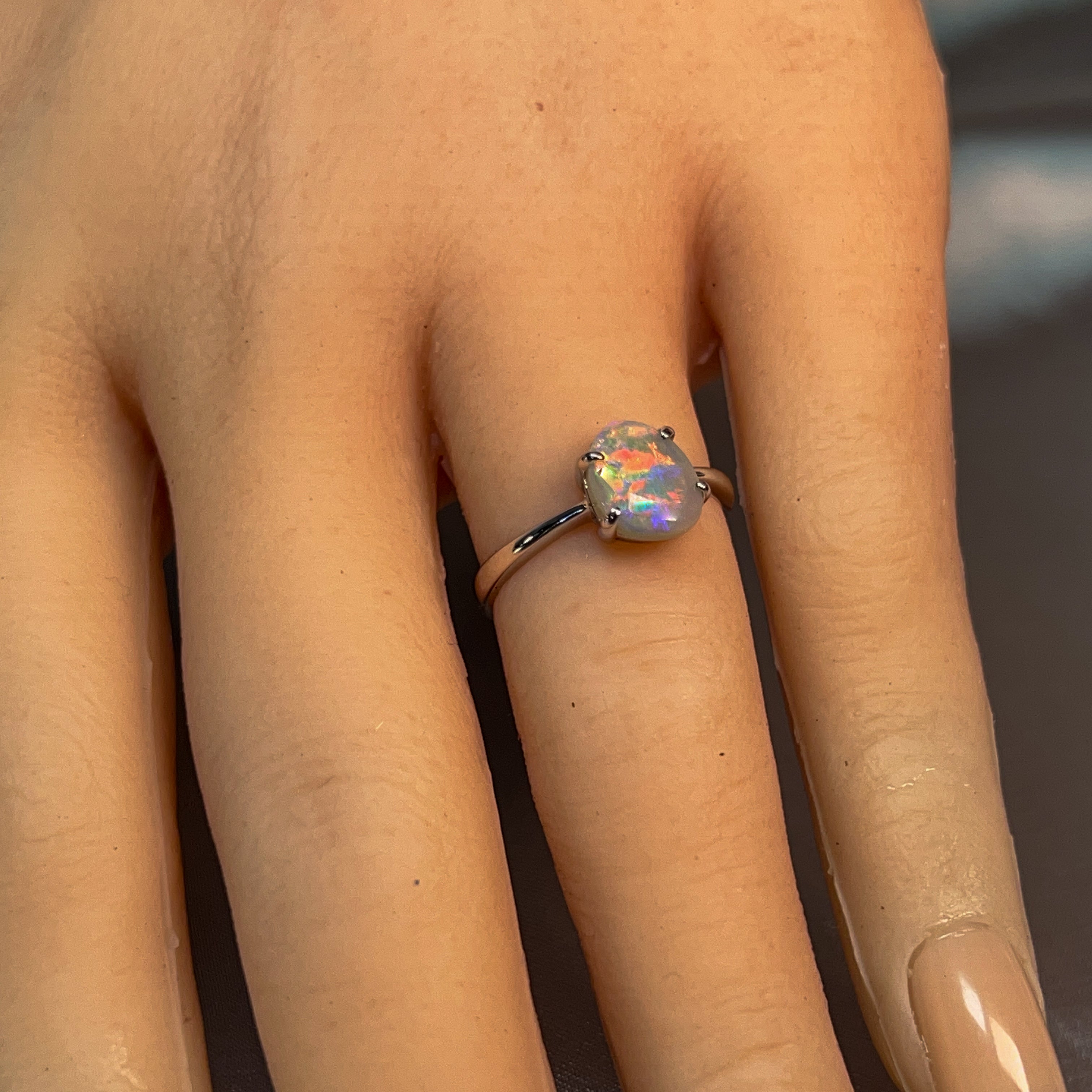Ignite your finger with this stunning 14kt white gold ring, where a mesmerizing black opal takes centre stage. Watch as fiery reds, oranges, and golden yellows dance across the stone's surface, creating a spectacular light show with every movement. The cool elegance of white gold perfectly frames the opal's warm, vibrant hues, making this 1ct beauty a true showstopper. Perfect for those who dare to wear nature's most dazzling gemstone.