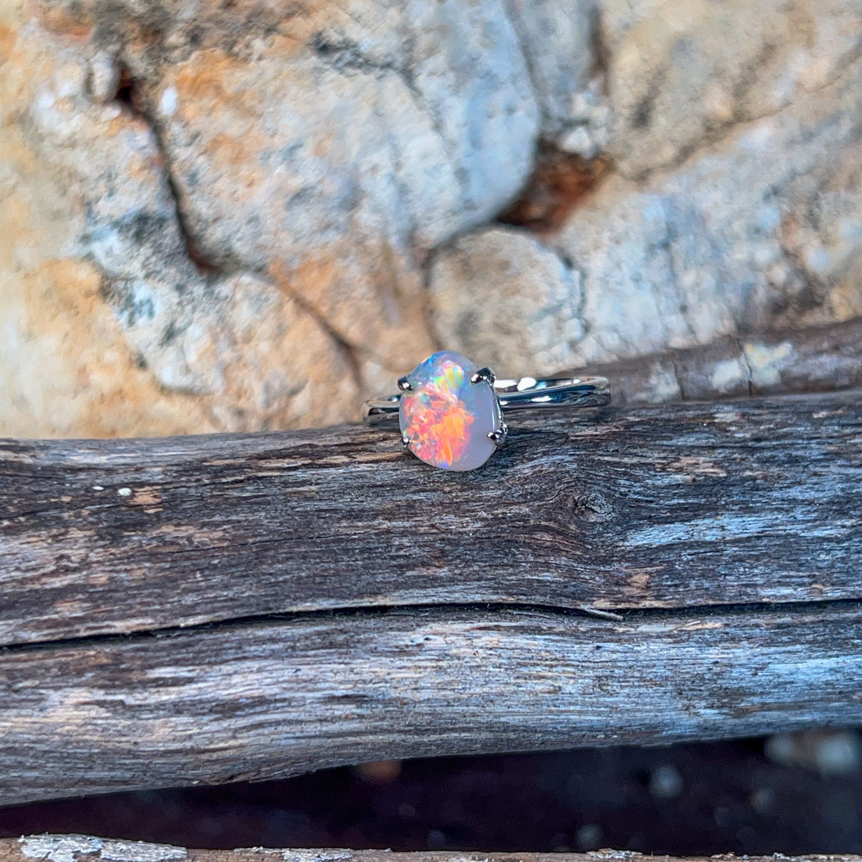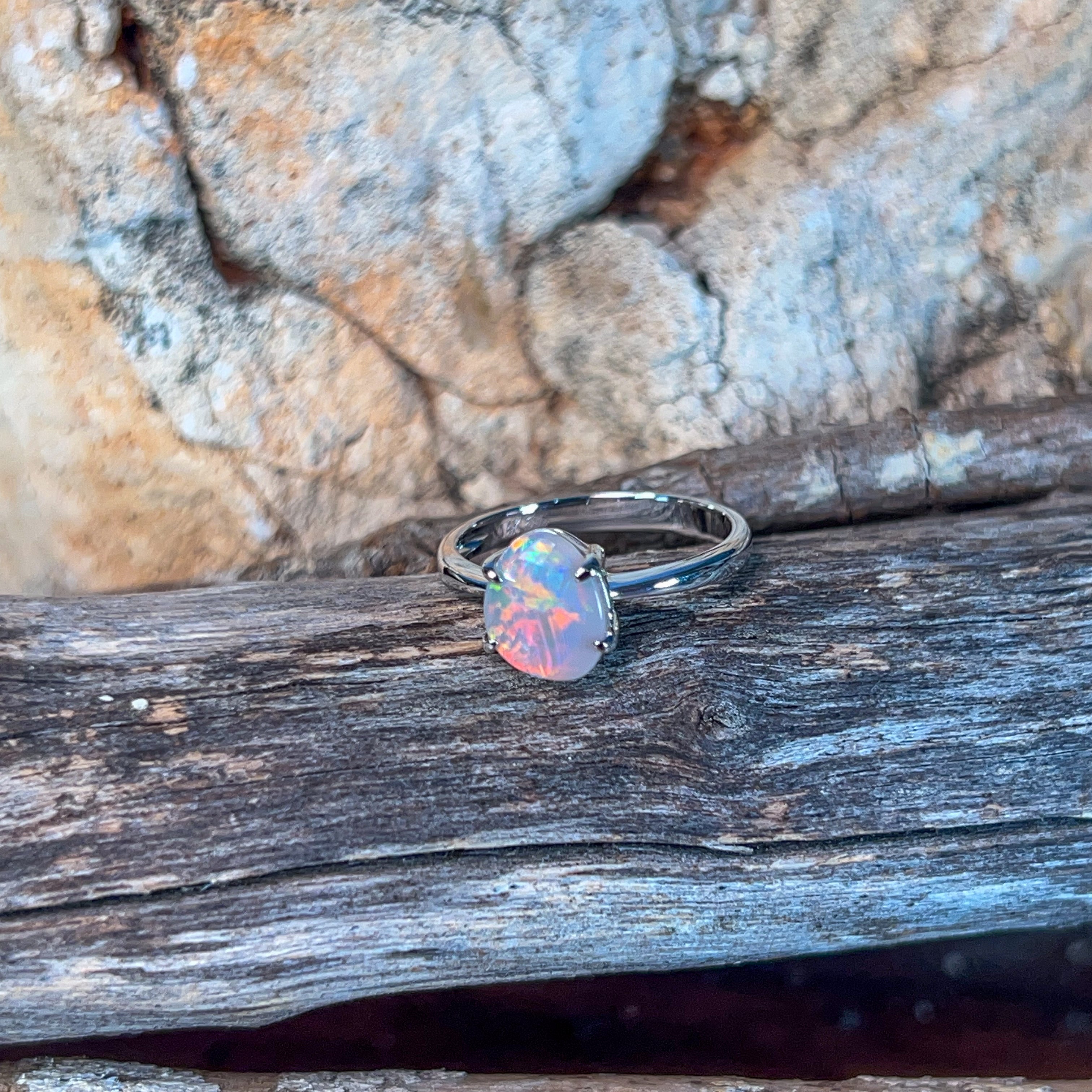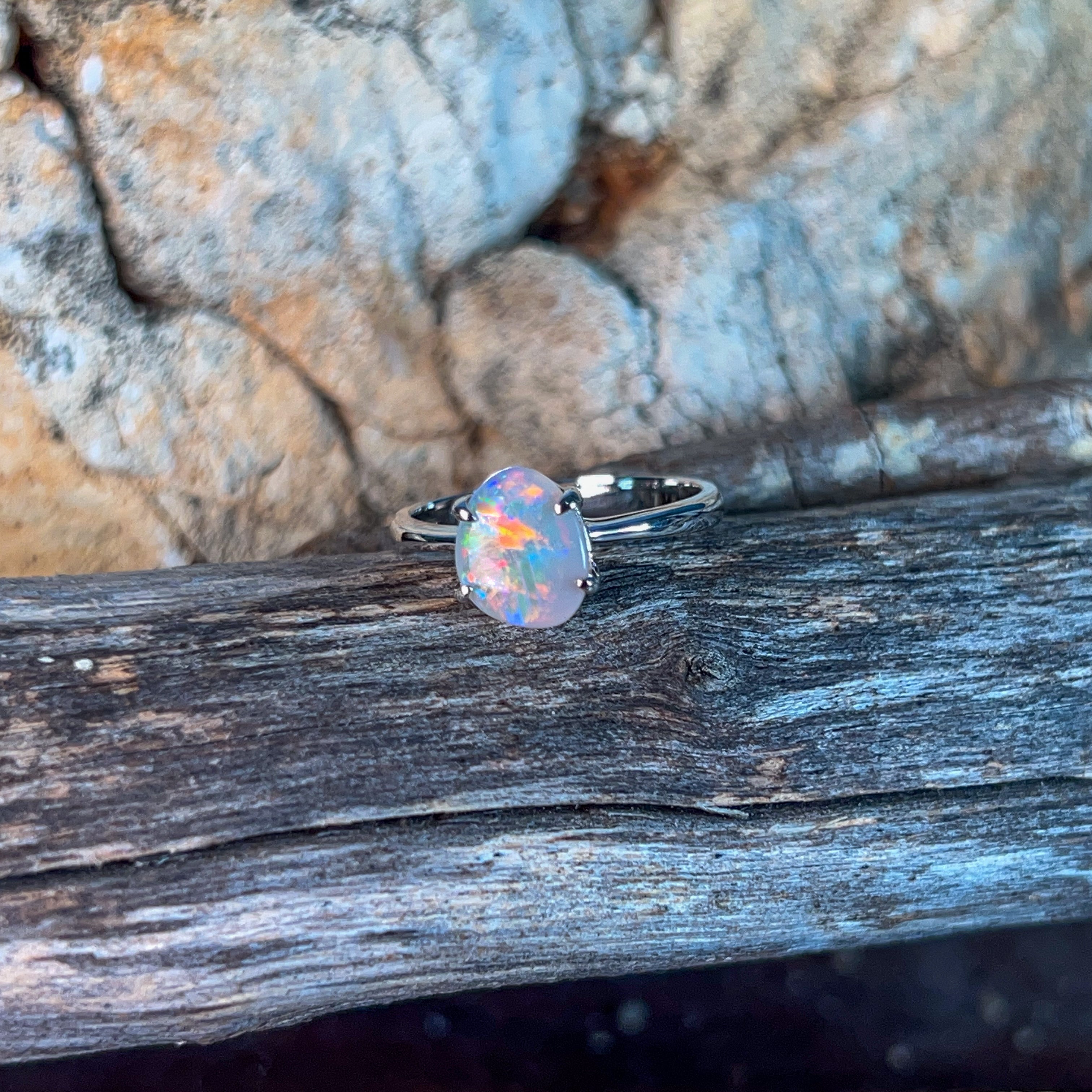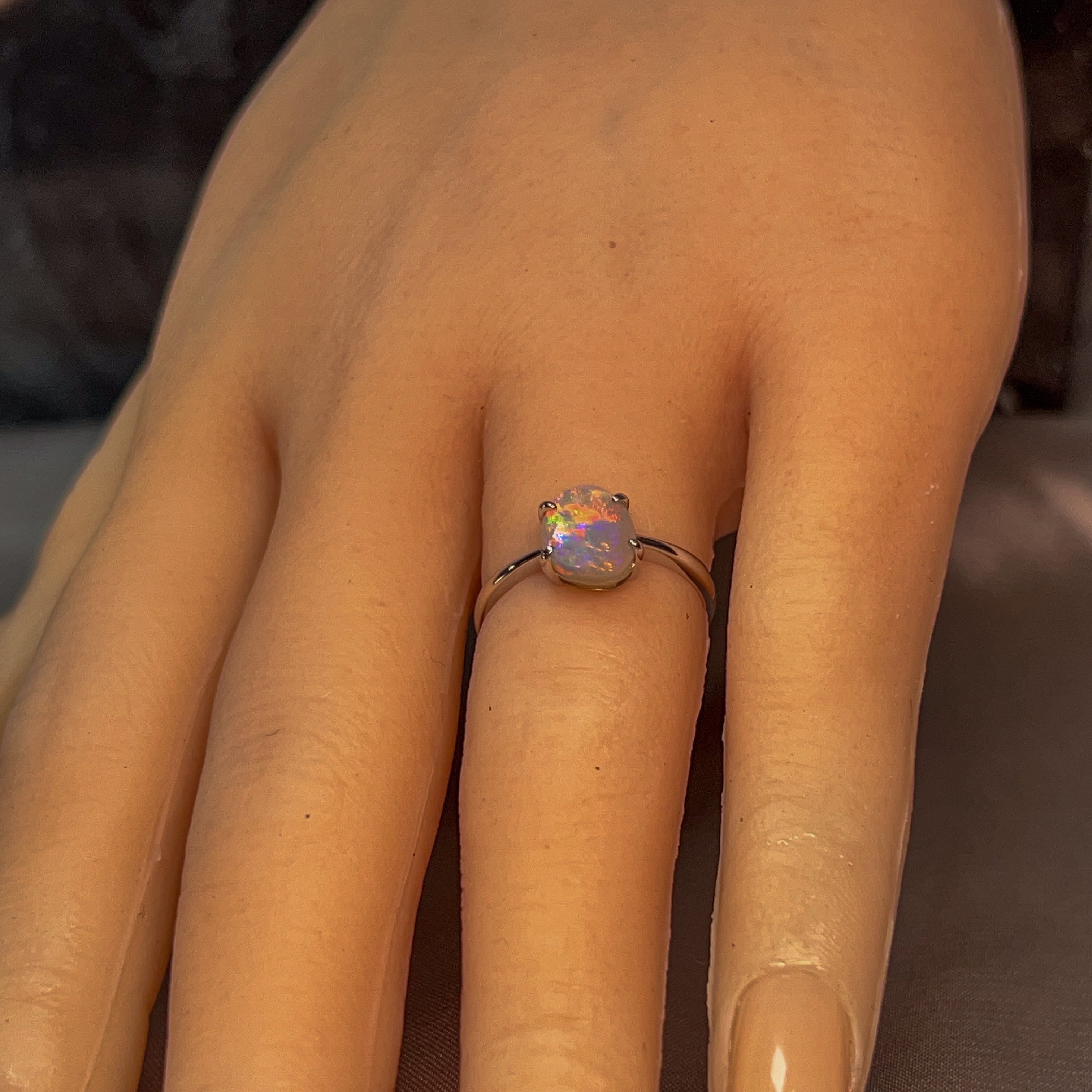 Ignite your finger with this stunning 14kt white gold ring, where a mesmerizing black opal takes centre stage. Watch as fiery reds, oranges, and golden yellows dance across the stone's surface, creating a spectacular light show with every movement. The cool elegance of white gold perfectly frames the opal's warm, vibrant hues, making this 1ct beauty a true showstopper. Perfect for those who dare to wear nature's most dazzling gemstone.