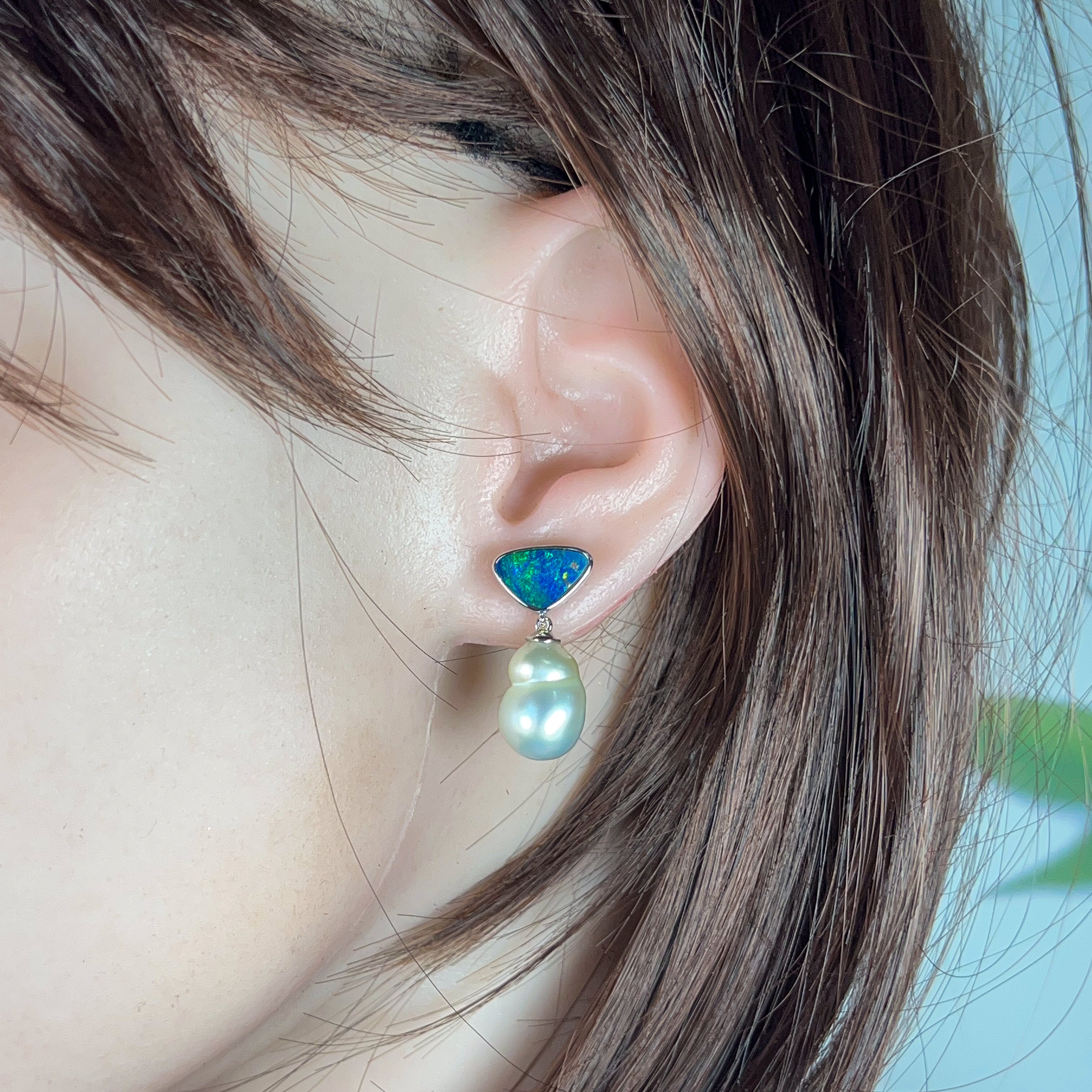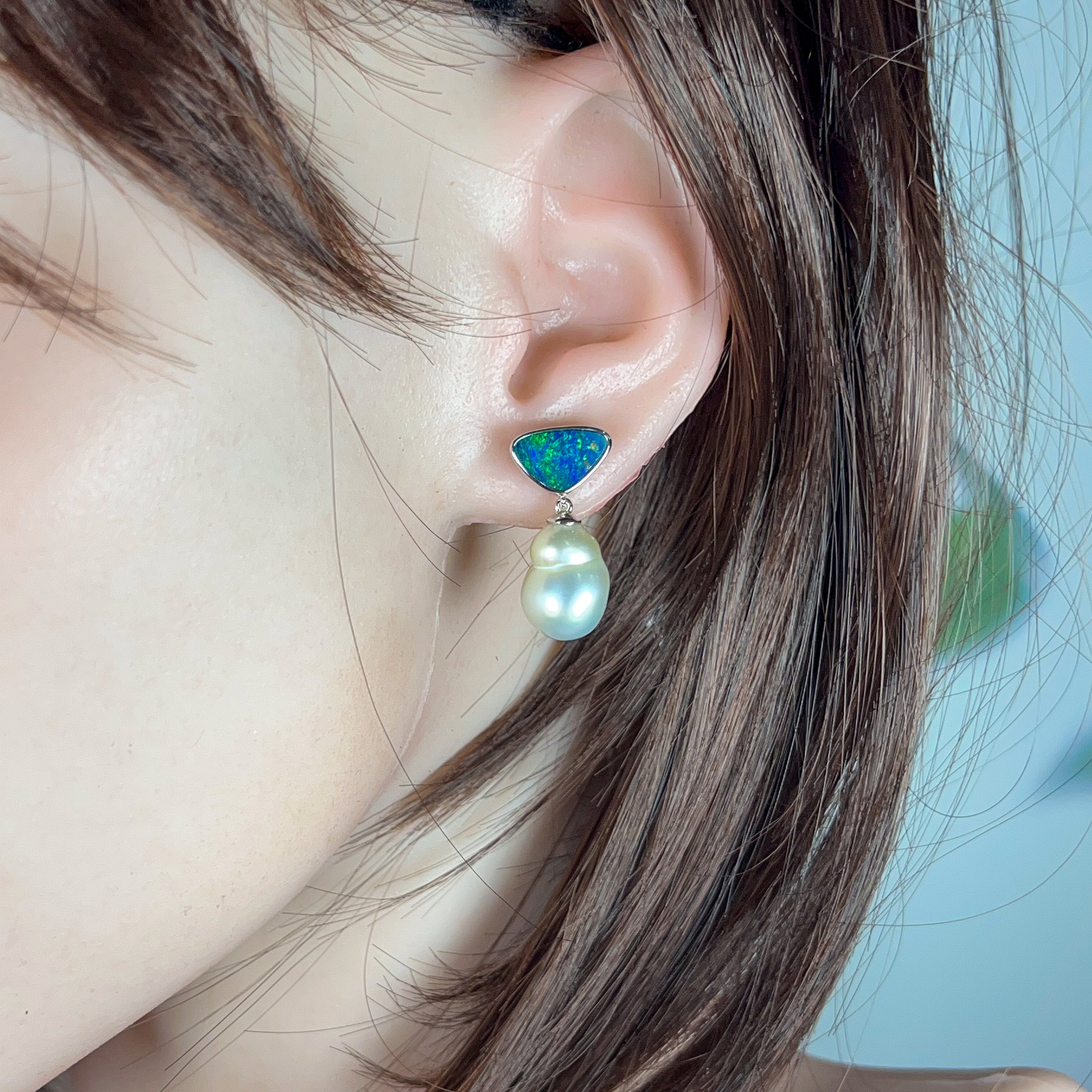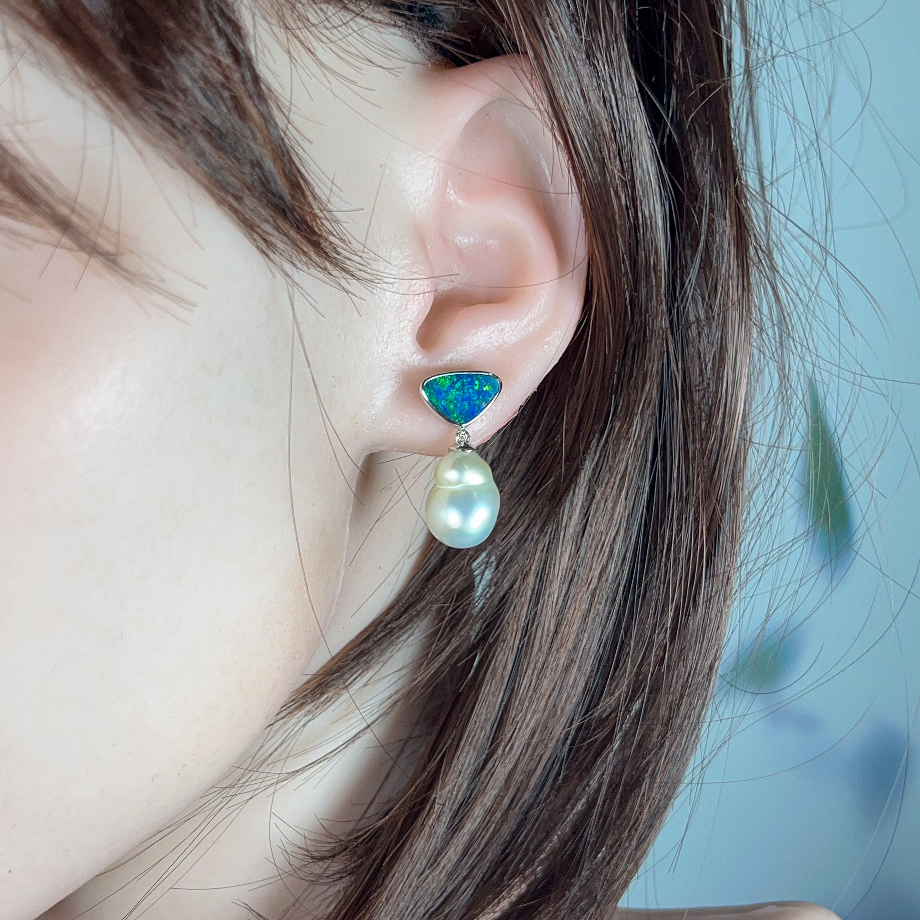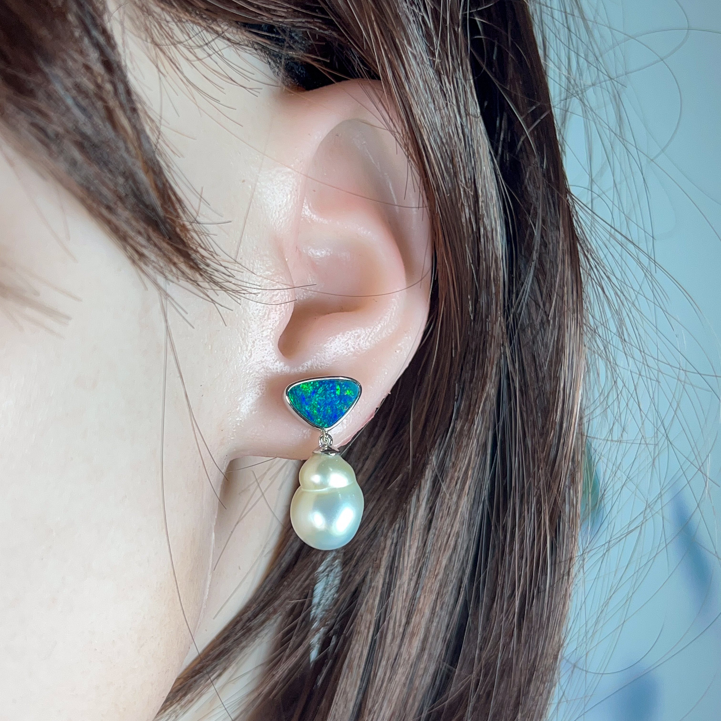 14kt White Gold South Sea Pearl and Opal dangling earrings