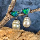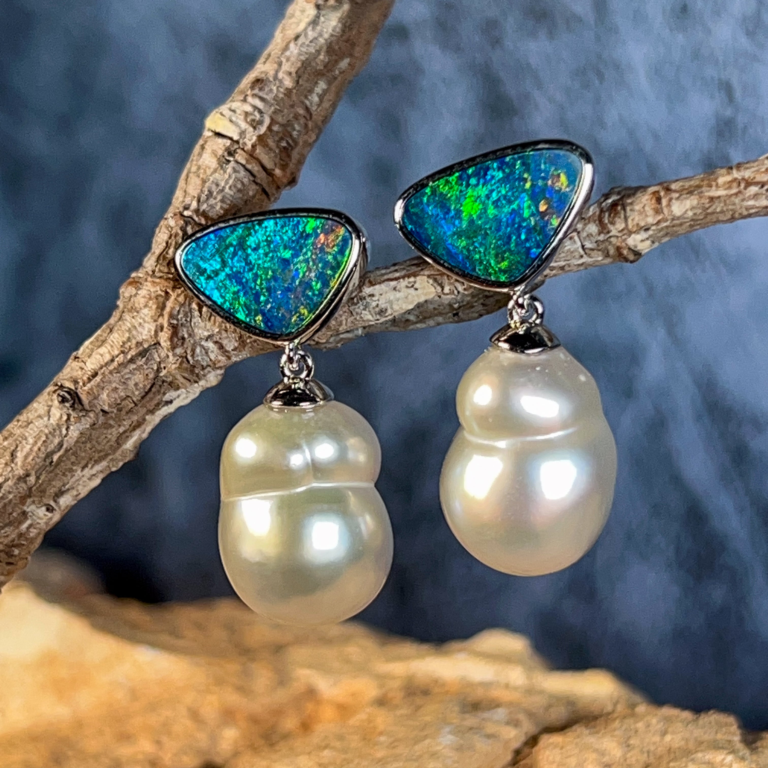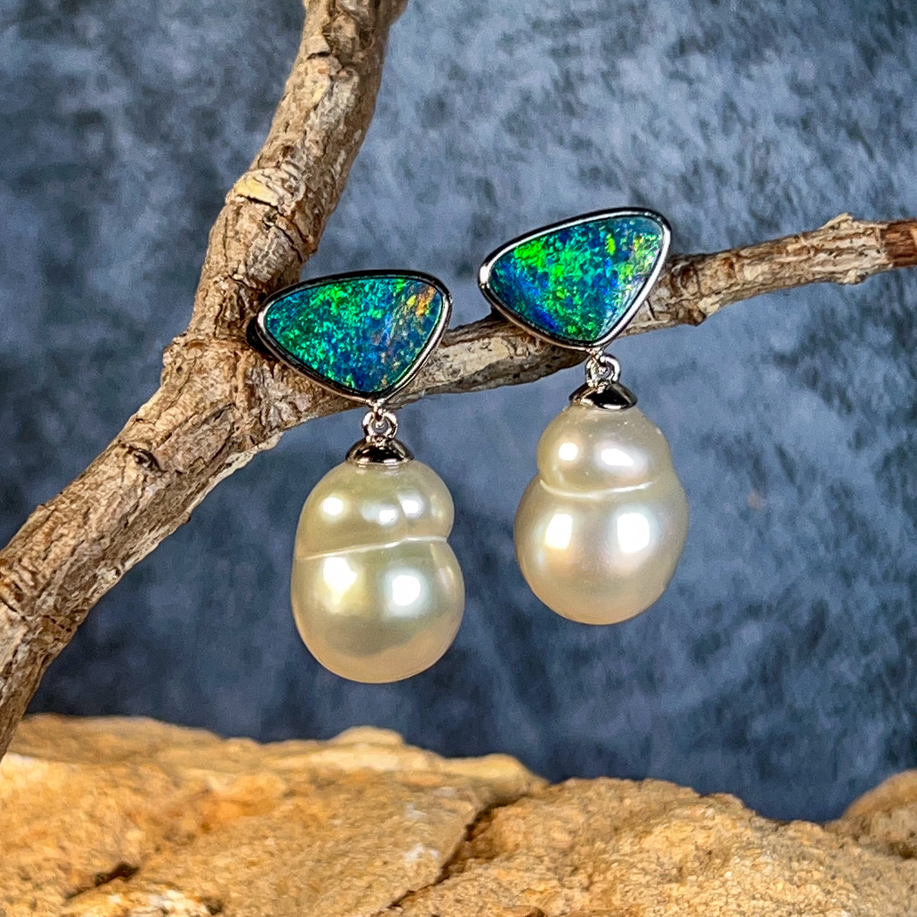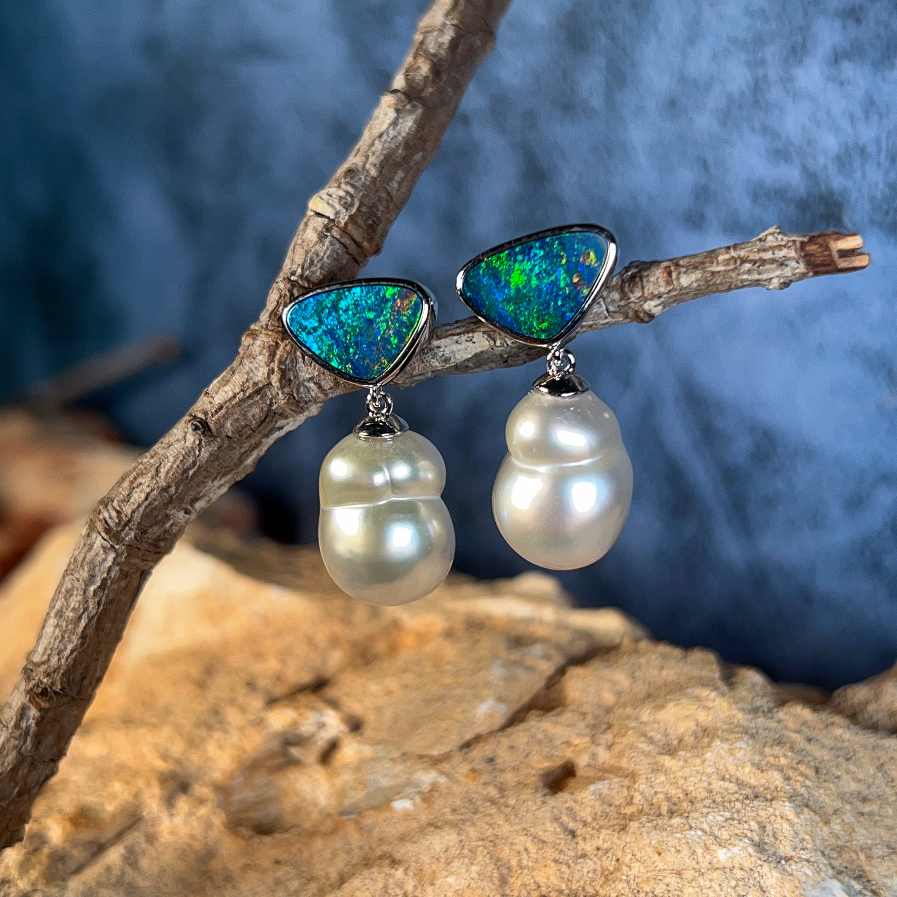 14kt White Gold South Sea Pearl and Opal dangling earrings