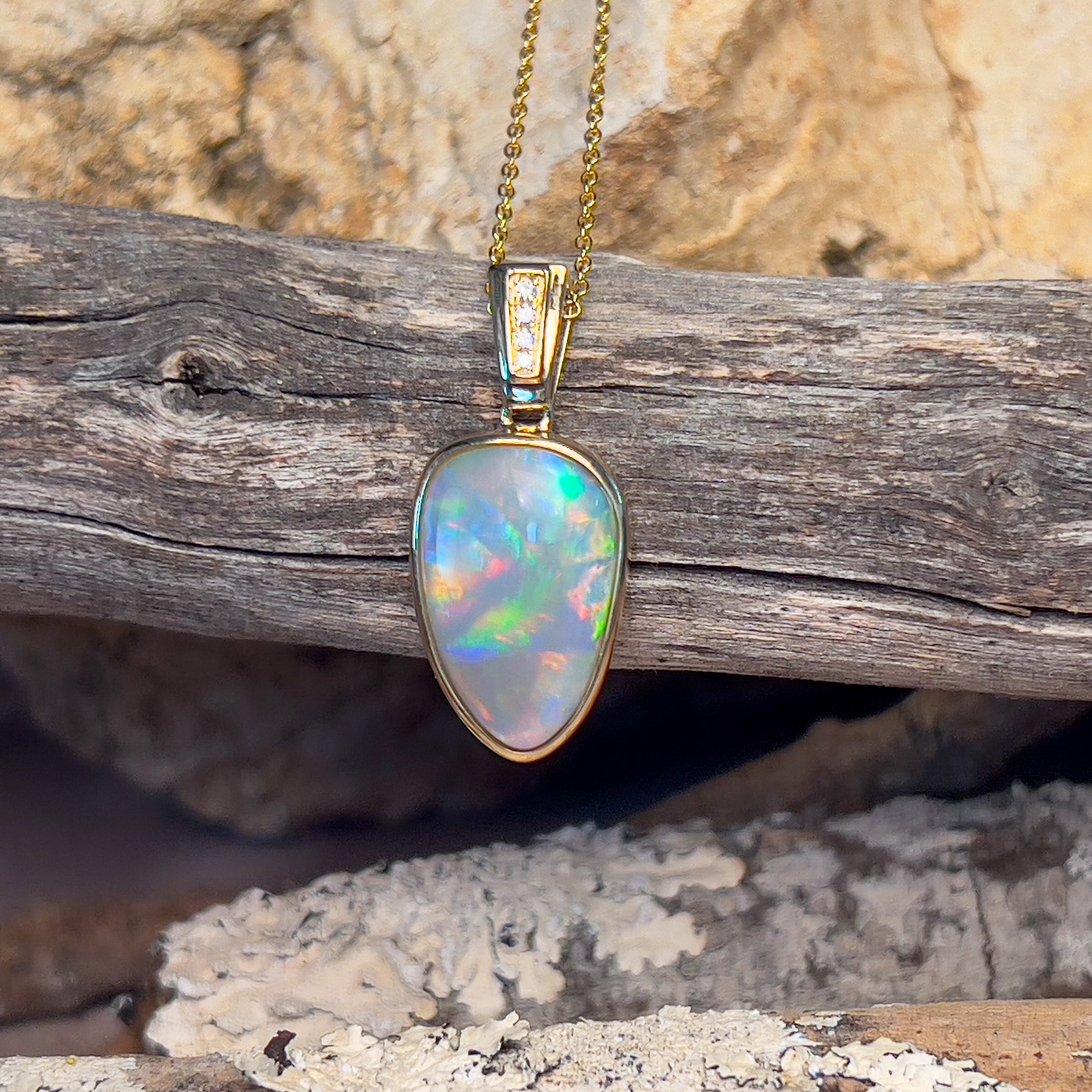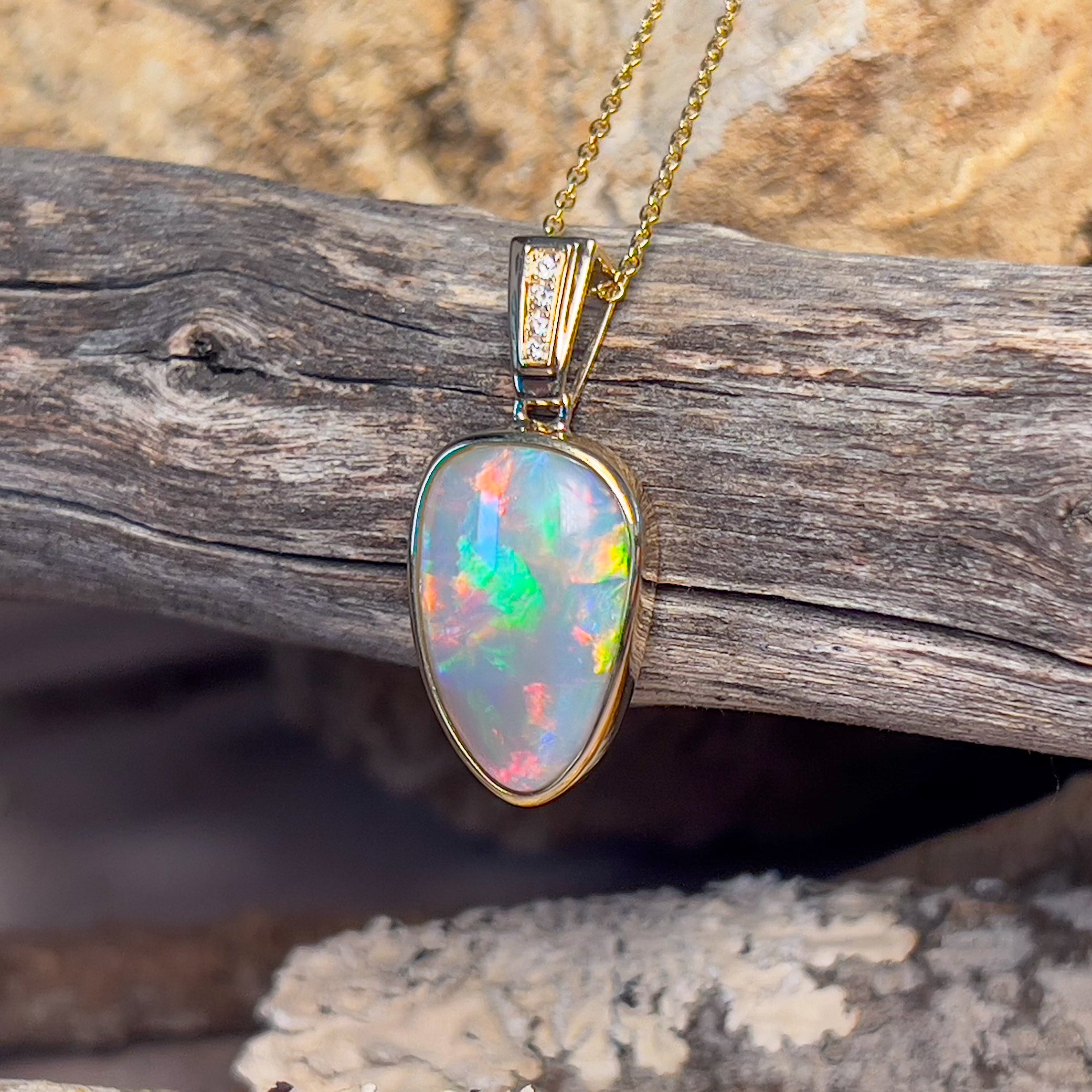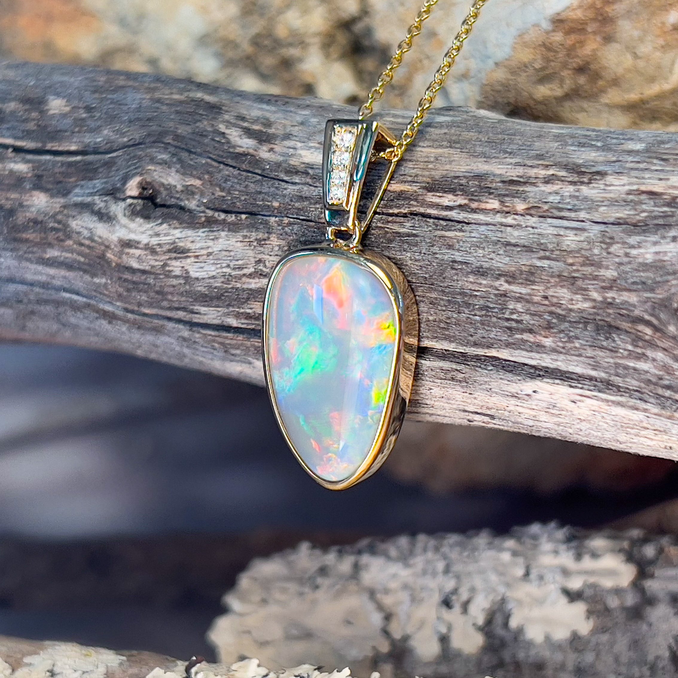 Discover the unique beauty of our 14kt Yellow Gold Black Opal pendant. With its triangular shape and stunning black opal, this necklace is the perfect gift for any occasion. Sparkling diamonds add extra elegance and make it a must-have for any jewelry collection. Get yours today and elevate any outfit with its mesmerizing colors.