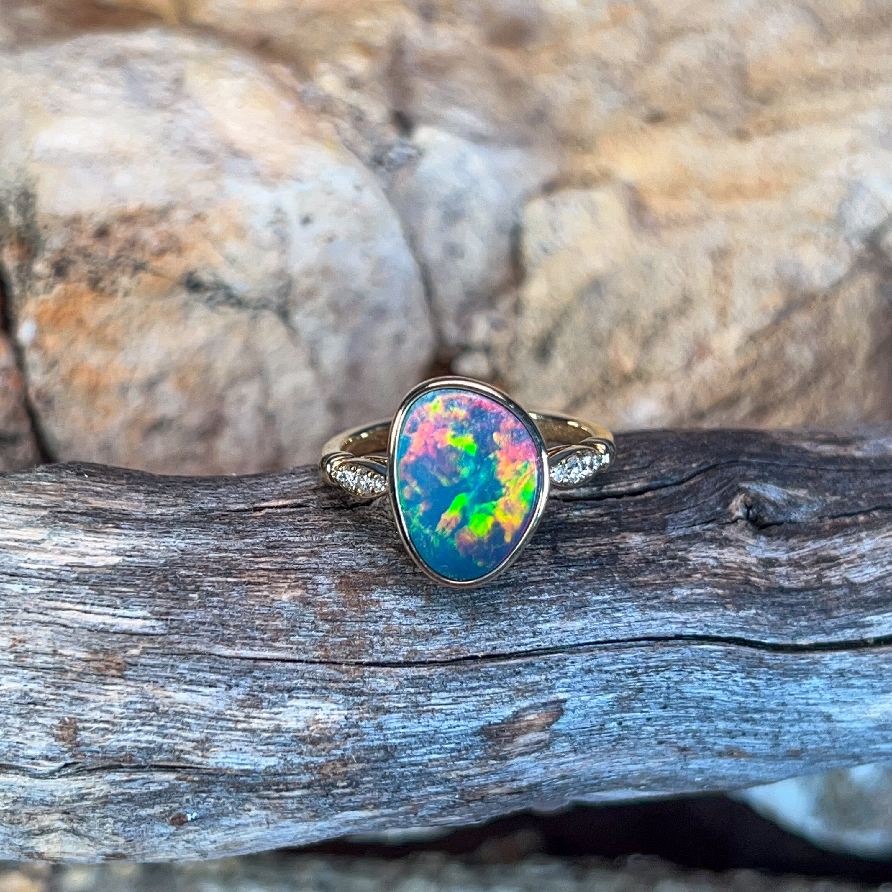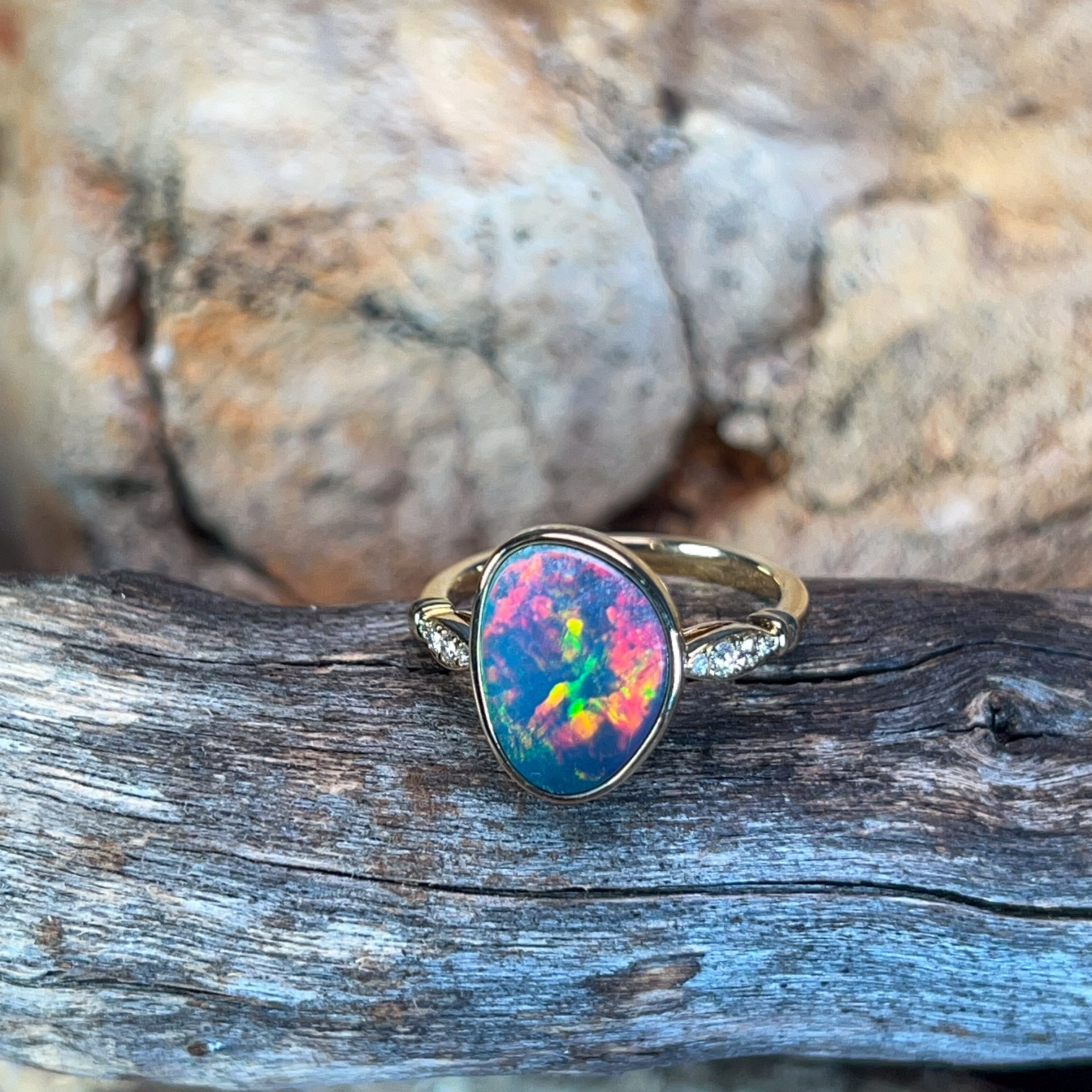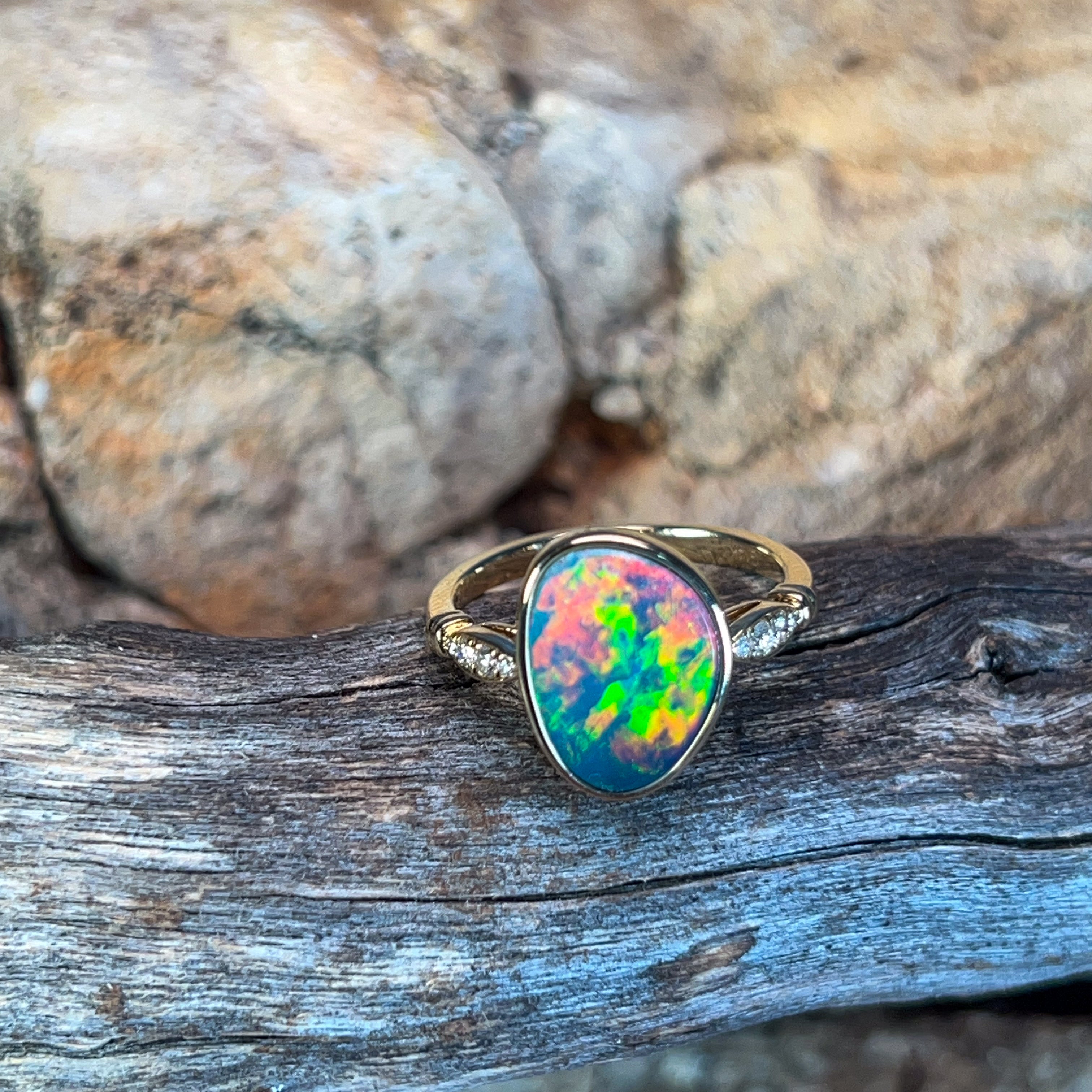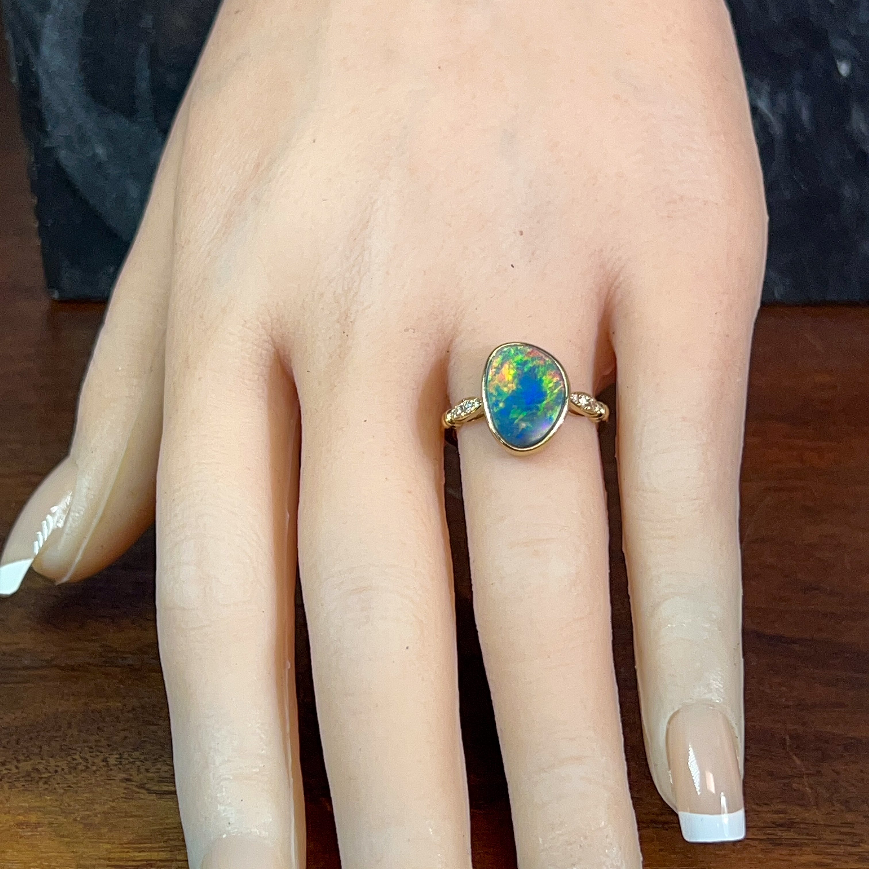14kt Yellow Gold Opal Doublet Ring Captivating flashes of red, yellow, green, and blue dance across this stunning Australian opal doublet. The freeform 2.63ct stone (11.8 x 8.6mm) is bezel set in 14kt yellow gold and surrounded by 8 round brilliant diamonds (0.1ct total, F colour, VS clarity) that amplify its natural fire. A sophisticated piece weighing 3.1g, sized N1/2.