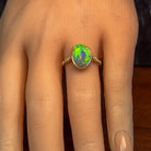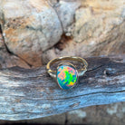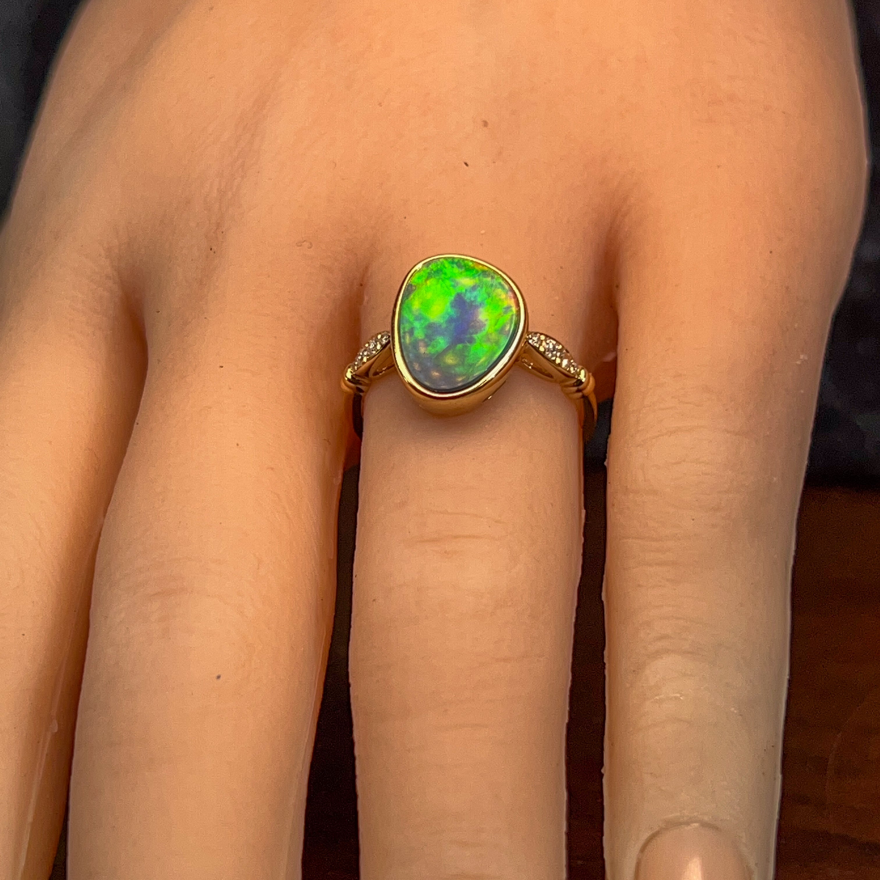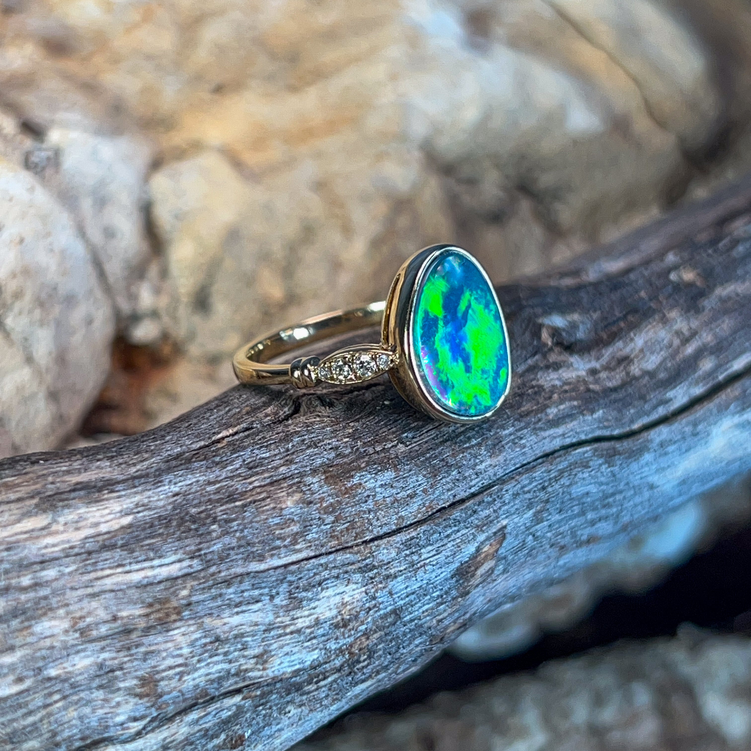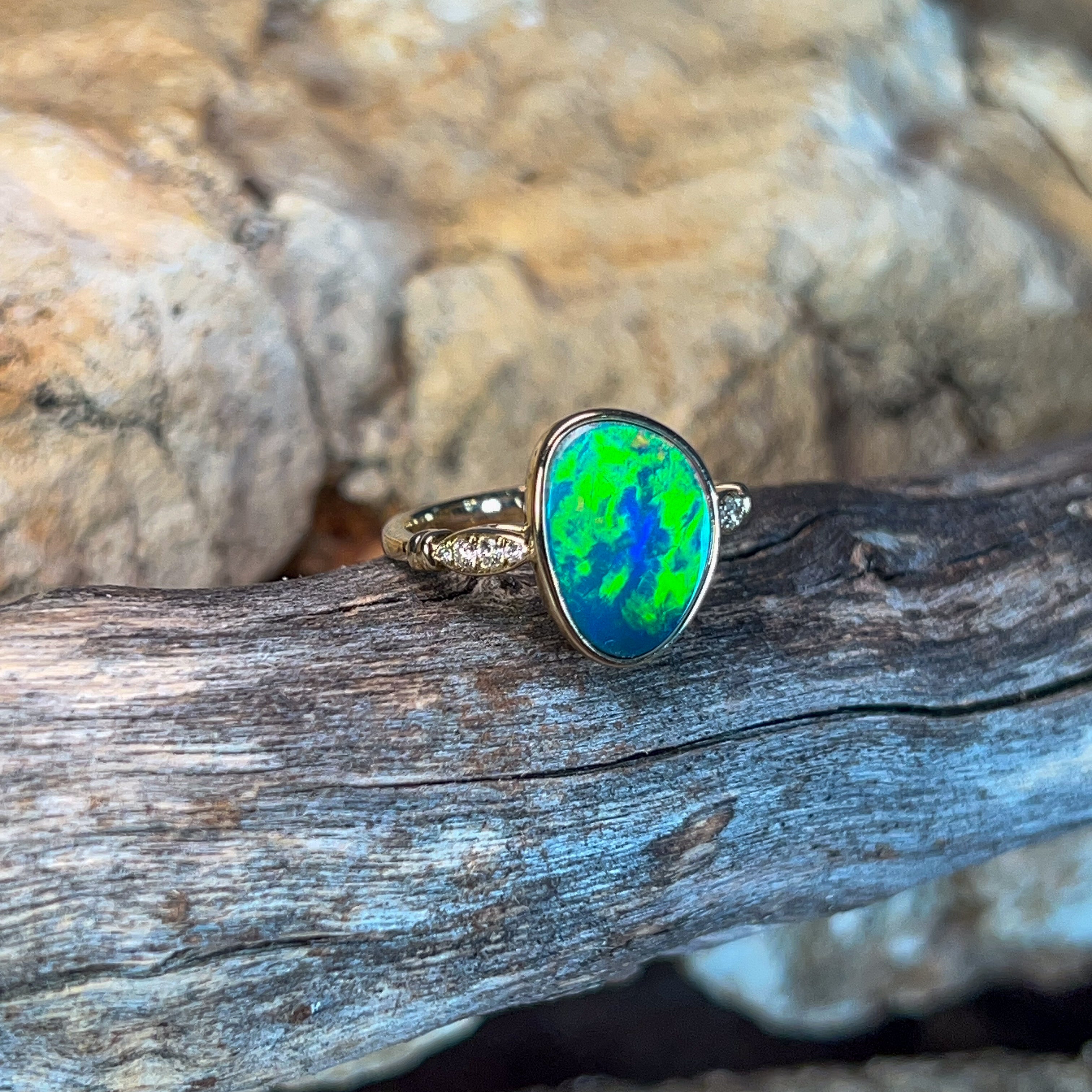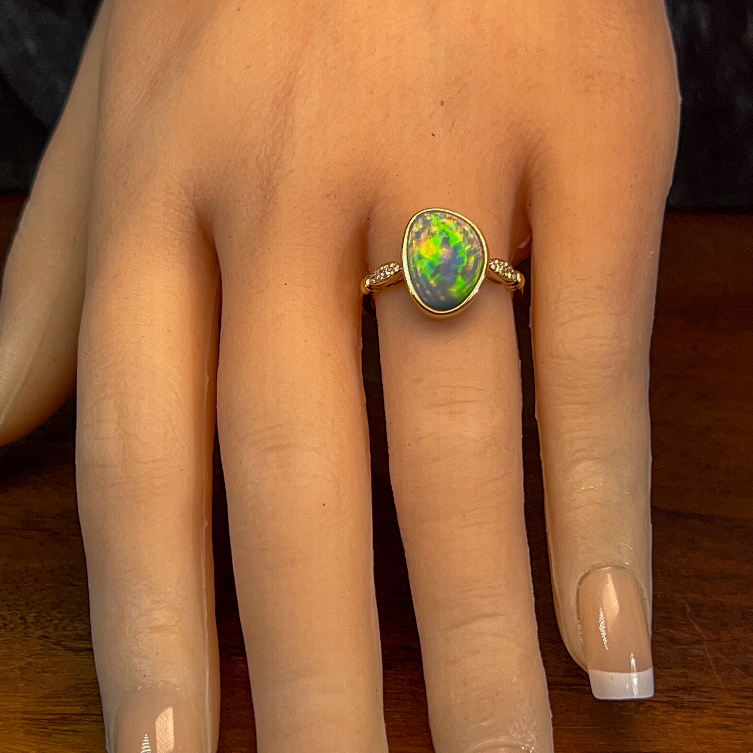 14kt Yellow Gold Opal Doublet Ring Captivating flashes of red, yellow, green, and blue dance across this stunning Australian opal doublet. The freeform 2.63ct stone (11.8 x 8.6mm) is bezel set in 14kt yellow gold and surrounded by 8 round brilliant diamonds (0.1ct total, F colour, VS clarity) that amplify its natural fire. A sophisticated piece weighing 3.1g, sized N1/2.