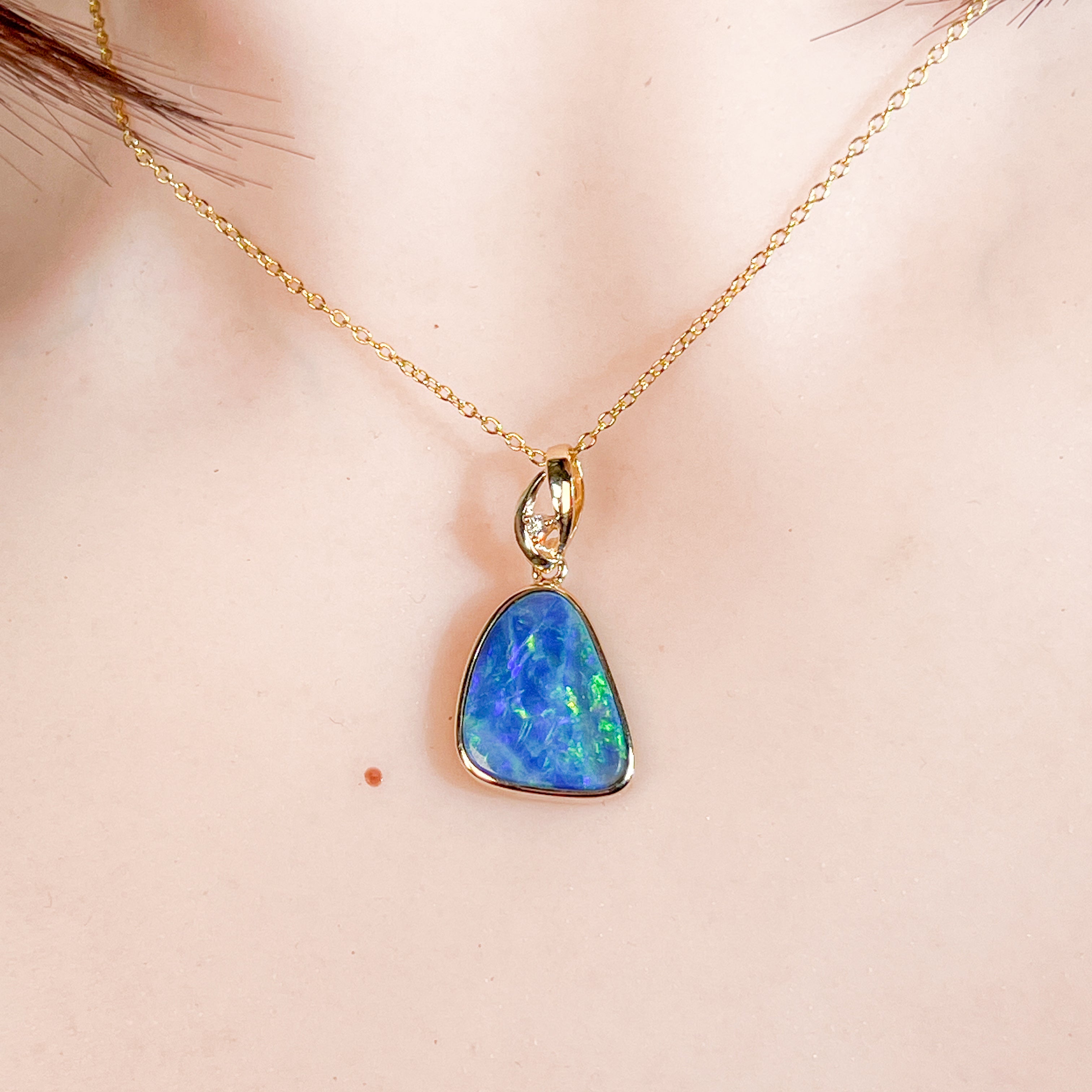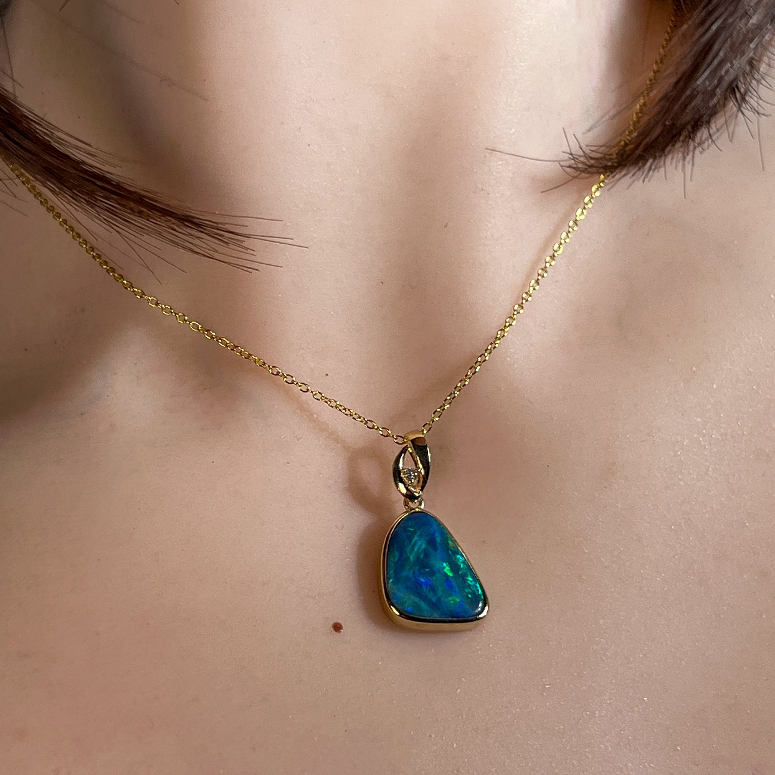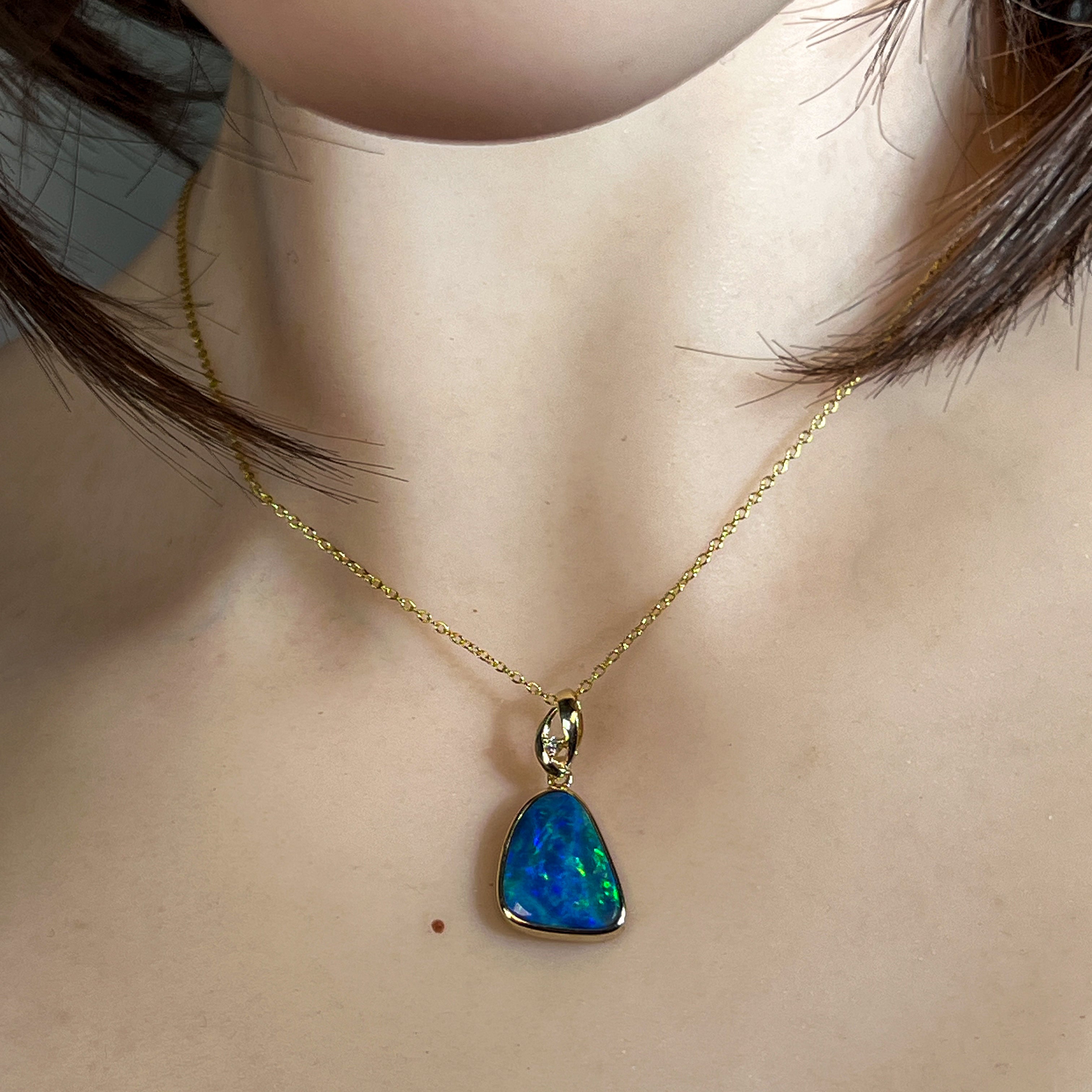 14kt Yellow Gold Opal Doublet Pendant Capture the essence of the ocean with this stunning Australian opal pendant. The freeform doublet opal showcases mesmerising blue and green hues, complemented by flashes of red and yellow that dance across its surface. Set in warm 14kt yellow gold with a classic bezel setting, this piece combines timeless elegance with natural beauty. The 4.4ct opal (17x13mm) is accented with a brilliant diamond (0.02ct, F, VS1) for added sparkle. At just 2.54g and measuring 27x14mm, it's the perfect size for everyday wear or special occasions.