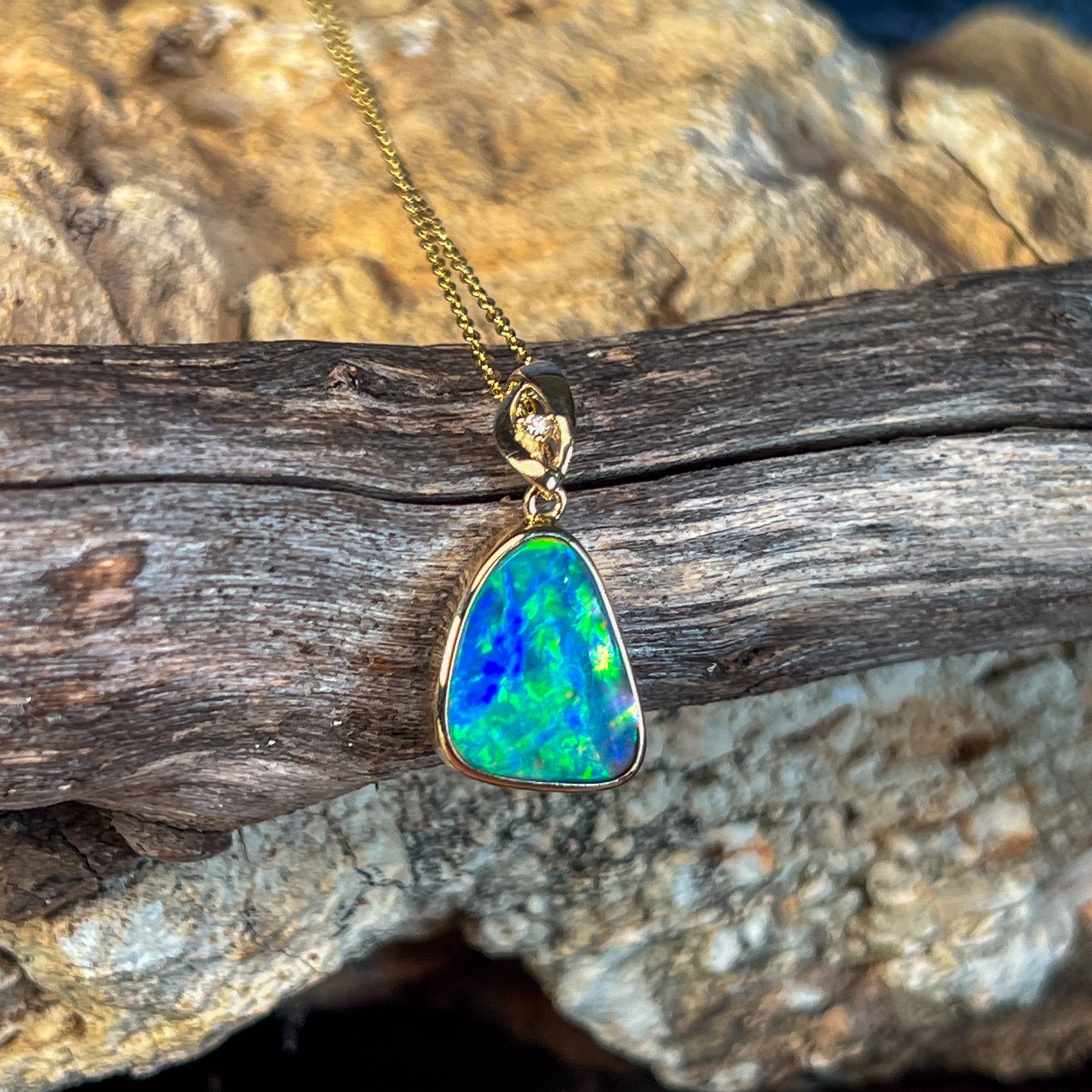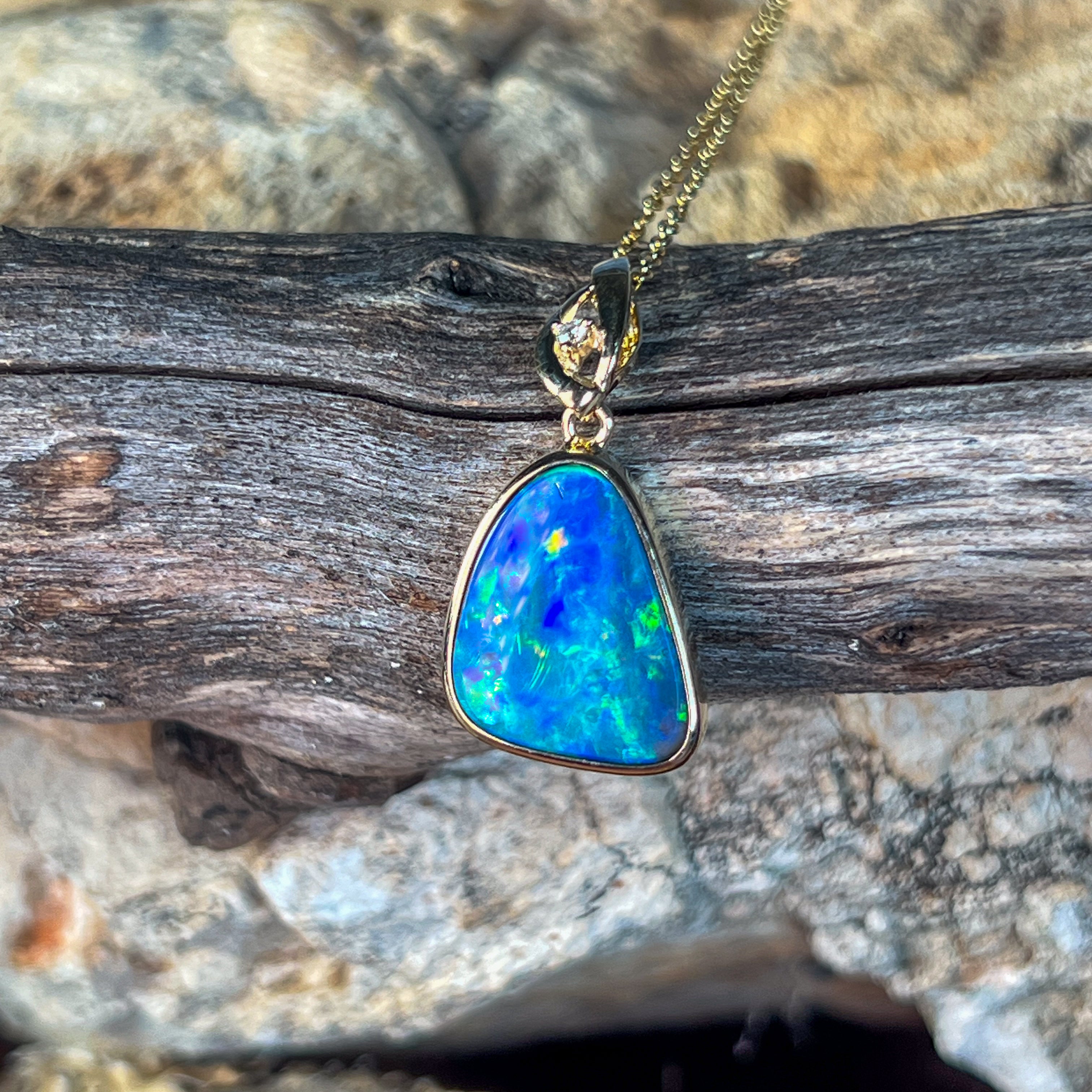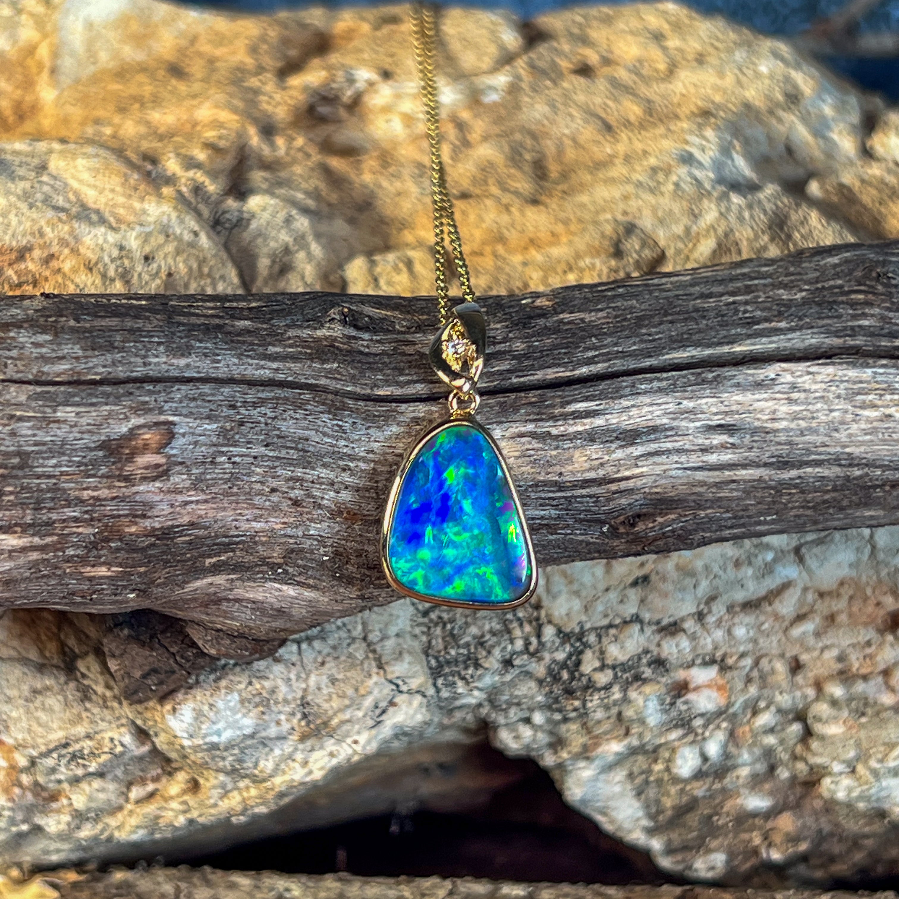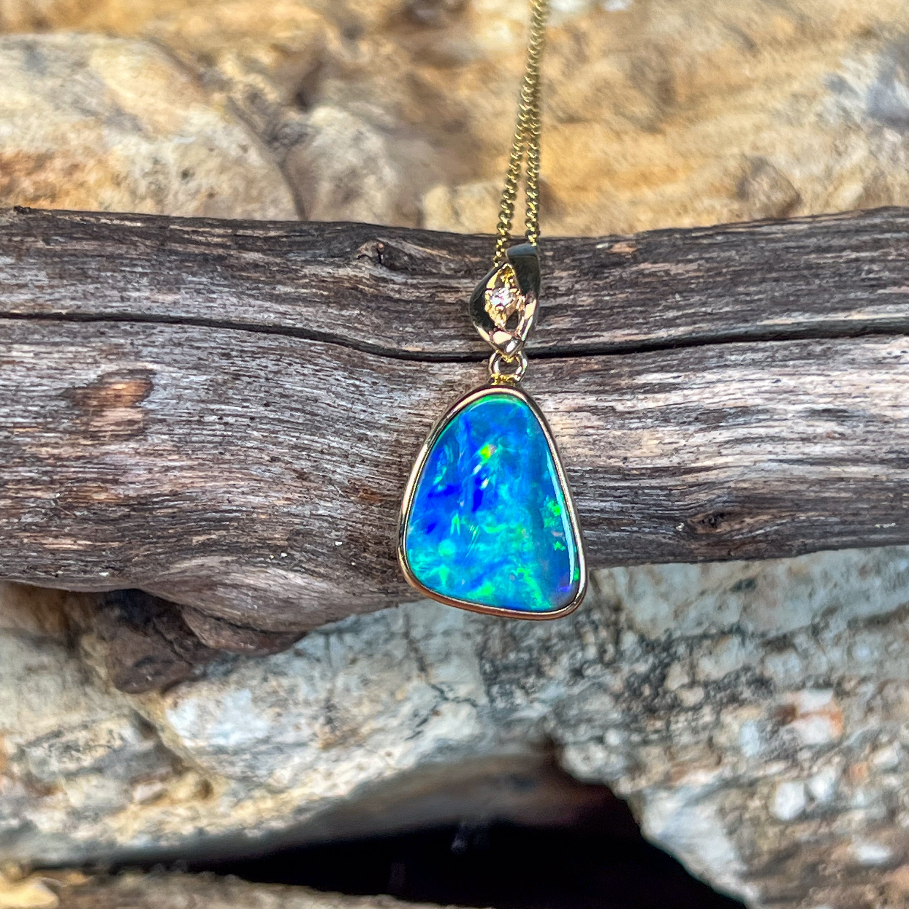 14kt Yellow Gold Opal Doublet Pendant Capture the essence of the ocean with this stunning Australian opal pendant. The freeform doublet opal showcases mesmerising blue and green hues, complemented by flashes of red and yellow that dance across its surface. Set in warm 14kt yellow gold with a classic bezel setting, this piece combines timeless elegance with natural beauty. The 4.4ct opal (17x13mm) is accented with a brilliant diamond (0.02ct, F, VS1) for added sparkle. At just 2.54g and measuring 27x14mm, it's the perfect size for everyday wear or special occasions.