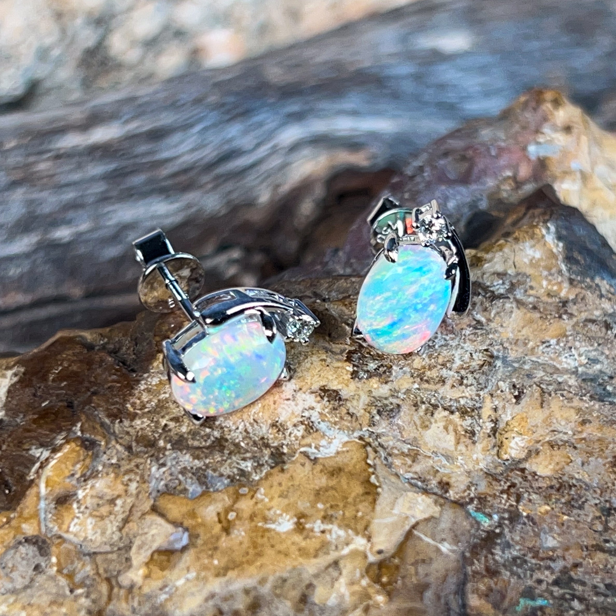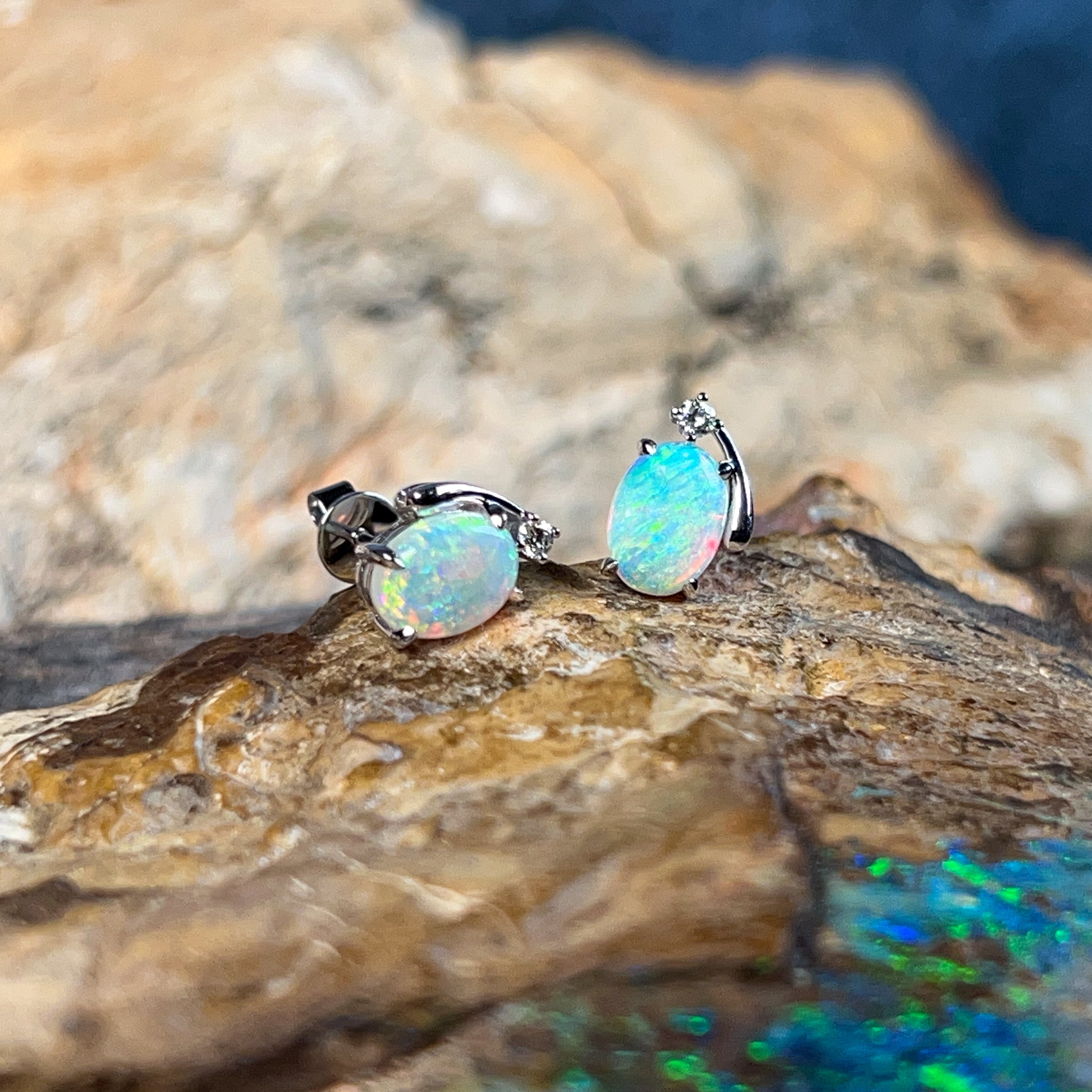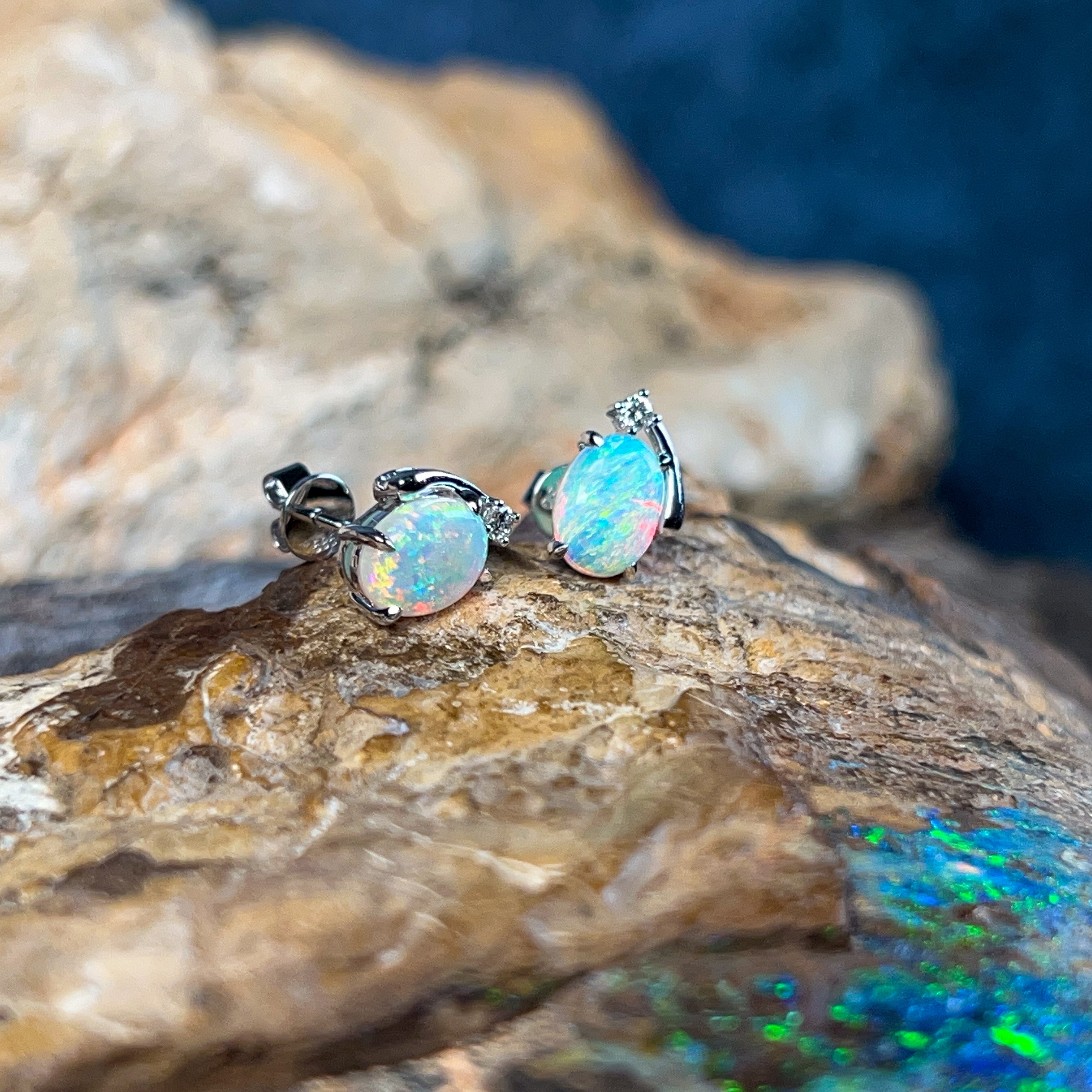 Sparkle with joy in these delightful 18kt white gold studs! Each pair features a radiant 8x6mm crystal opal that dances with bright, mesmerizing colours—think fiery reds, vibrant blues, and sunny yellows all swirling together. Framed by shimmering diamonds, these little treasures catch the light beautifully and add a pop of personality to any look. Perfect for opal lovers who want everyday elegance with a cheerful twist.