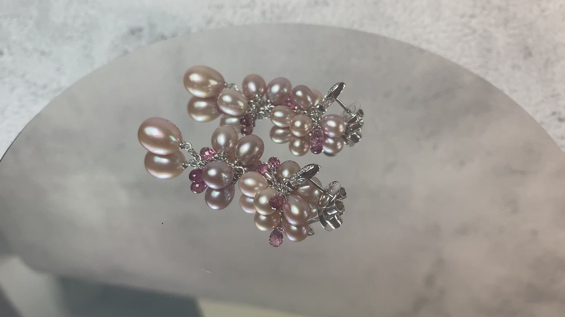 18kt White Gold Pearl, Diamond, Pink Sapphire dangling earrings