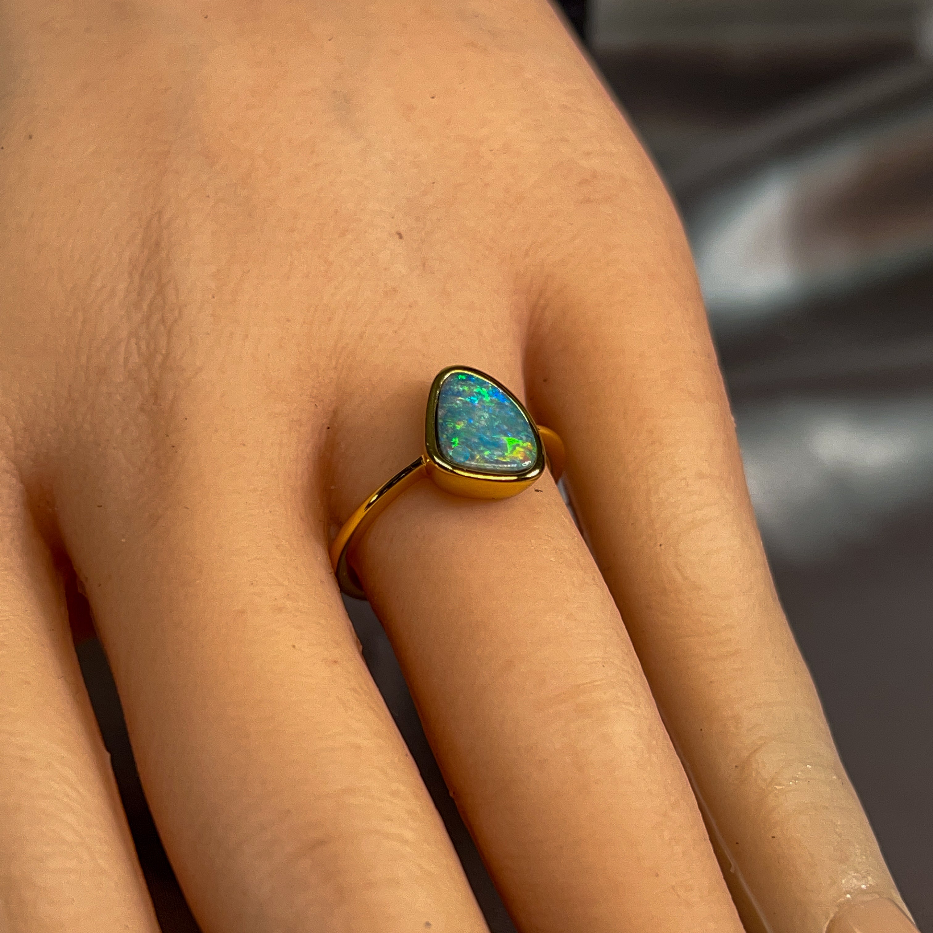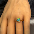 Discover the captivating allure of our Gold Plated Silver Opal Doublet Ring, a stunning piece that brings nature's most enchanting gemstone to your fingertip. This exquisite 10x9mm opal doublet showcases mesmerising green hues that dance with every movement, creating an ever-changing display of colour and light. The precious metal combination of silver with luxurious gold plating offers both elegance and durability, making it perfect for everyday wear or special occasions. Whether you're drawn to opals for their legendary beauty or seeking a unique statement piece, this ring delivers timeless sophistication. Elevate your jewellery collection with a gemstone that's as individual and captivating as you are.