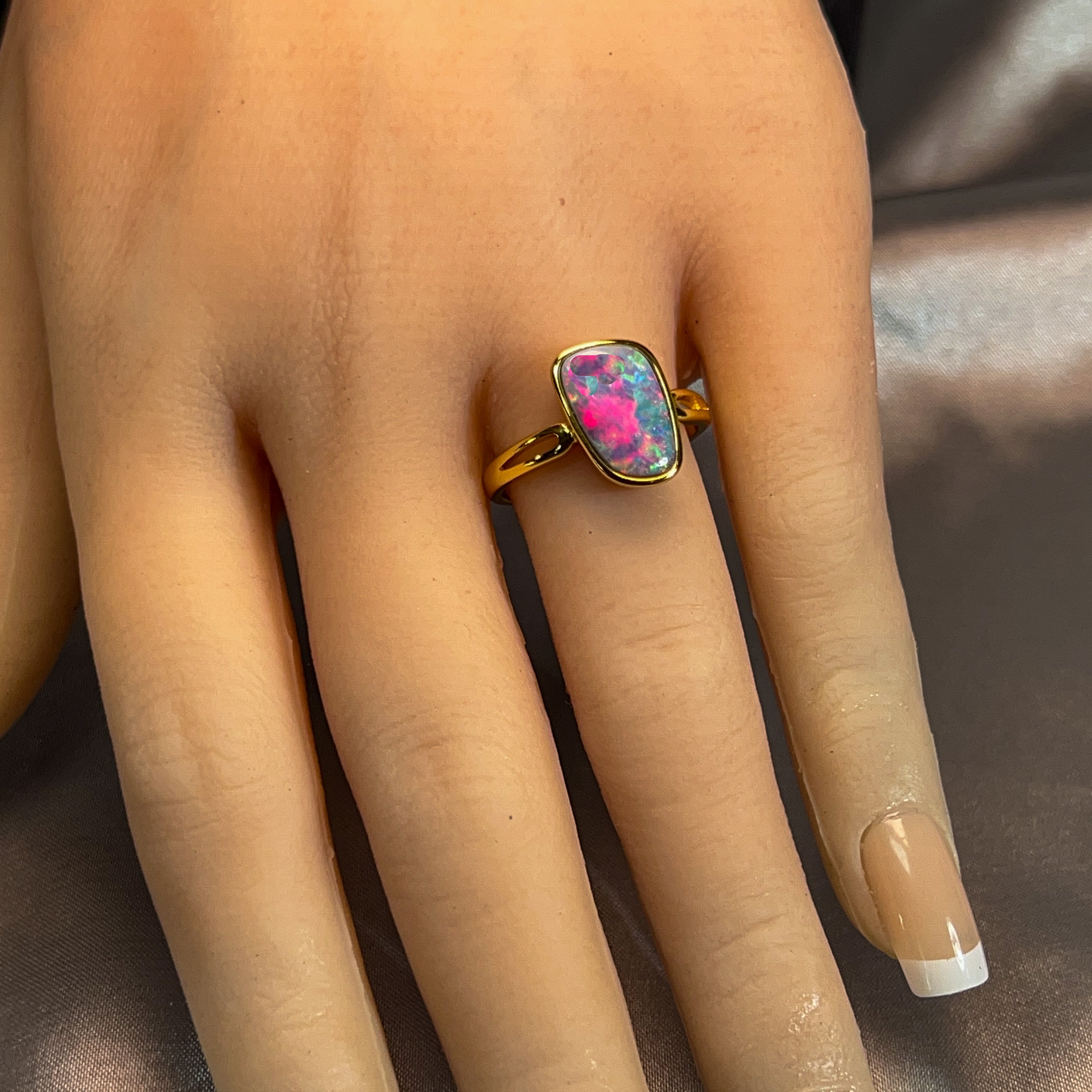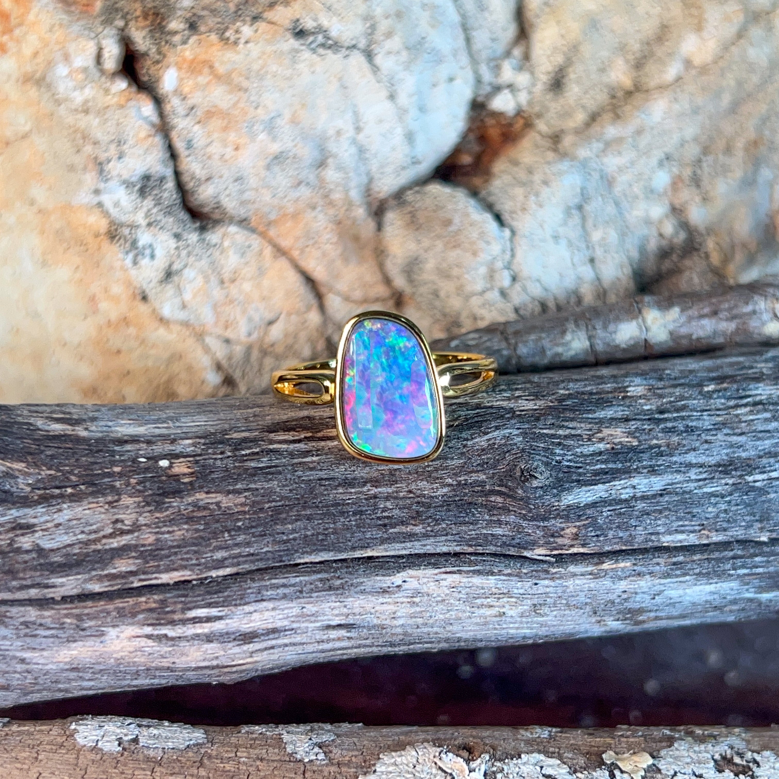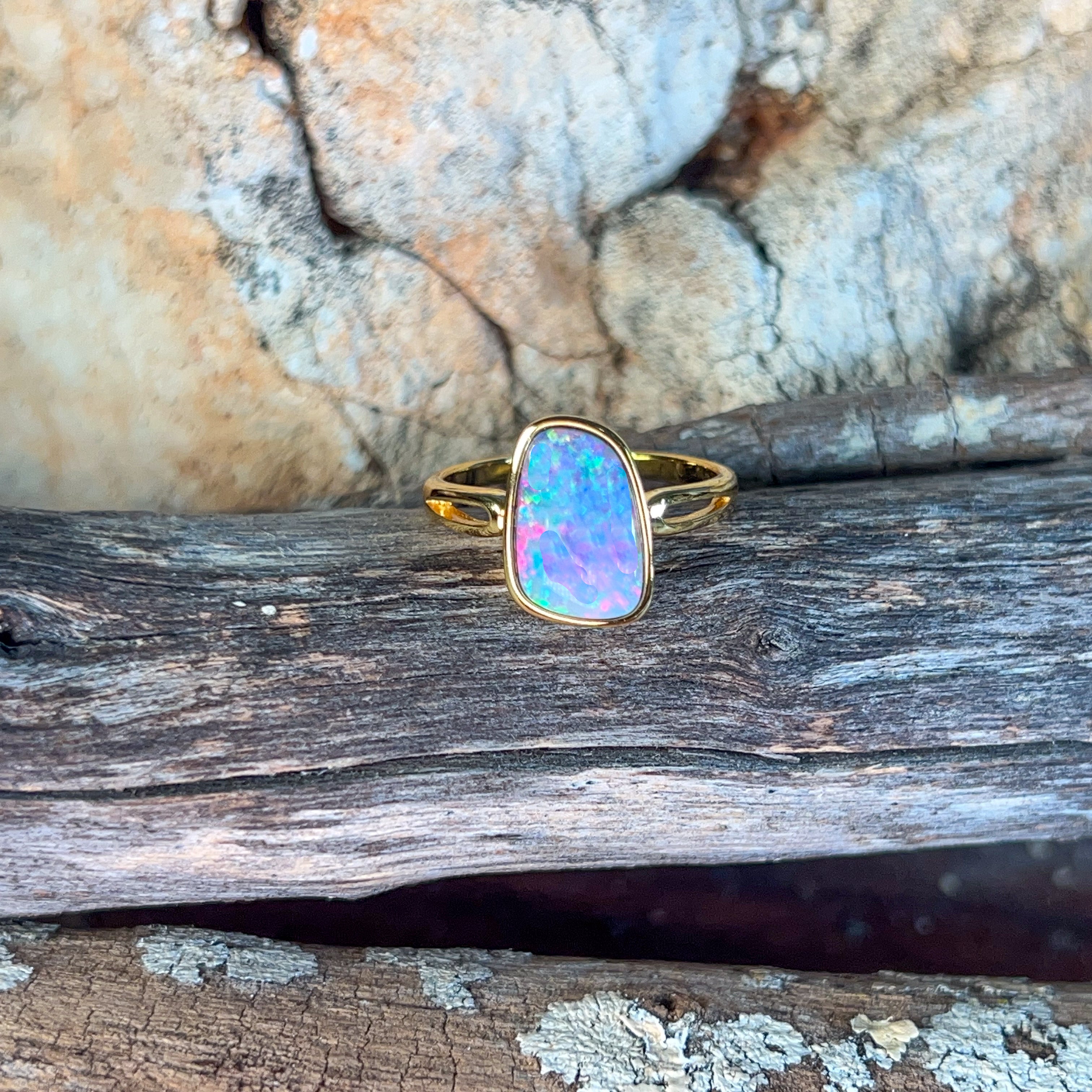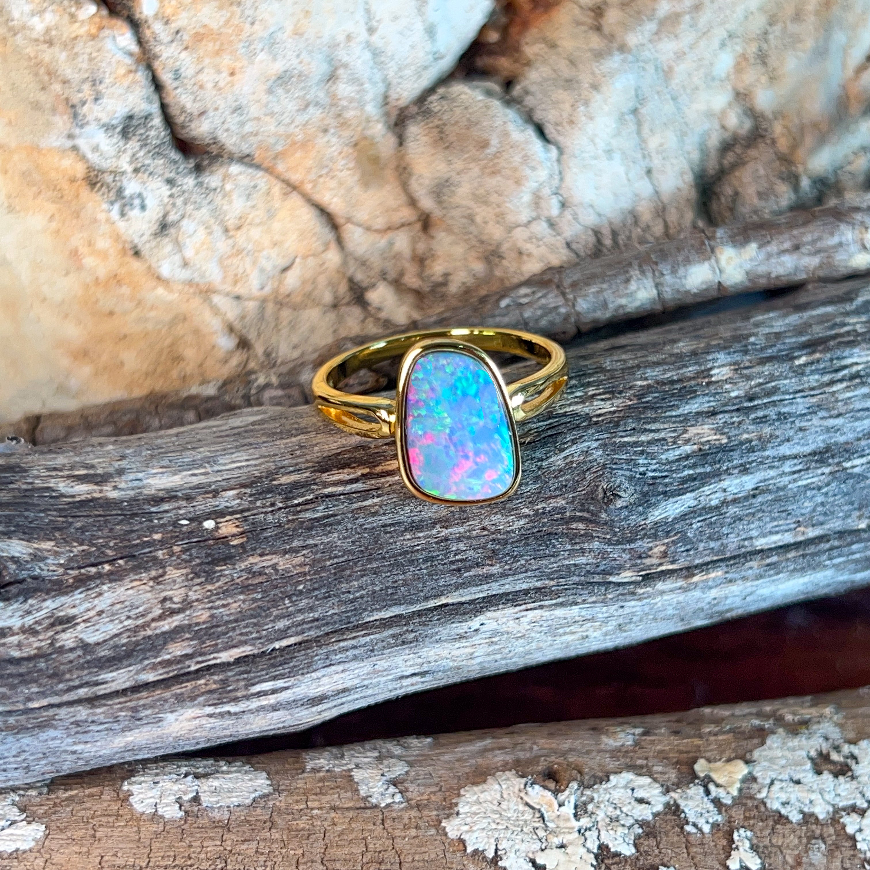 Elevate your everyday elegance with this stunning solitaire ring, featuring a captivating 19x9mm opal doublet set in gold-plated silver. The play-of-colour in the opal creates a mesmerising focal point that catches light beautifully, making it perfect for those who appreciate understated sophistication. This versatile piece transitions seamlessly from casual wear to special occasions, offering timeless appeal without the premium price tag. A true showstopper that lets your natural beauty shine through.
