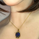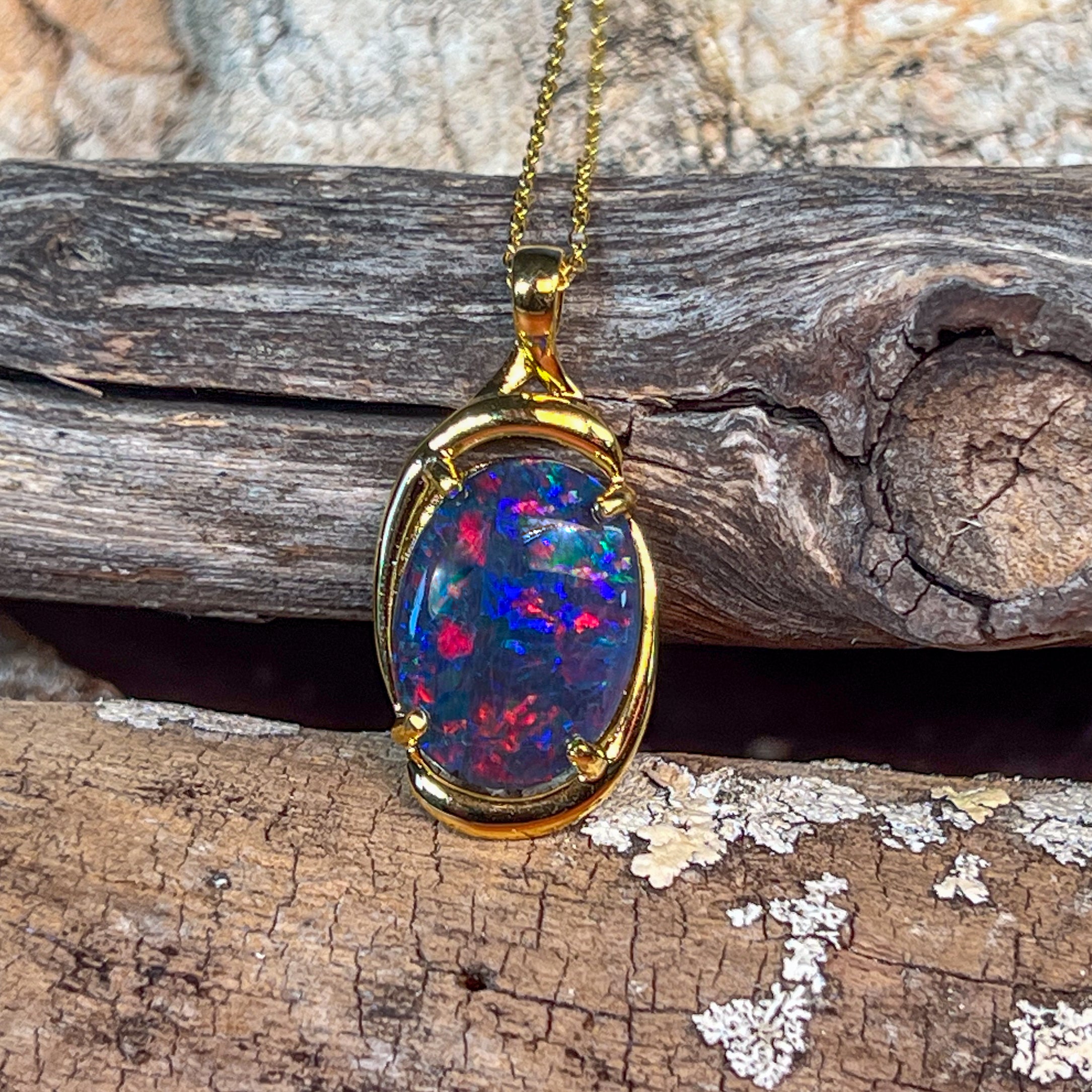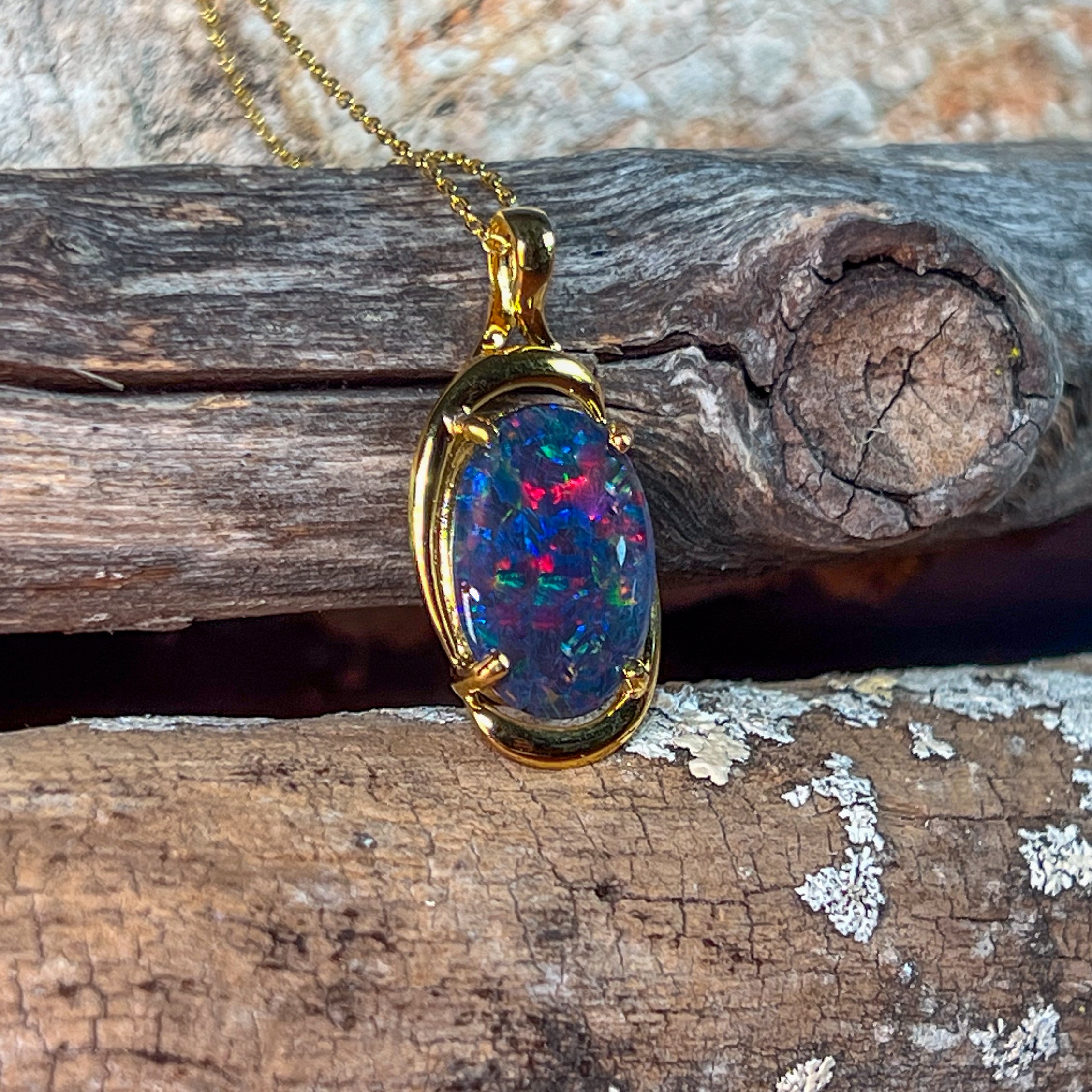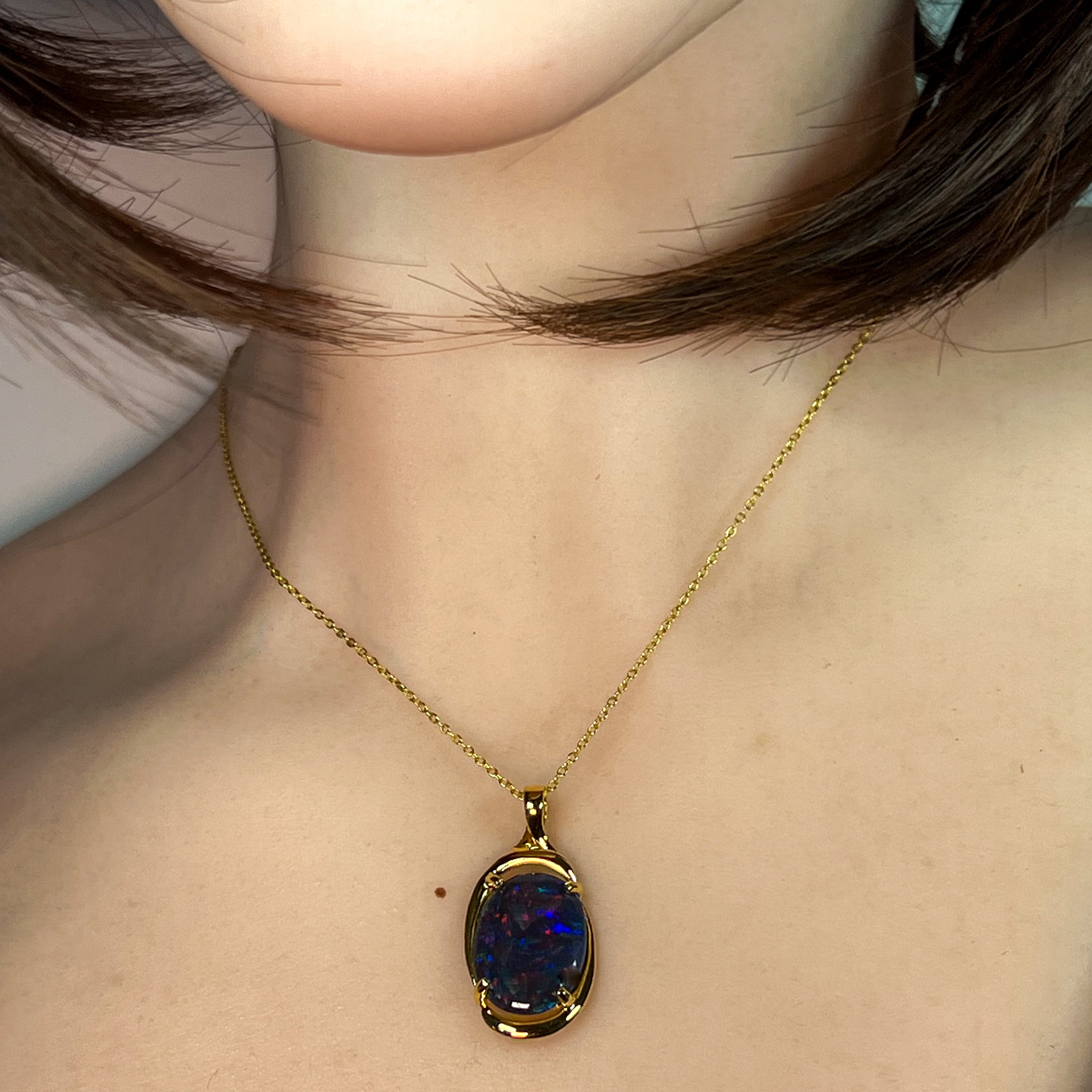 Elevate your style with this large vintage-inspired pendant, featuring an 18x13mm opal triplet set in gold-plated sterling silver. Its rich golden finish beautifully complements the opal's vibrant play of color, making it a standout accessory for any outfit. Perfect to enhance your everyday look or as a unique statement piece for special occasions.