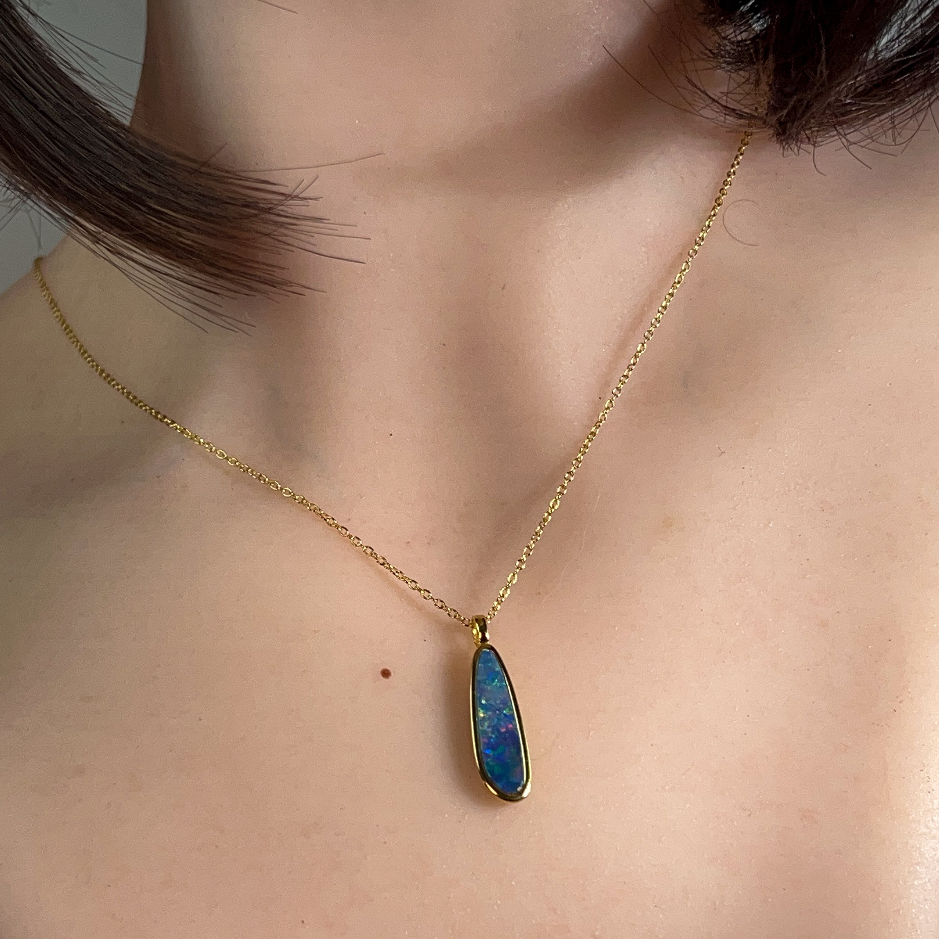 Discover the understated elegance of this striking opal doublet pendant, expertly crafted from sterling silver and finished with luxurious gold plating. Its elongated 21x7mm silhouette creates a graceful, contemporary look that flatters any neckline and pairs effortlessly with both casual and formal wear. The mesmerizing play of colour within the opal doublet catches the light beautifully, drawing admiring glances wherever you go. This versatile piece combines the timeless appeal of genuine opal with the durability and sophistication of quality sterling silver, making it an investment in jewellery that truly stands out. Perfect for those who appreciate refined, minimalist design with maximum visual impact.
